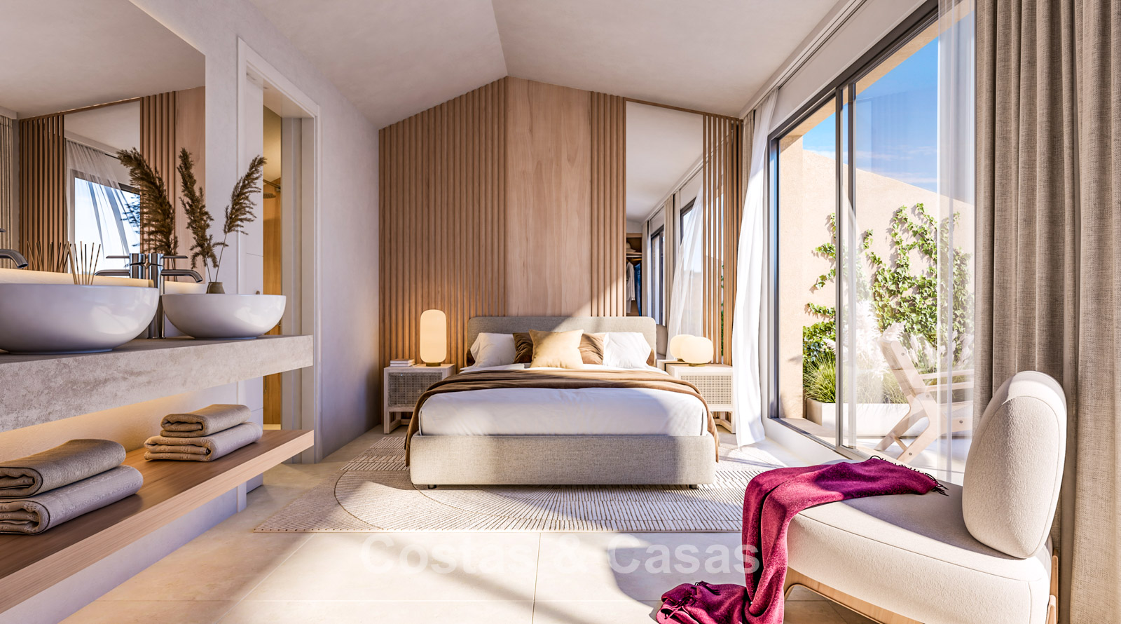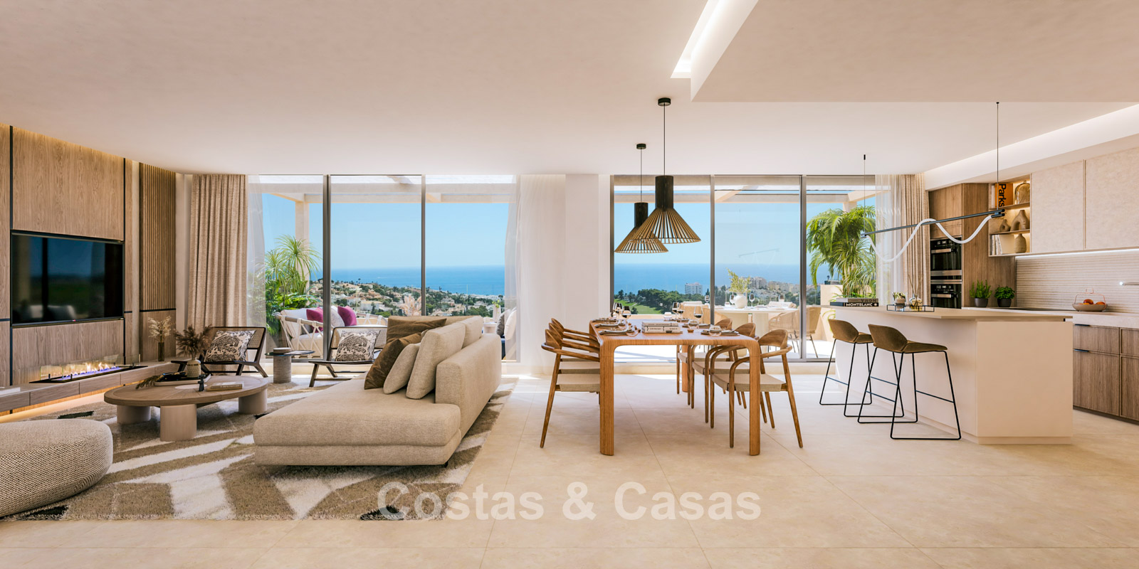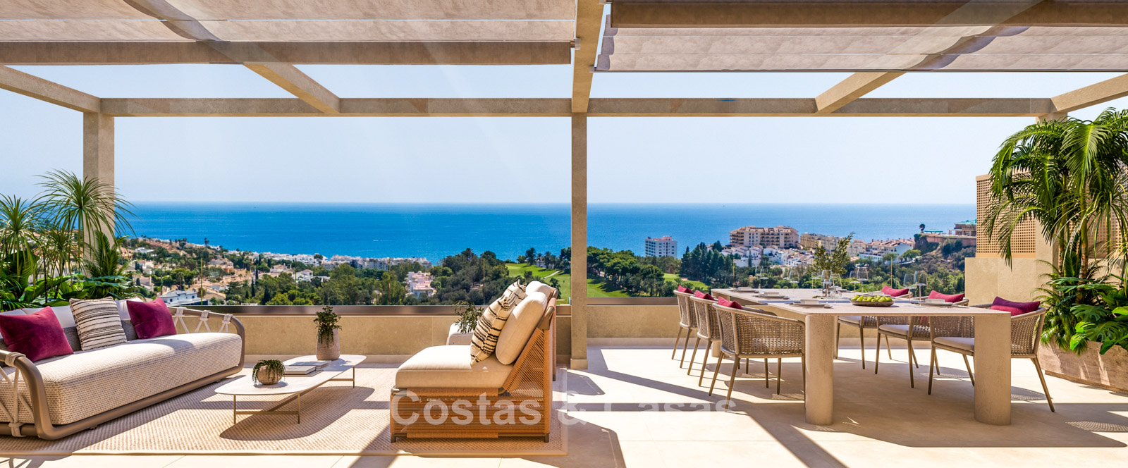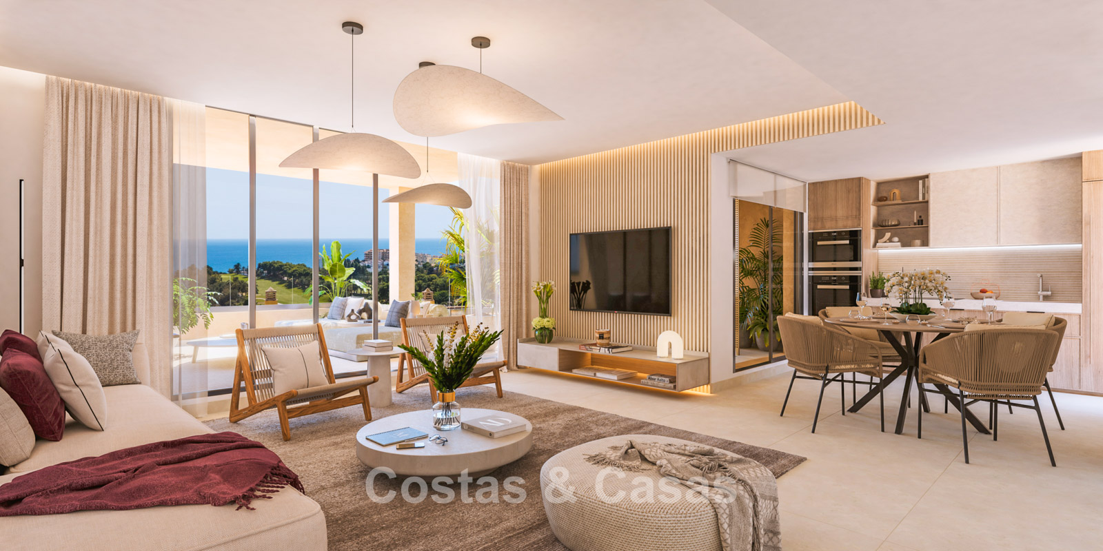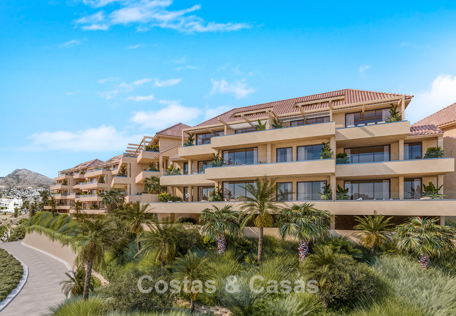 This exclusive development consists of 112 modern homes, distributed across two phases and 13 elegant residential buildings. The first phase will be built on the western side of the hill. The complex is a gated community focused on privacy and luxury, surrounded by over 4,000 m² of communal areas. The architecture blends contemporary design with traditional Andalusian influences, perfectly integrated into the natural surroundings. The homes are built using sustainable materials and high-quality finishes to ensure maximum comfort. Thanks to the elevated west-facing position, you can enjoy breathtaking views over the fairways and the Mediterranean Sea. Note: only a limited number of units offer both golf and sea views, so early reservation is recommended. Spacious terraces, and for penthouses, an impressive solarium, extend the living space outdoors. Large sliding windows with recessed profiles create a seamless indoor-outdoor transition and allow abundant natural light. Open-plan living area with TV lounge and integrated dining space. Custom-designed kitchen equipped with high-end appliances. Bedrooms are generously sized, and bathrooms feature luxurious ceramic finishes and modern fittings. Elegant porcelain flooring runs throughout the property, offering both style and easy maintenance. Each property includes a private storage room in the basement. Ample underground parking is available, along with visitor parking spaces.