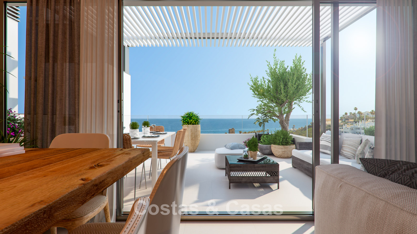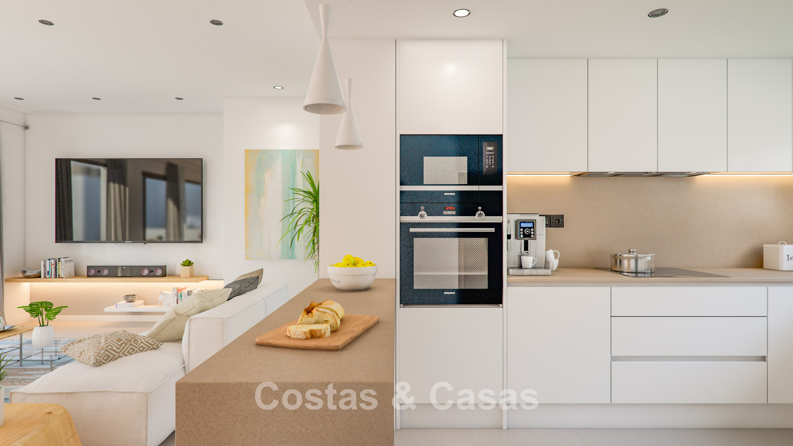 New-build apartments in a modern style, using high-quality materials and innovative technologies. Ideal south-facing orientation. Stunning panoramic views of the Mediterranean Sea. Each property features a spacious terrace, while penthouses also benefit from a generous solarium. Large sliding windows allow abundant natural light, enhancing the bright and open interior. Open-plan living space with TV area and dining area. Fully fitted kitchen with modern appliances, integrated into the open living concept. Each property includes a practical storage room. Parking is hassle-free with an underground parking space included, with options for electric vehicle charging points.