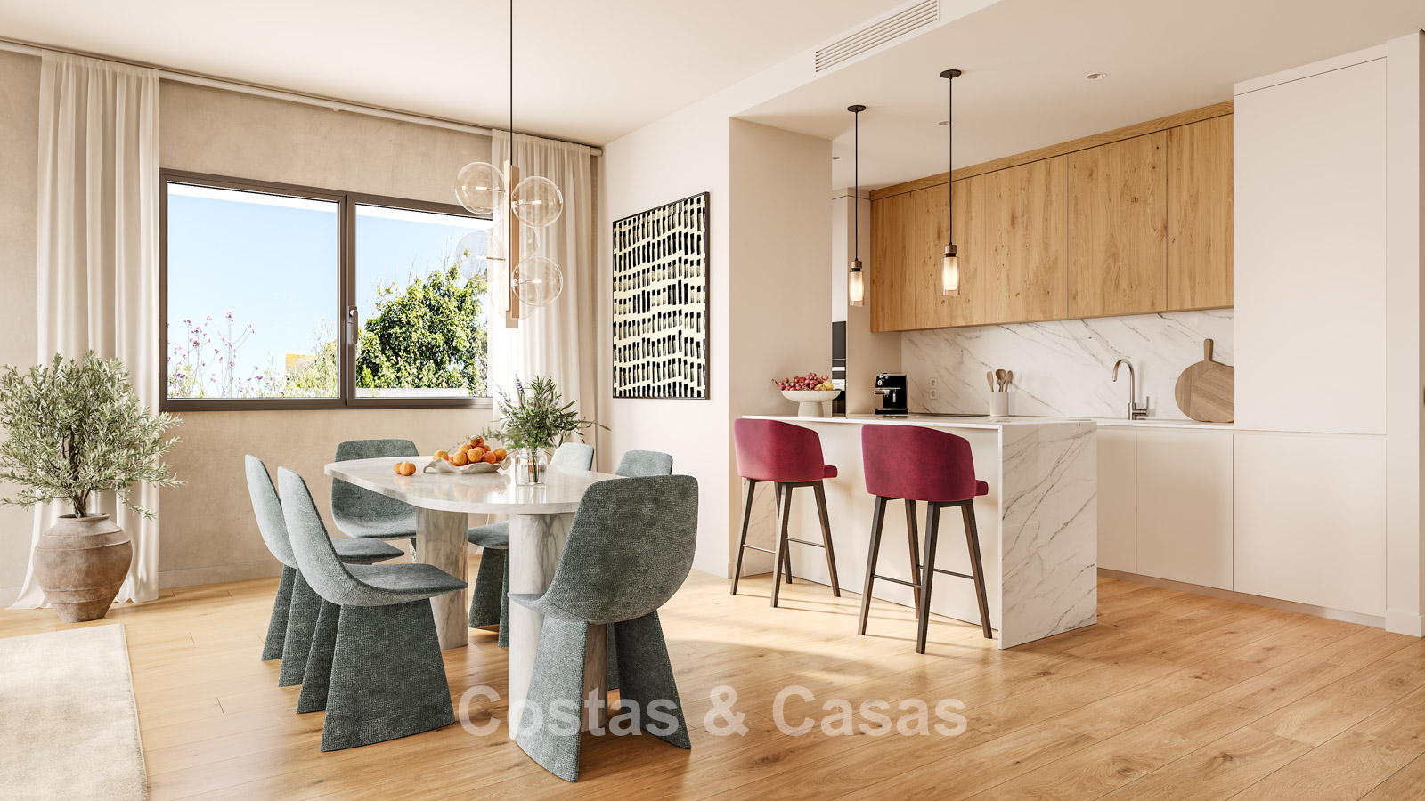New-build apartments and penthouses with contemporary architecture. Using first-class materials and a refined finish. Ground floor apartments have a private garden. The penthouses enjoy a spacious roof terrace. Inviting terraces provide a relaxation lounge. High sliding windows in the living room provide plenty of natural daylight. Contemporary design with open layout. Fully equipped kitchens with Bosch appliances and a breakfast bar. 2 or 3 bedrooms, 2 bathrooms. Storage room. Indoor private garage.