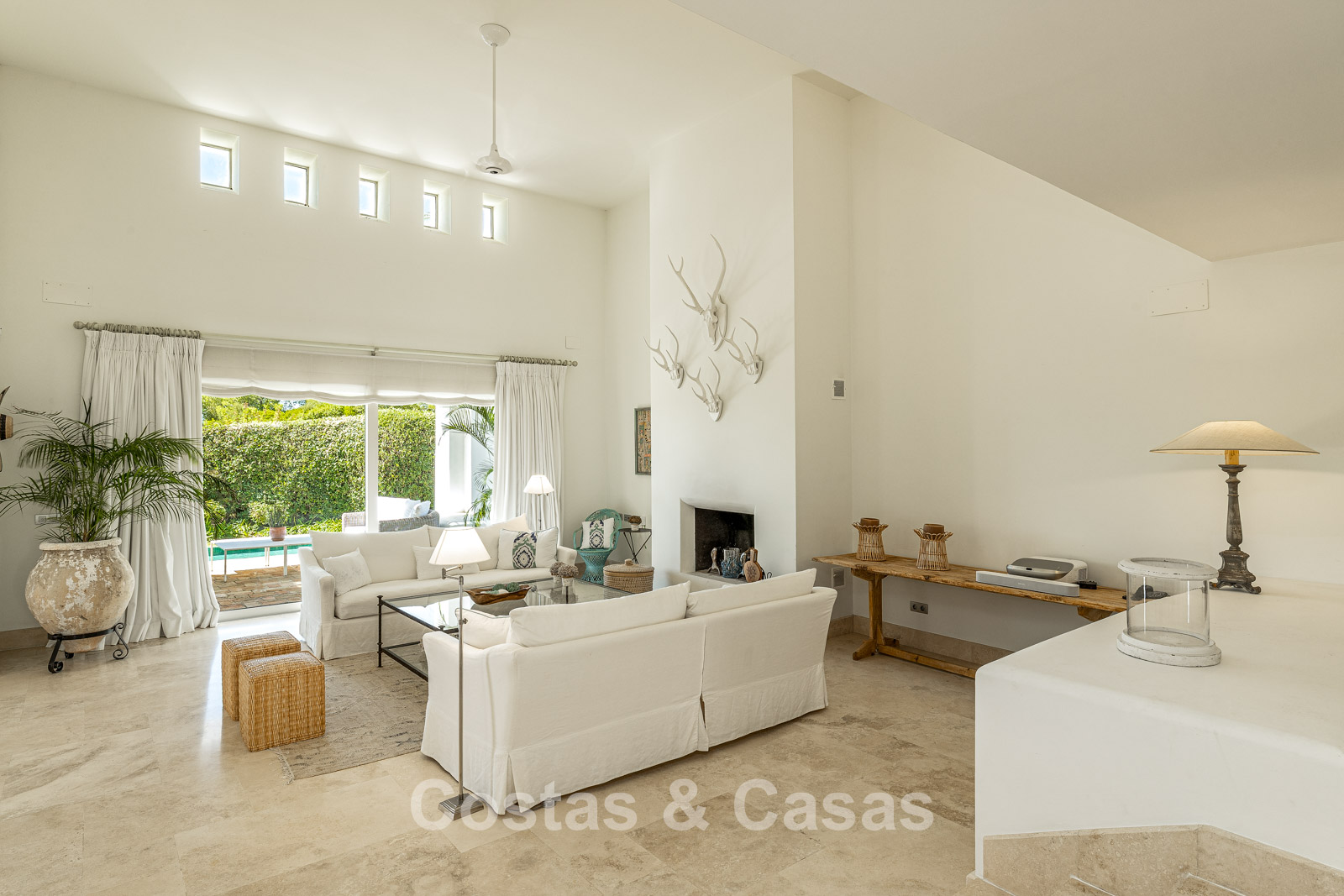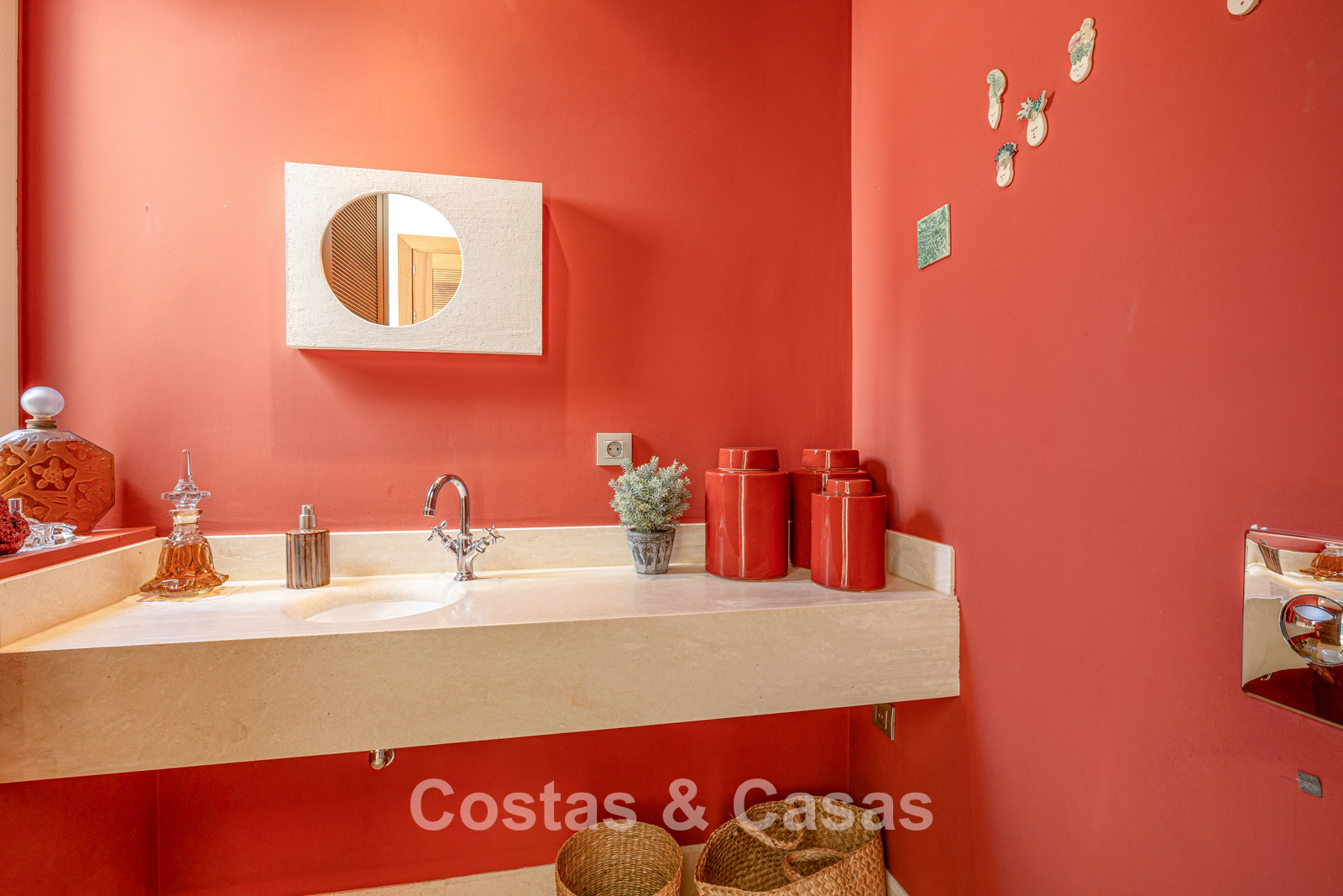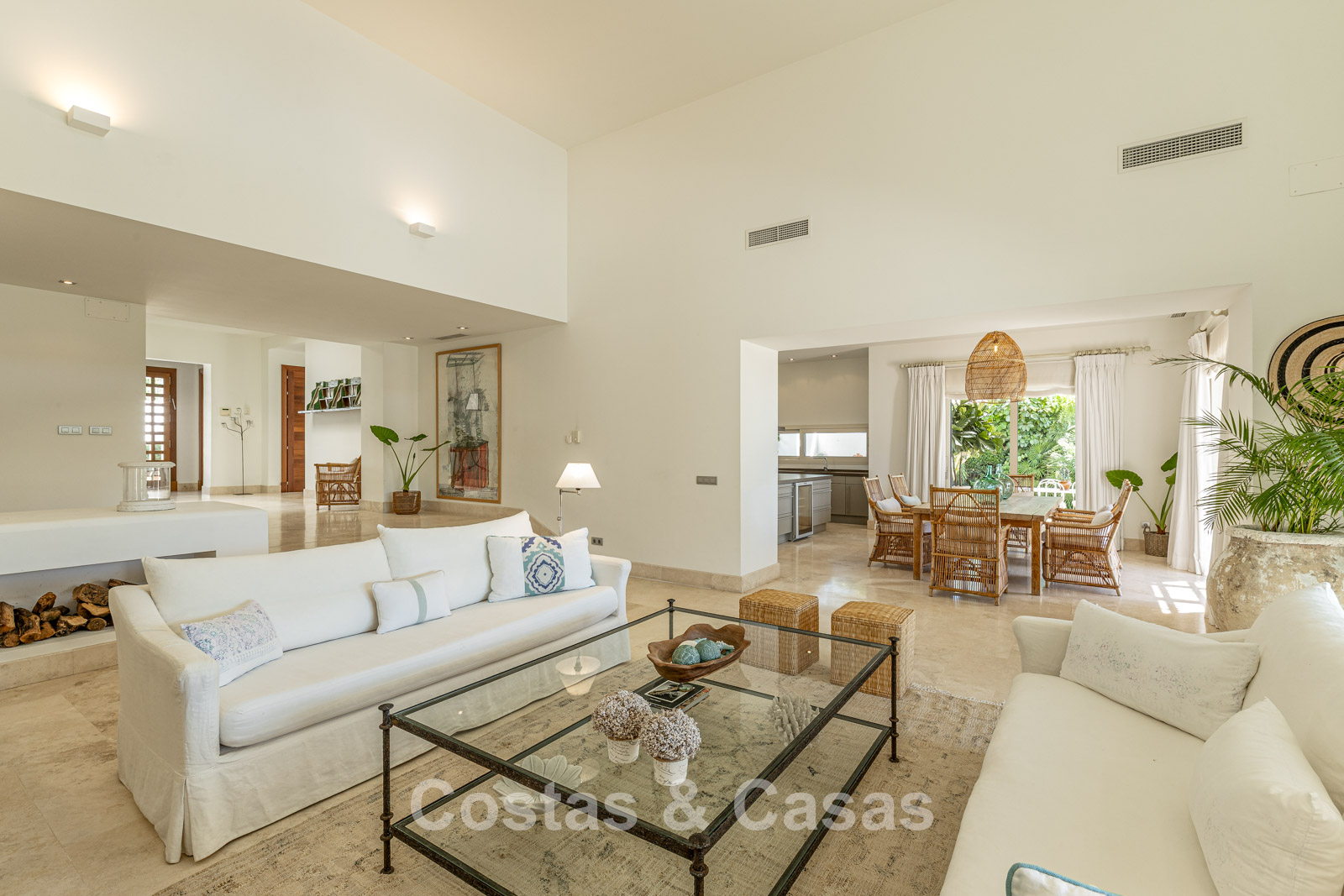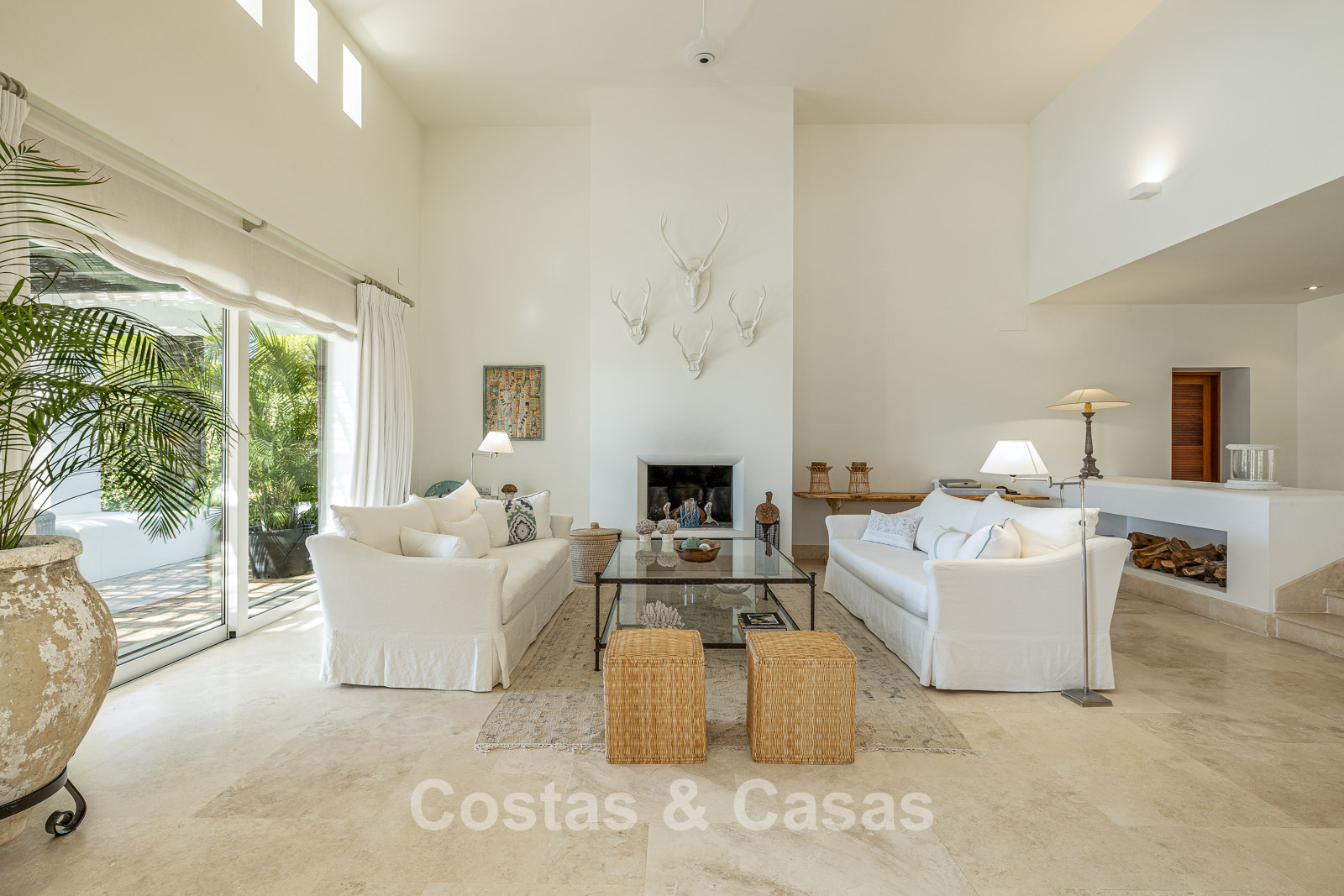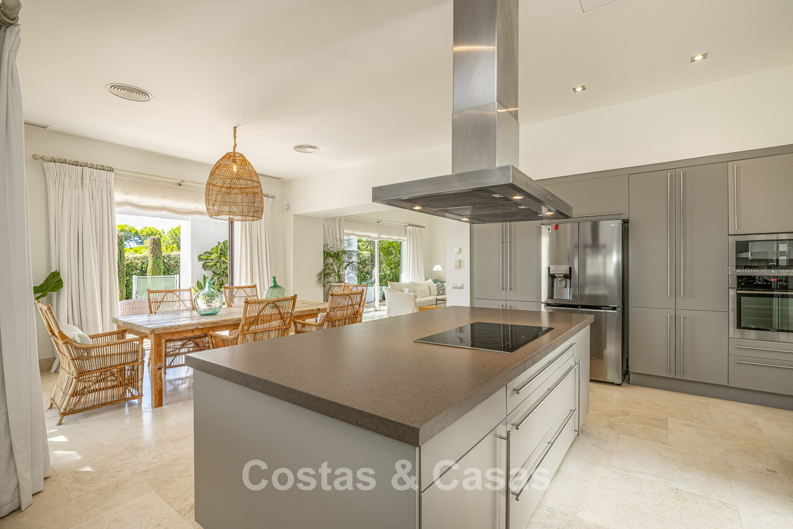 Detached villa with a contemporary Mediterranean architectural style. Characteristics are the white cubist volumes and clean lines, inspired by traditional Andalusian architecture with a modern interpretation. The use of natural materials such as stone and wood, combined with warm earth tones on the terrace and garden. Comfortable, open-plan layout with a bright interior. Tall sliding windows with recessed frames flood the interior with natural light and provide a connection between indoors and outdoors. The living area has a double-height ceiling, contributing to an open and airy atmosphere. A cozy TV lounge features a fireplace. A large, open-plan kitchen equipped with Siemens appliances, a cooking island, and an integrated dining area. Four beautifully appointed bedrooms, four bathrooms, and a separate toilet. High-quality marble floors. Laundry room. Carport for two cars.