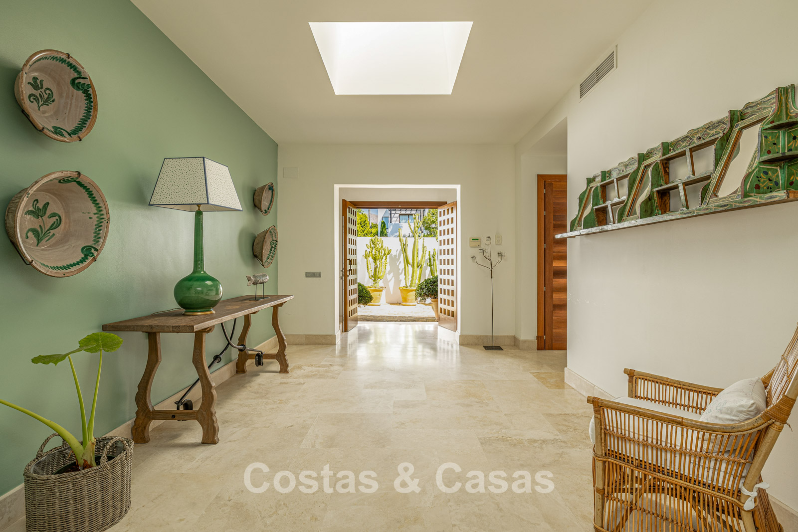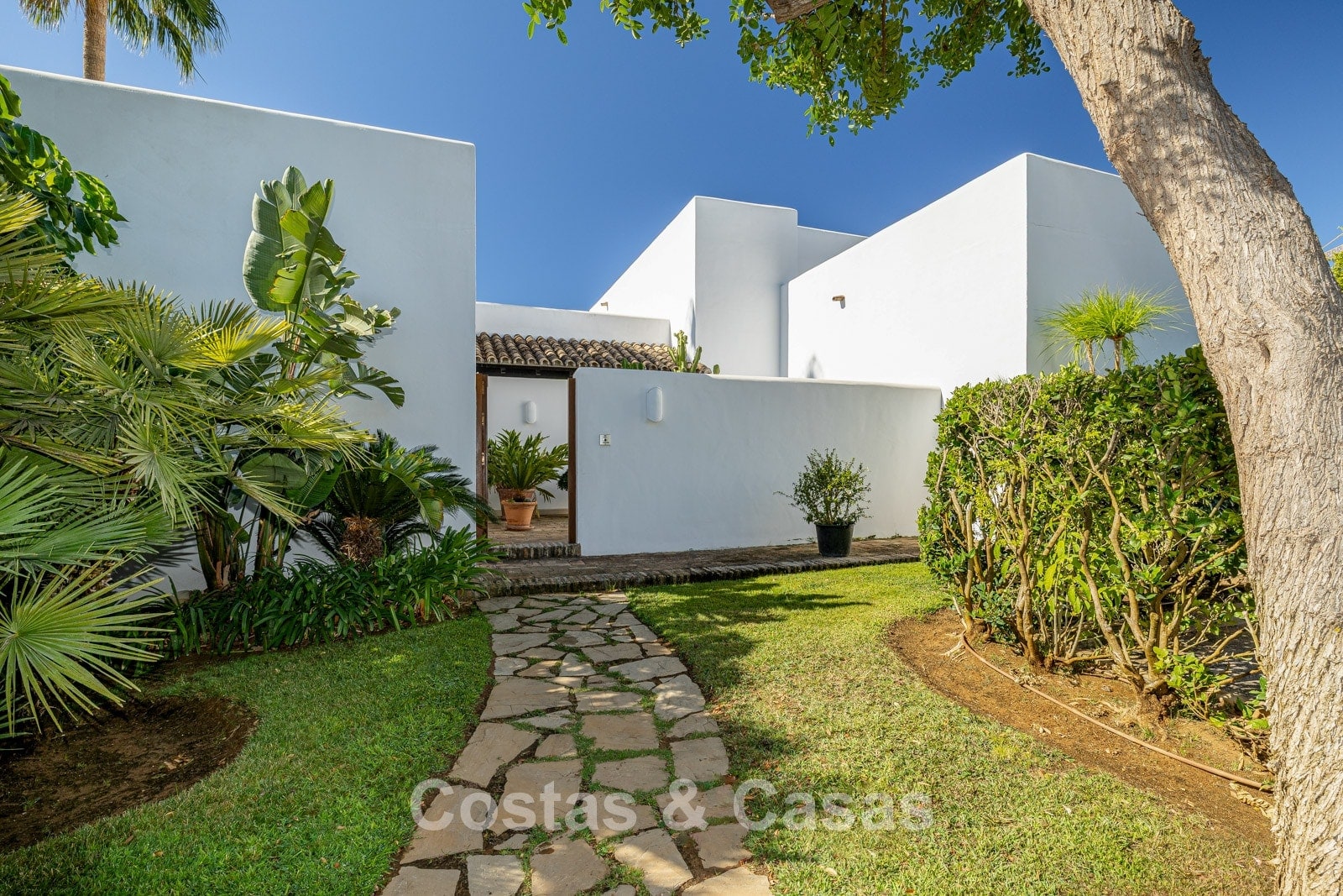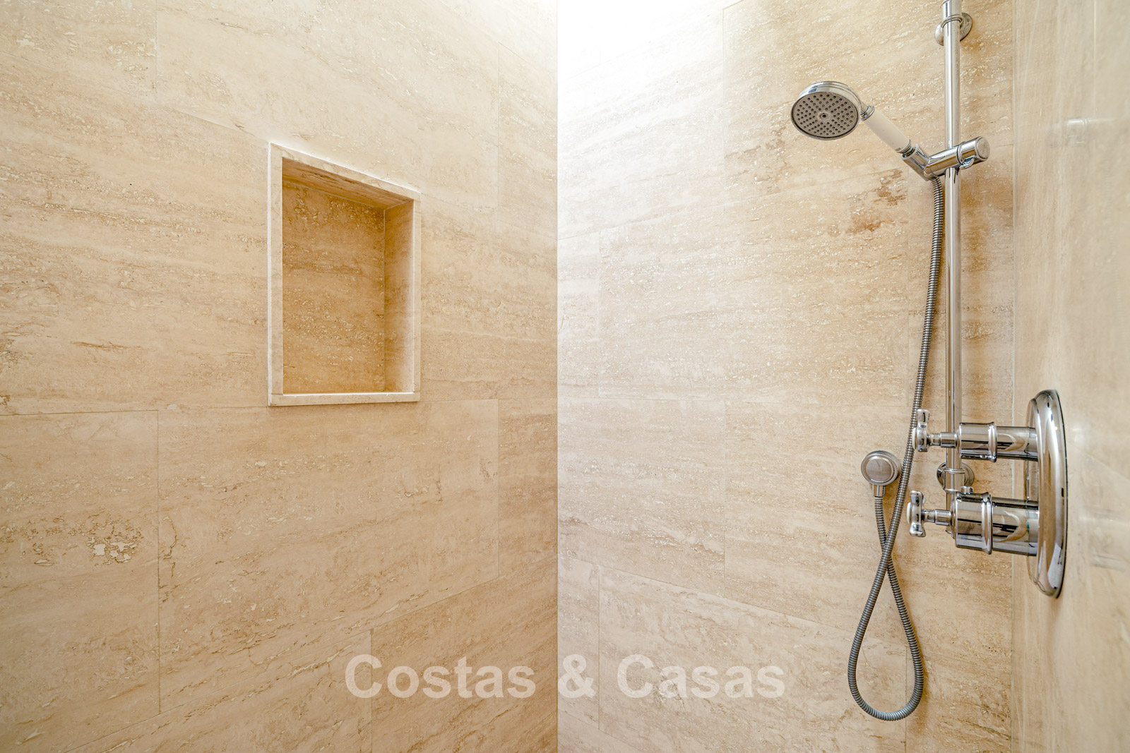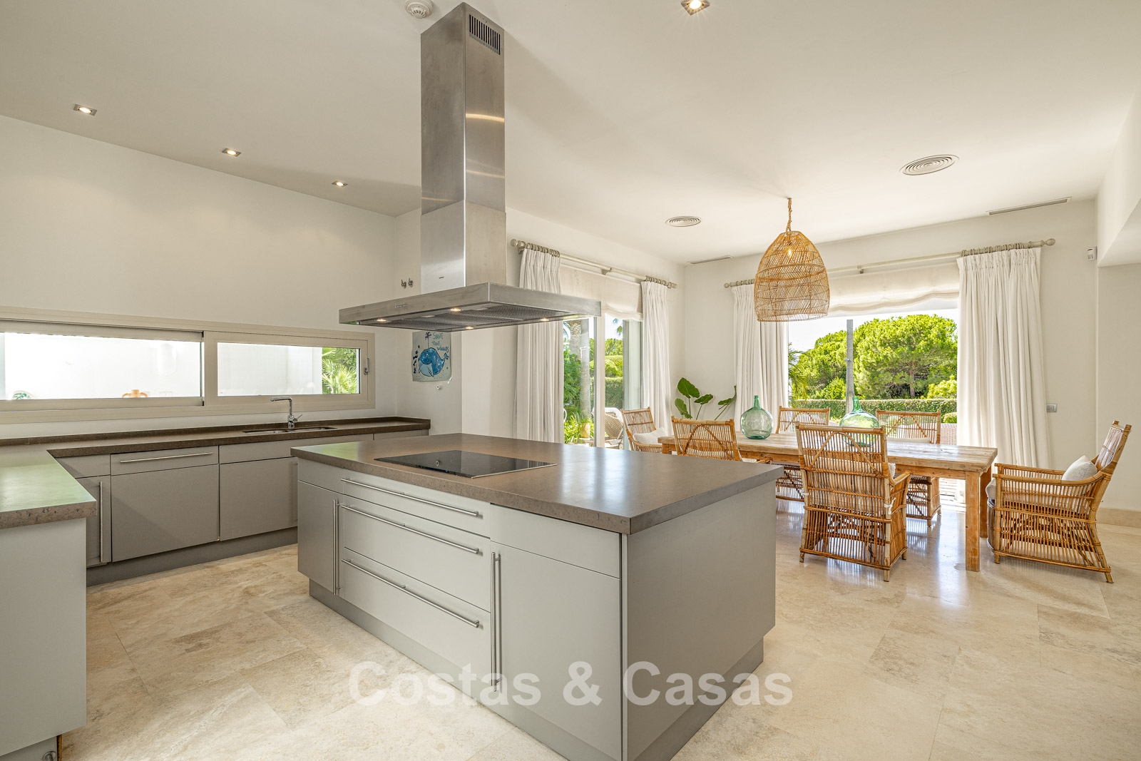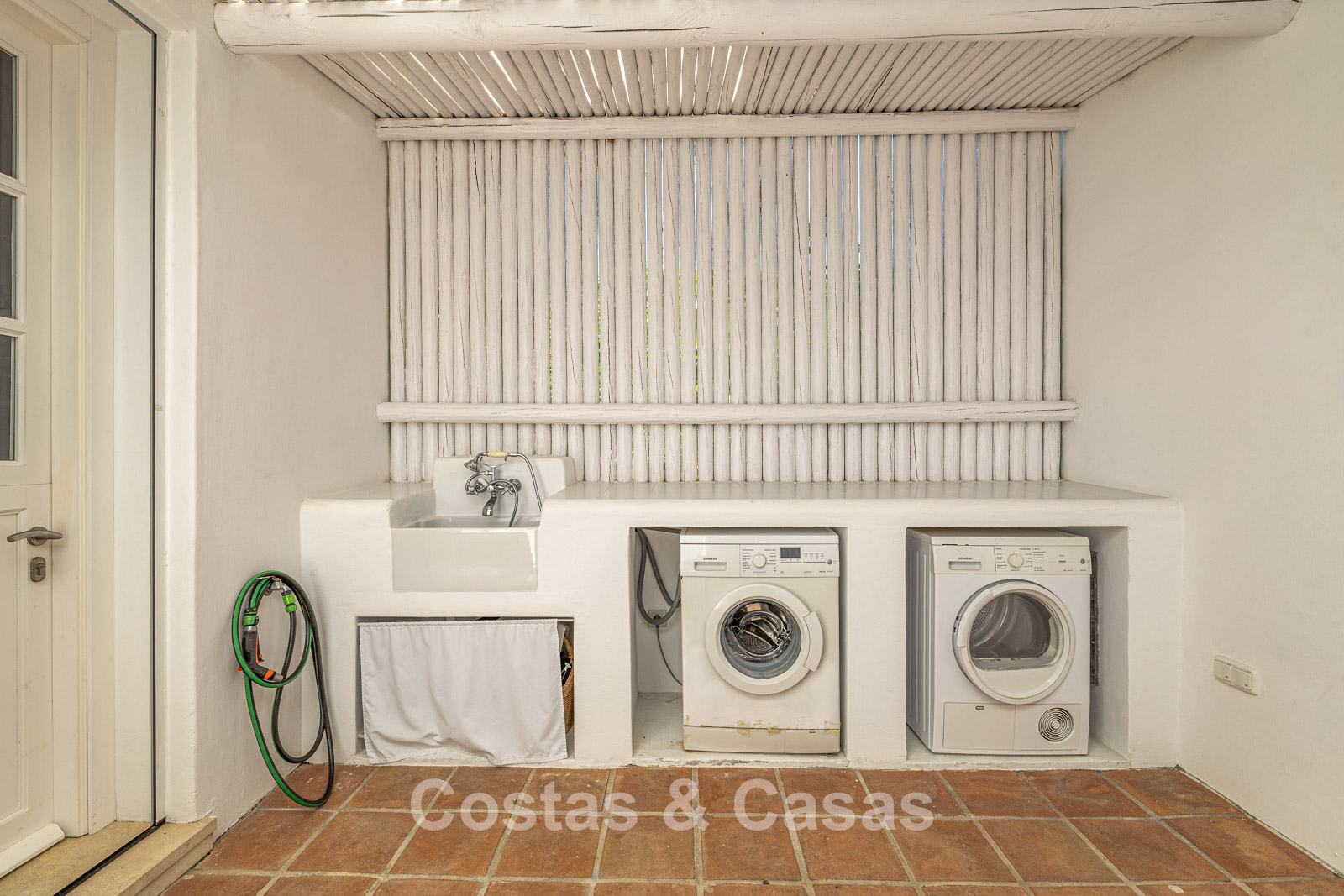 Detached villa with a contemporary Mediterranean architectural style. Characteristics are the white cubist volumes and clean lines, inspired by traditional Andalusian architecture with a modern interpretation. The use of natural materials such as stone and wood, combined with warm earth tones on the terrace and garden. Comfortable, open-plan layout with a bright interior. Tall sliding windows with recessed frames flood the interior with natural light and provide a connection between indoors and outdoors. The living area has a double-height ceiling, contributing to an open and airy atmosphere. A cozy TV lounge features a fireplace. A large, open-plan kitchen equipped with Siemens appliances, a cooking island, and an integrated dining area. Four beautifully appointed bedrooms, four bathrooms, and a separate toilet. High-quality marble floors. Laundry room. Carport for two cars.