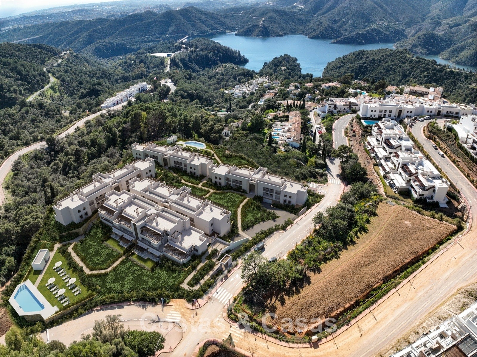 This new development consists of a boutique phase designed with contemporary architecture. The complex is conceived as a private “boutique” community that blends seamlessly into its natural surroundings. The homes are south to south-east facing. Depending on the unit, residents can enjoy views of Lake Istán and the surrounding mountains, with some properties also offering panoramic views of the Mediterranean Sea. The construction quality meets the highest technical standards, with a strong focus on thermal and acoustic insulation. Each property features a generous terrace, while the penthouses also include a private solarium. Large windows create a seamless connection between indoor and outdoor living spaces. The living areas are modern and open-plan, designed to maximise space and maintain a visual connection with the landscape. The kitchen is fully fitted with high-quality appliances and integrated into the living area for a sociable layout. Options are available for both 2- and 3-bedroom homes, with the master bedroom featuring an en-suite bathroom. Floors are finished with large-format porcelain tiles, giving a sleek and luxurious appearance. Each apartment includes a private storage room. A parking space in the underground garage is included, with pre-installation for electric vehicle charging points.