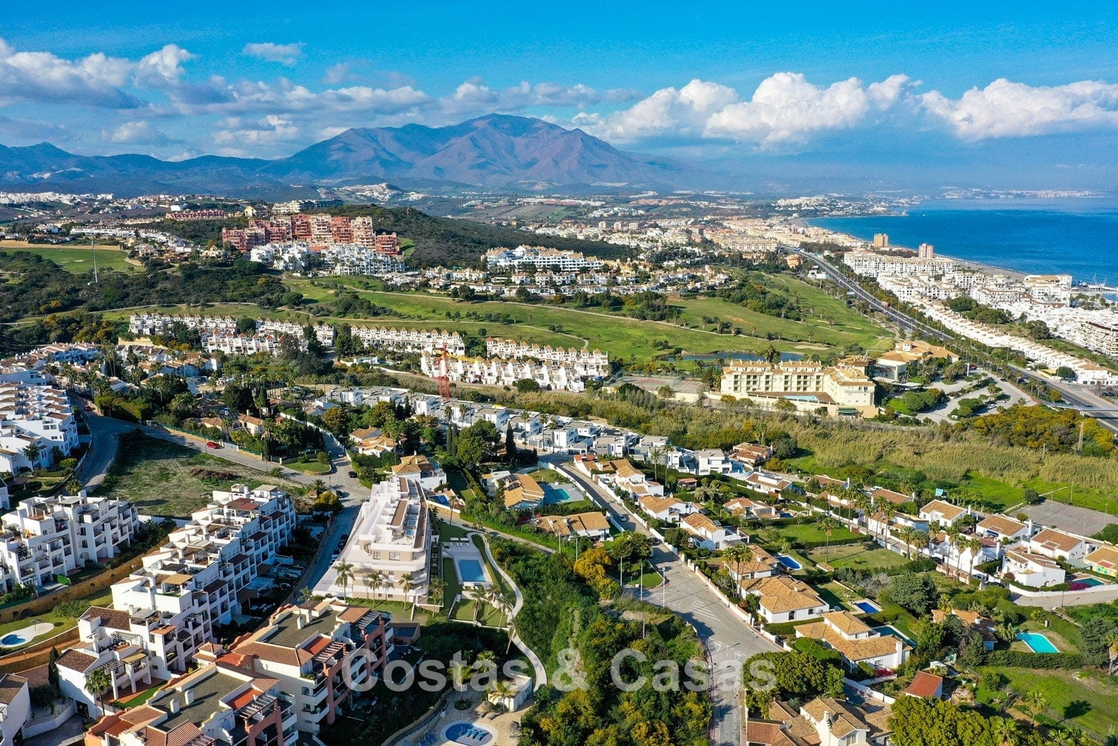 Situated on the western side of the Costa del Sol, just a 5-minute walk from the beach. Several amenities, including a supermarket, restaurants and golf courses, are just minutes away. The nearby marinas of La Duquesa and Sotogrande (only 5 and 10 minutes by car) offer excellent restaurants, charming boutiques, art galleries and water sports facilities. The charming historic seaside town of Estepona, with its kilometres-long renovated promenade and pedestrian shopping streets, is just a 15-minute drive away. Puerto Banús marina and Marbella’s historic centre can be reached within 30 and 35 minutes respectively. Residents will enjoy a communal swimming pool and landscaped Mediterranean gardens.
