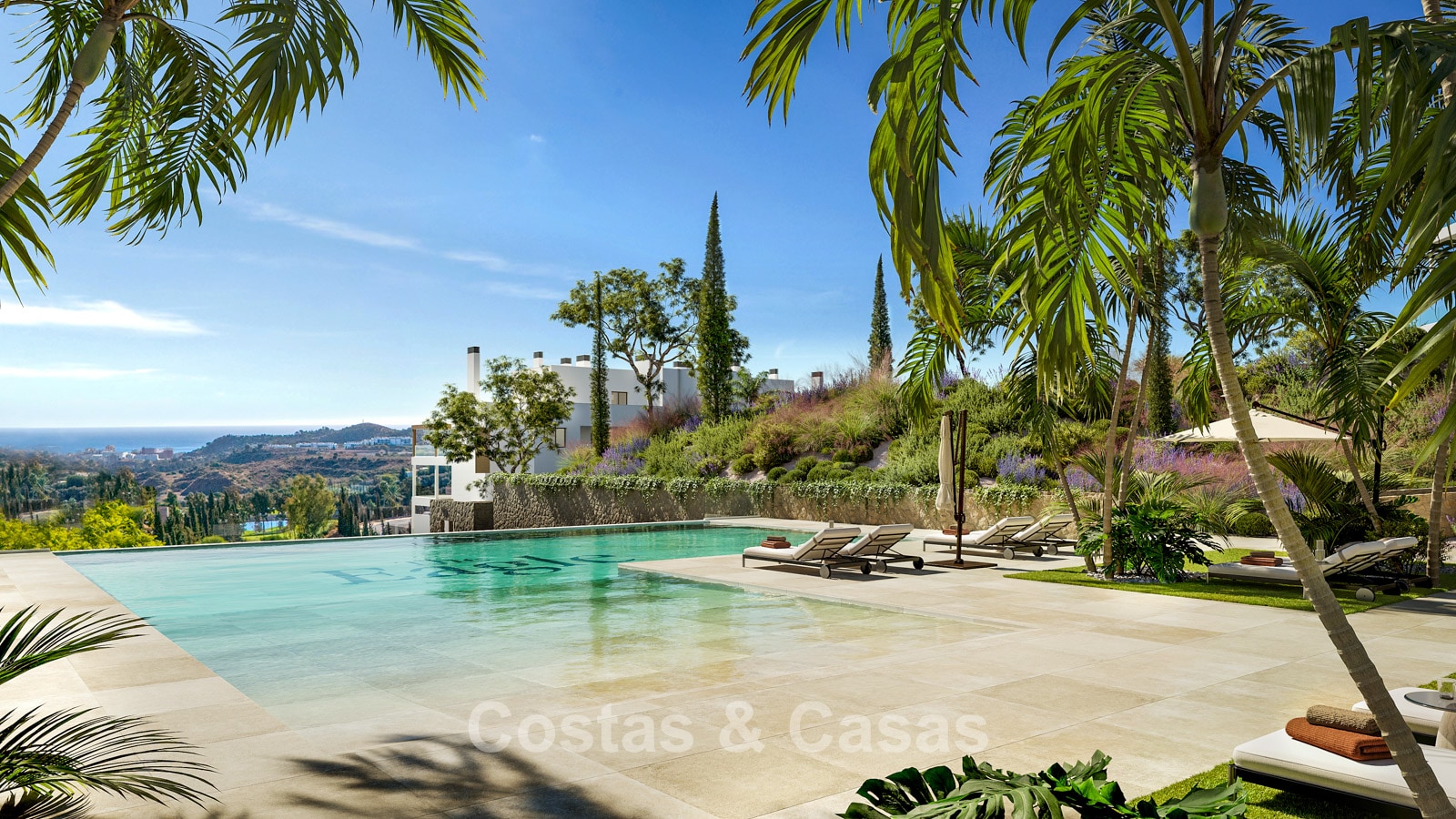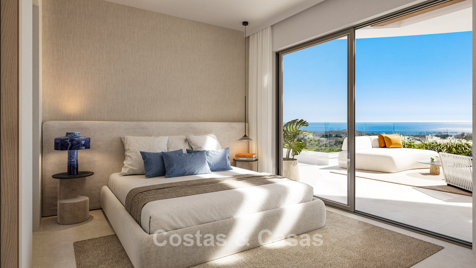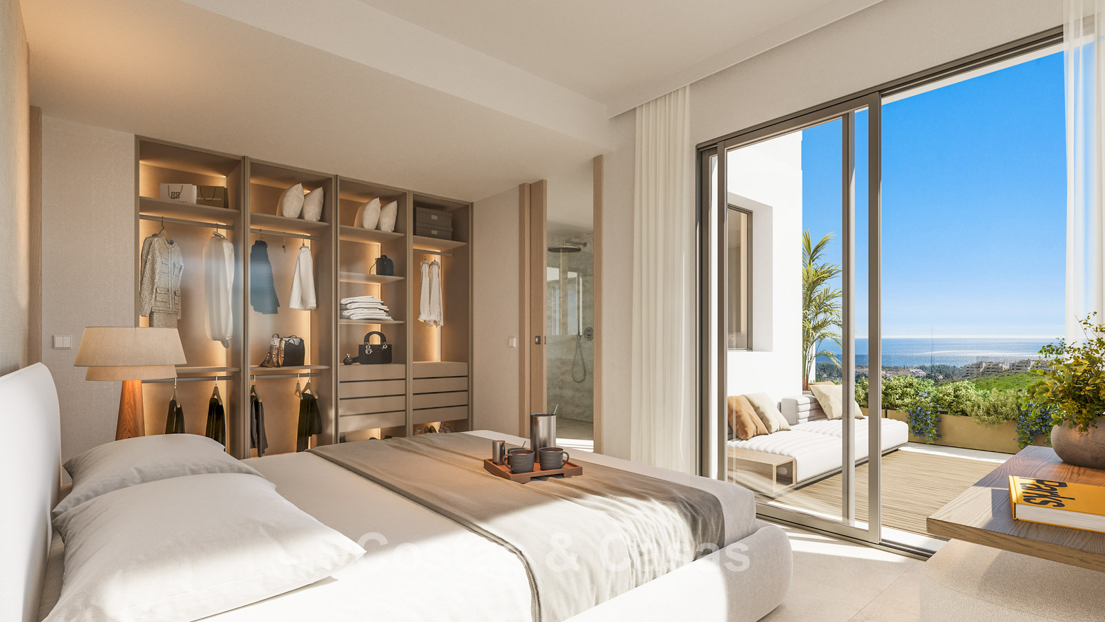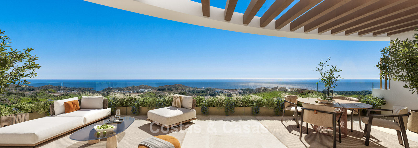 Contemporary new-build apartments characterised by modern and functional architecture. The low-density development consists of just 59 homes across four elegant buildings. Designed to a high standard. Built using high-quality and sustainable materials. South and south-west facing. From almost every angle, the properties enjoy spectacular, unobstructed views of the sea, golf courses and coastline. Spacious terraces provide ample room for lounge and dining areas. Floor-to-ceiling aluminium sliding doors with thermal break and solar-control double glazing. Open-plan living area with TV lounge and integrated dining space. Modern open kitchen fully equipped with high-end Siemens appliances and a central island. Storage room and underground parking space included.