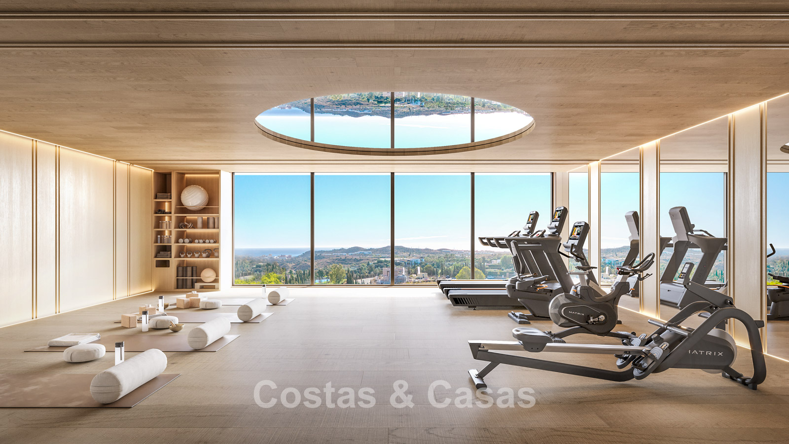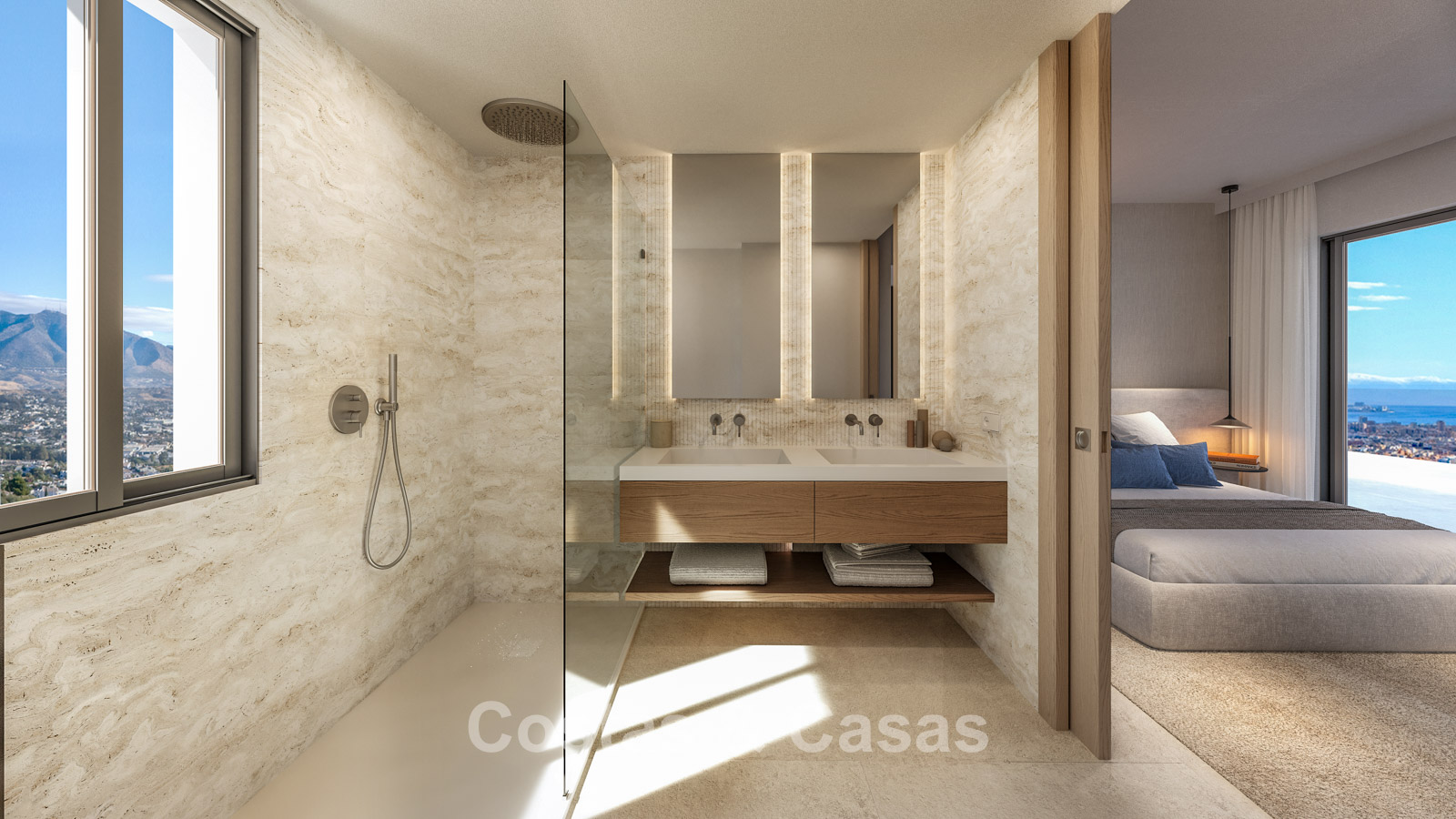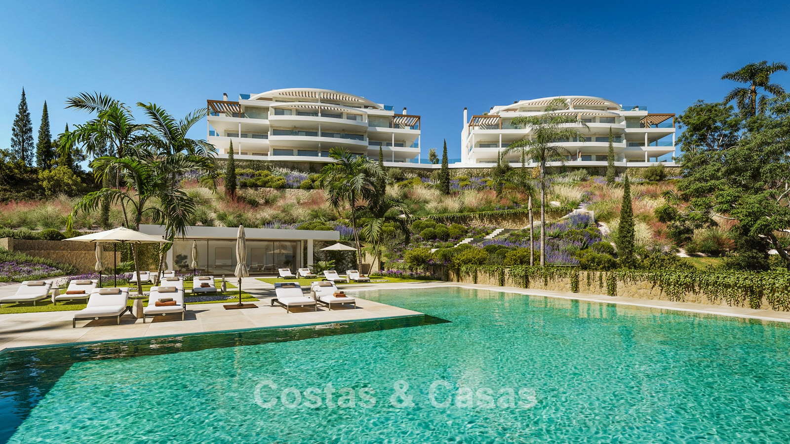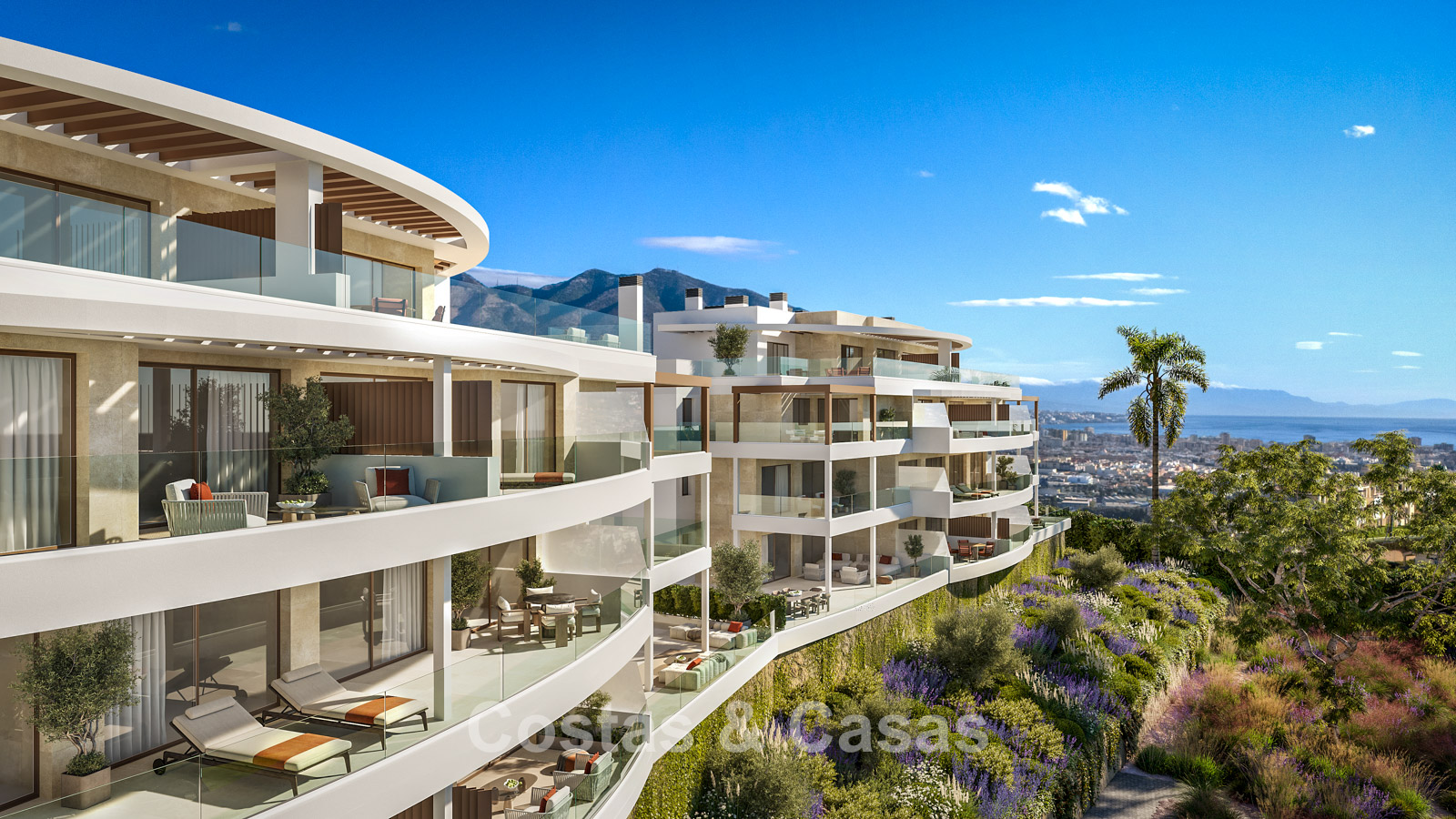 Contemporary new-build apartments characterised by modern and functional architecture. The low-density development consists of just 59 homes across four elegant buildings. Designed to a high standard. Built using high-quality and sustainable materials. South and south-west facing. From almost every angle, the properties enjoy spectacular, unobstructed views of the sea, golf courses and coastline. Spacious terraces provide ample room for lounge and dining areas. Floor-to-ceiling aluminium sliding doors with thermal break and solar-control double glazing. Open-plan living area with TV lounge and integrated dining space. Modern open kitchen fully equipped with high-end Siemens appliances and a central island. Storage room and underground parking space included.