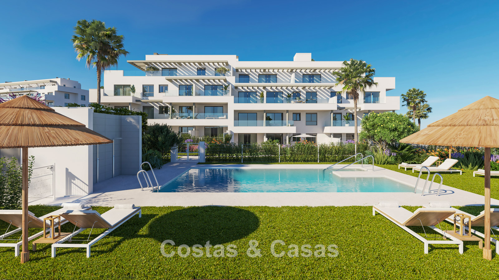 This project is strategically located near the quiet residential area of El Faro in Mijas Costa. You will enjoy a privileged location between the lively town of Fuengirola and the charming La Cala de Mijas. Within just a few minutes’ walk, you can reach picturesque rocky coves and beaches, ideal for snorkelling enthusiasts and sun lovers alike. In the immediate surroundings, you will find a wide selection of local beach clubs and authentic chiringuitos. Furthermore, Marbella and Puerto Banús are only a 20-minute drive away, while Málaga Airport can be reached within 30 minutes. The close proximity to the scenic El Chaparral Golf Course adds further value and ensures the area remains attractive all year round, even outside the high season. The communal gardens feature an inviting swimming pool with a spacious chill-out area.