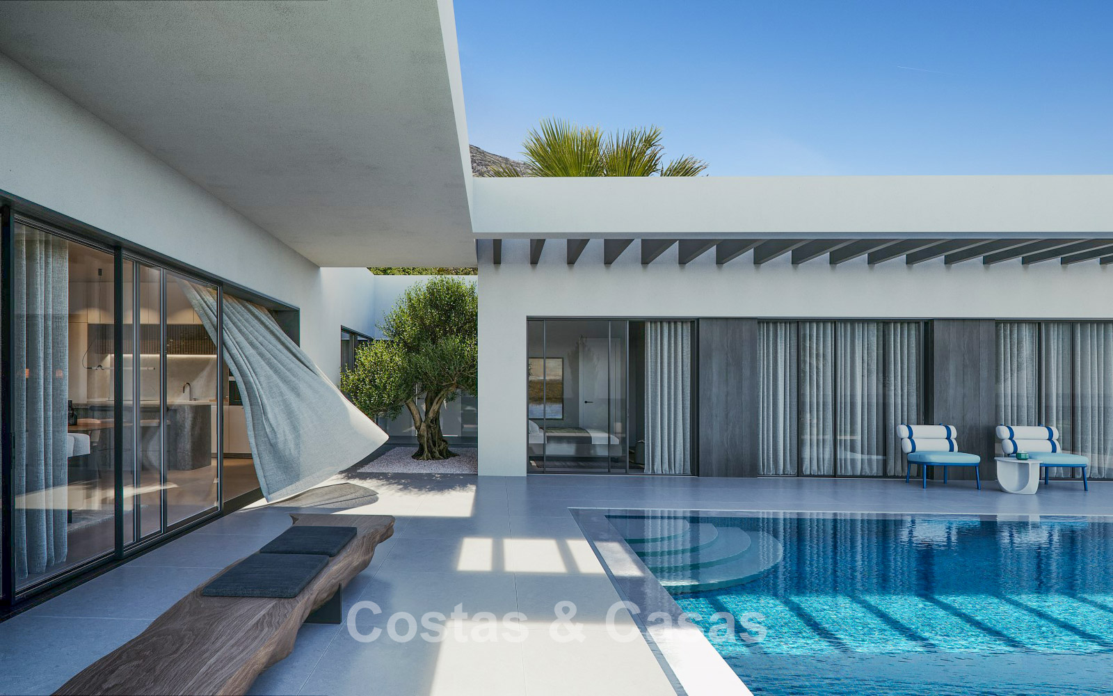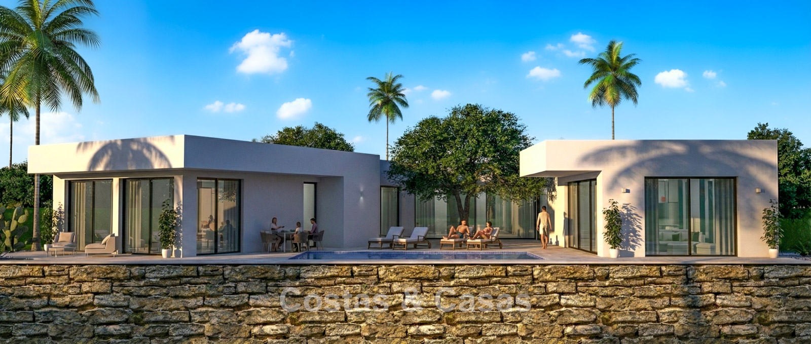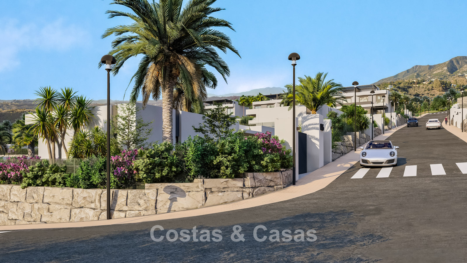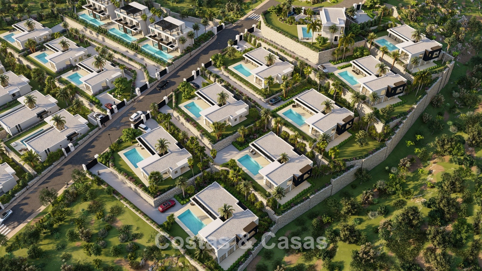 This exclusive residential concept seamlessly blends contemporary architecture with nature. The homes are located within a secure gated community, ensuring peace and safety. Each property has been carefully designed to make optimal use of the local climate. Thanks to the terraced layout, nearly every unit enjoys uninterrupted panoramic sea views. A bioclimatic design has been selected, with high-quality insulation for maximum energy efficiency. Spacious terraces are designed to create a seamless transition between indoor and outdoor living. Large windows with black frames and double glazing ensure optimal natural light and climate control. Living spaces are generously designed with a focus on comfort and smart use of space. The modern open-plan kitchen is fitted with high-quality Siemens appliances and a stunning kitchen island. Bedrooms feature sleek built-in wardrobes, and bathrooms are fitted with Villeroy & Boch sanitary ware. Luxury porcelain floor tiles are installed throughout the home. For investors, a property management programme is available via the on-site reception. Each villa includes private parking with pre-installation for an electric charging point.