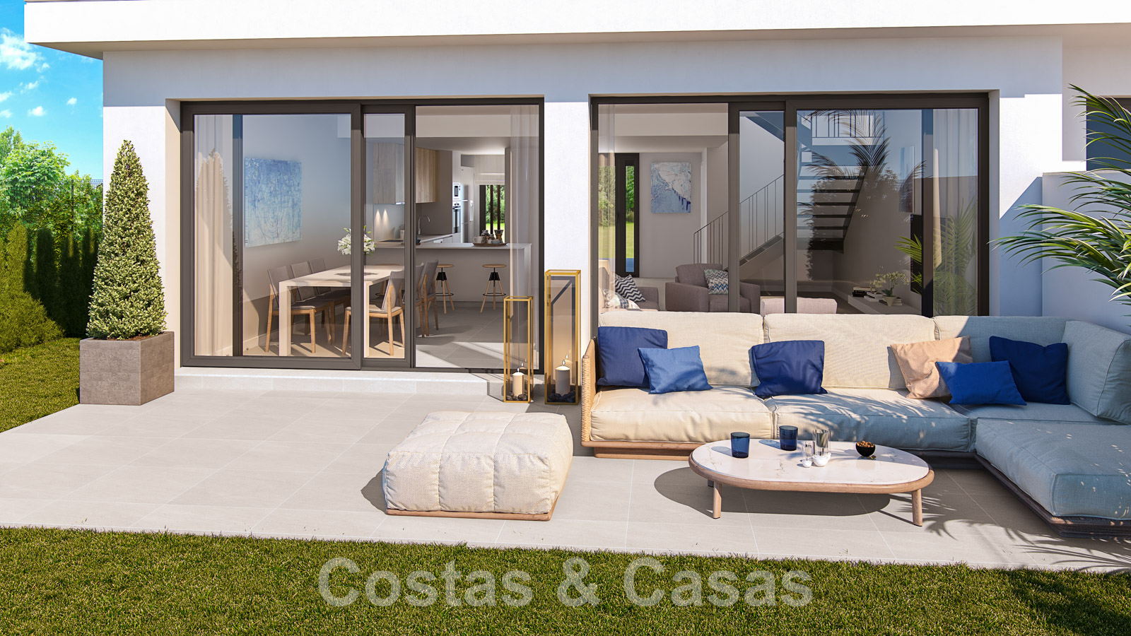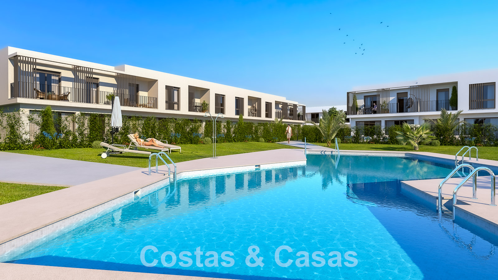 Newly built homes in contemporary style. Using high-quality building materials and refined finishes. Bright interior with open layout. Townhouses with 2 residential floors and a private garden. Open and covered terraces equipped with seating areas. Living room with TV lounge and integrated dining table. Open, fully equipped kitchen with breakfast bar. Laundry room/utility room. 4 bedrooms, 2 or 3 bathrooms. High sliding windows, providing naturally lit rooms. Ceramic tiled floors. Private parking for 2 cars.