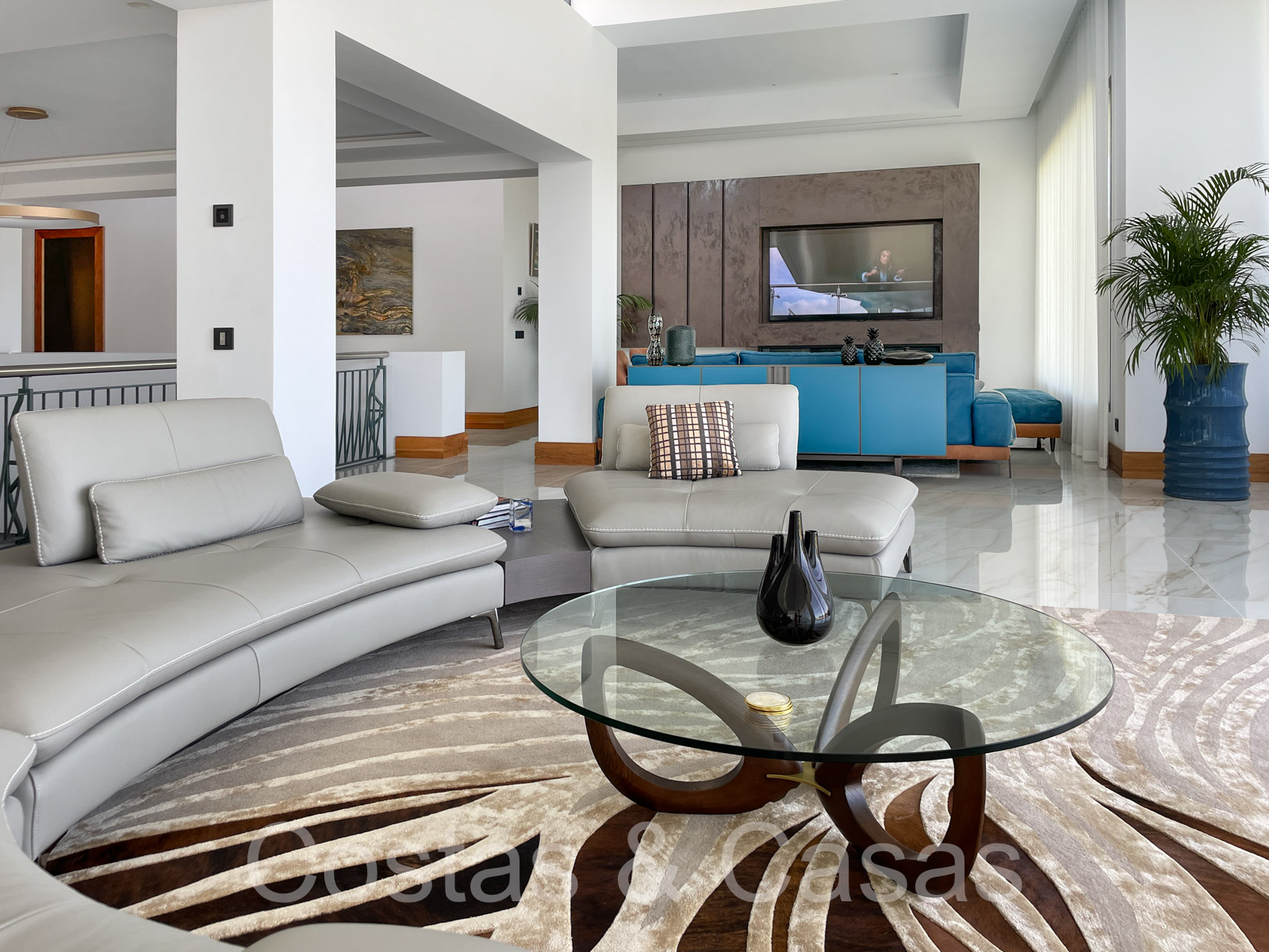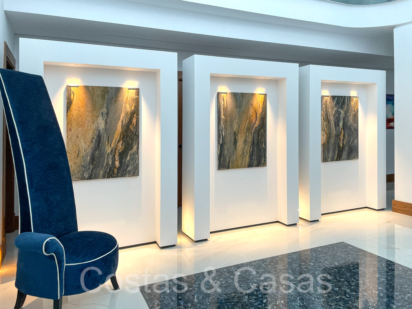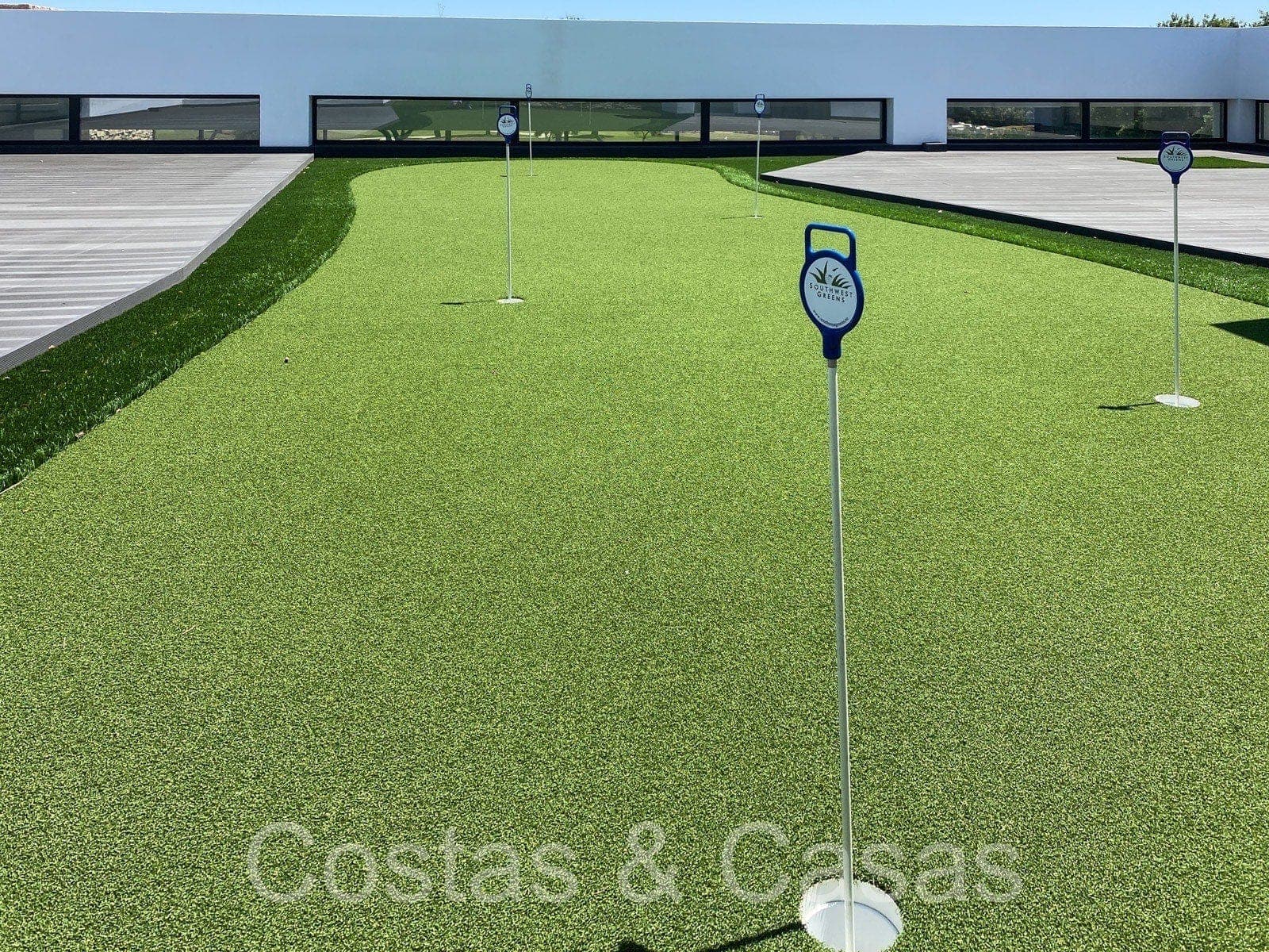 Extensive plot of 3.700m², with direct access to the golf course. Well-kept exterior with manicured landscape gardens and 3 large water features. Giant infinity pool with an adjacent sun terrace and a sunken chill-out. Built-in Jacuzzi and a Gazebo. Spectacular roof terrace designed with a professional putting green, surrounded by a sun deck. Unparalleled views over the golf courses with 2 lakes, towards the Mediterranean Sea.