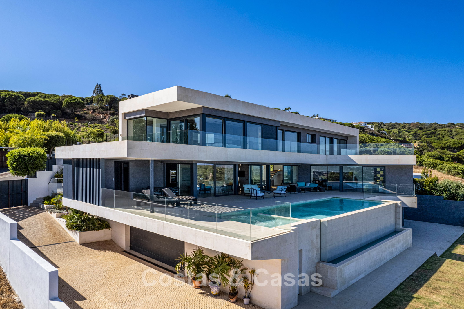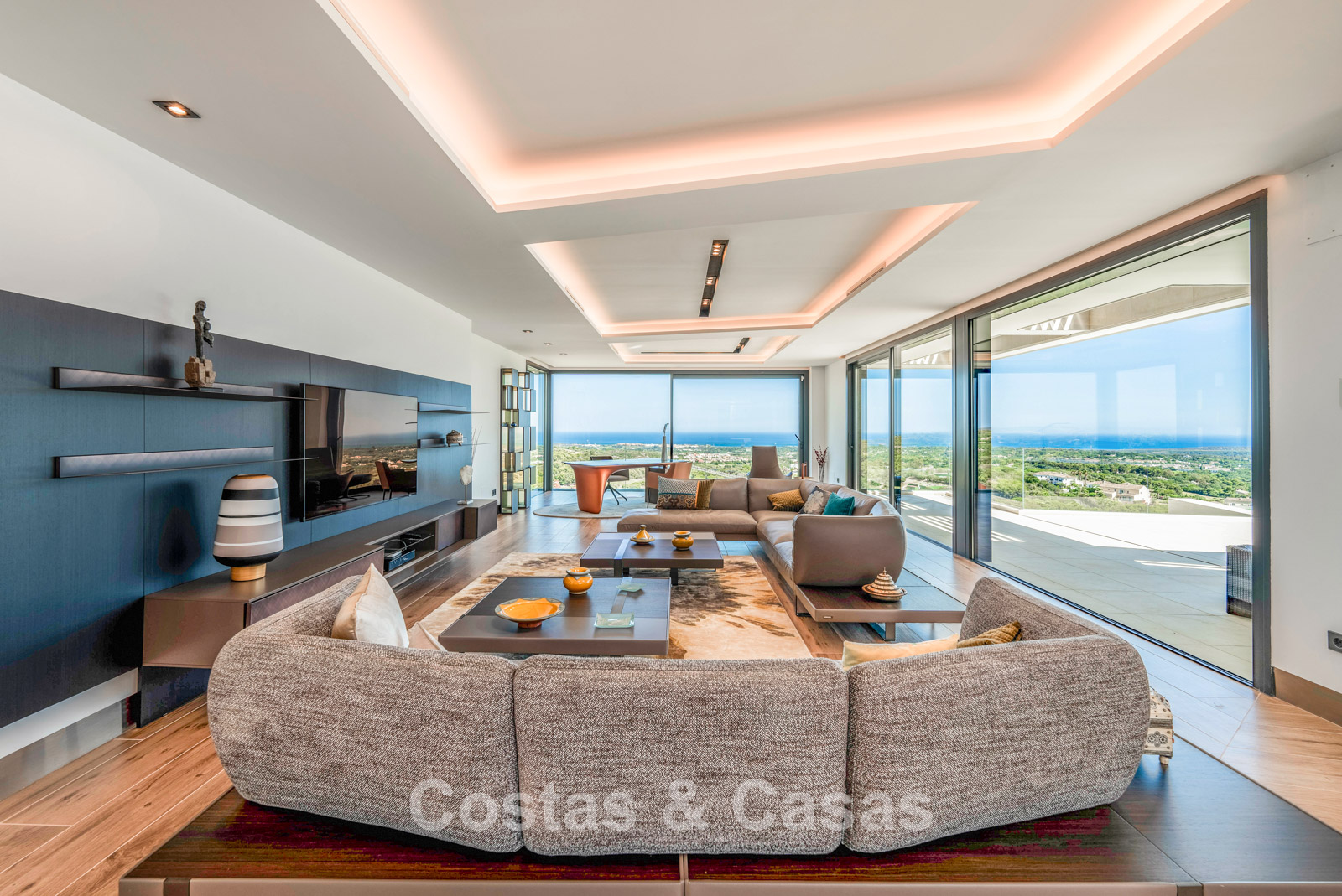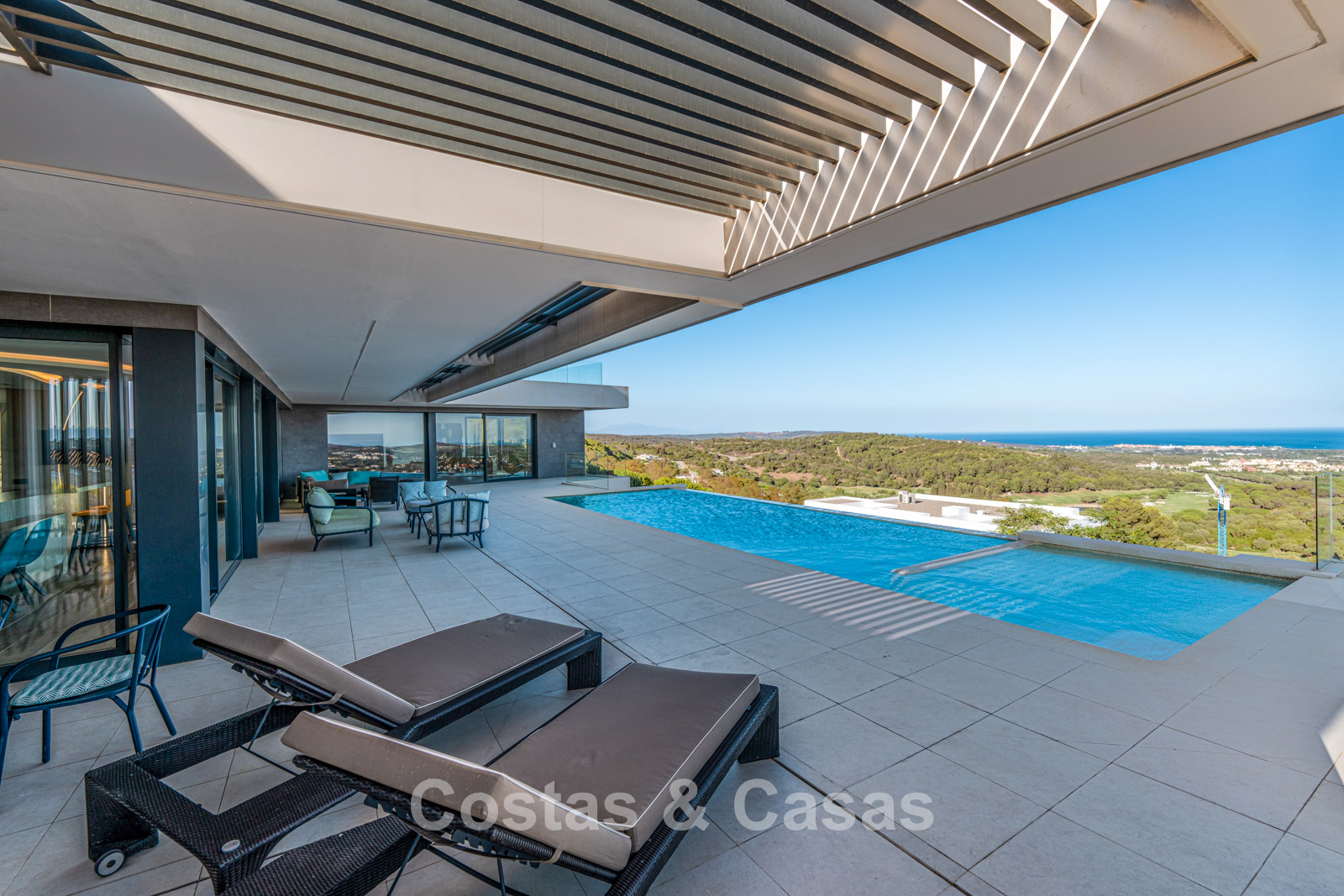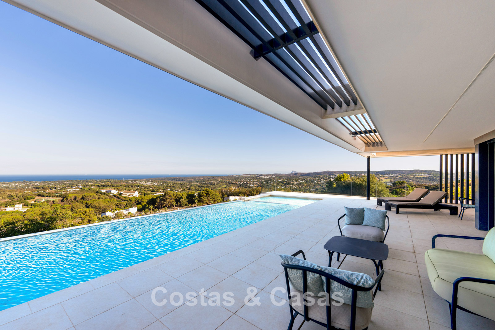 The villa is situated in an elevated position on a spacious, sloping plot. Manicured outdoor space with sustainably landscaped garden. Infinity pool with a built-in Jacuzzi and adjacent sun terrace. Extensive open and covered terraces are fitted with lounge facilities. Panoramic views of the surrounding area towards the Mediterranean Sea to the African continent.
