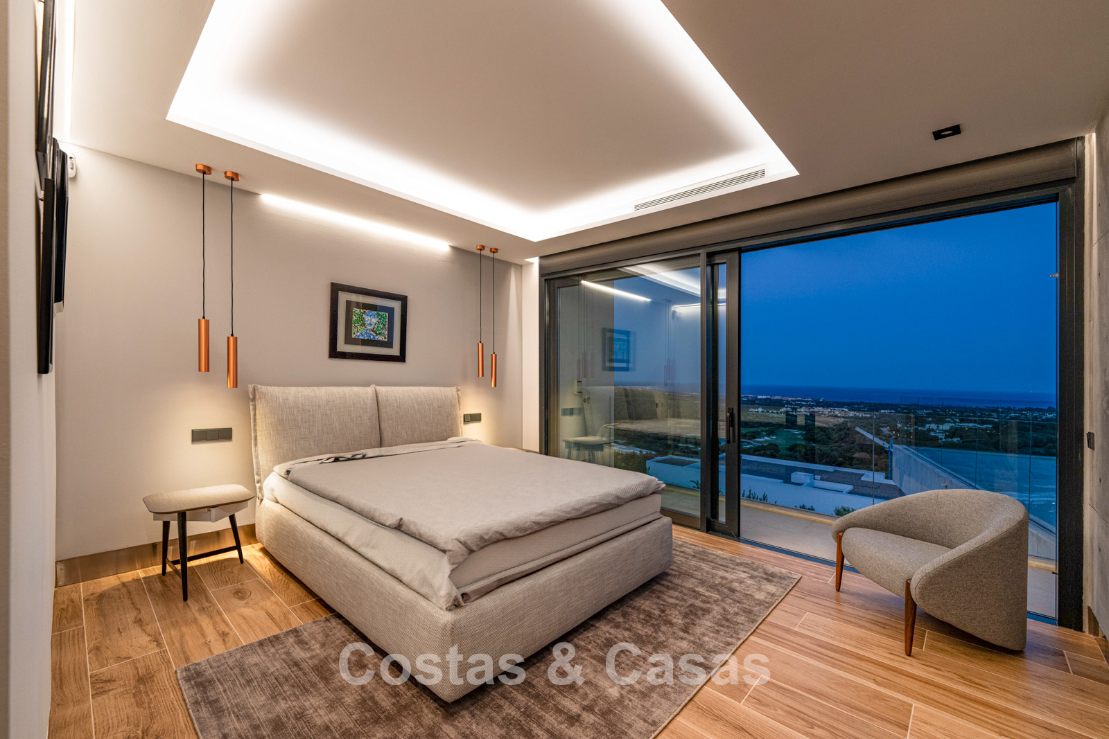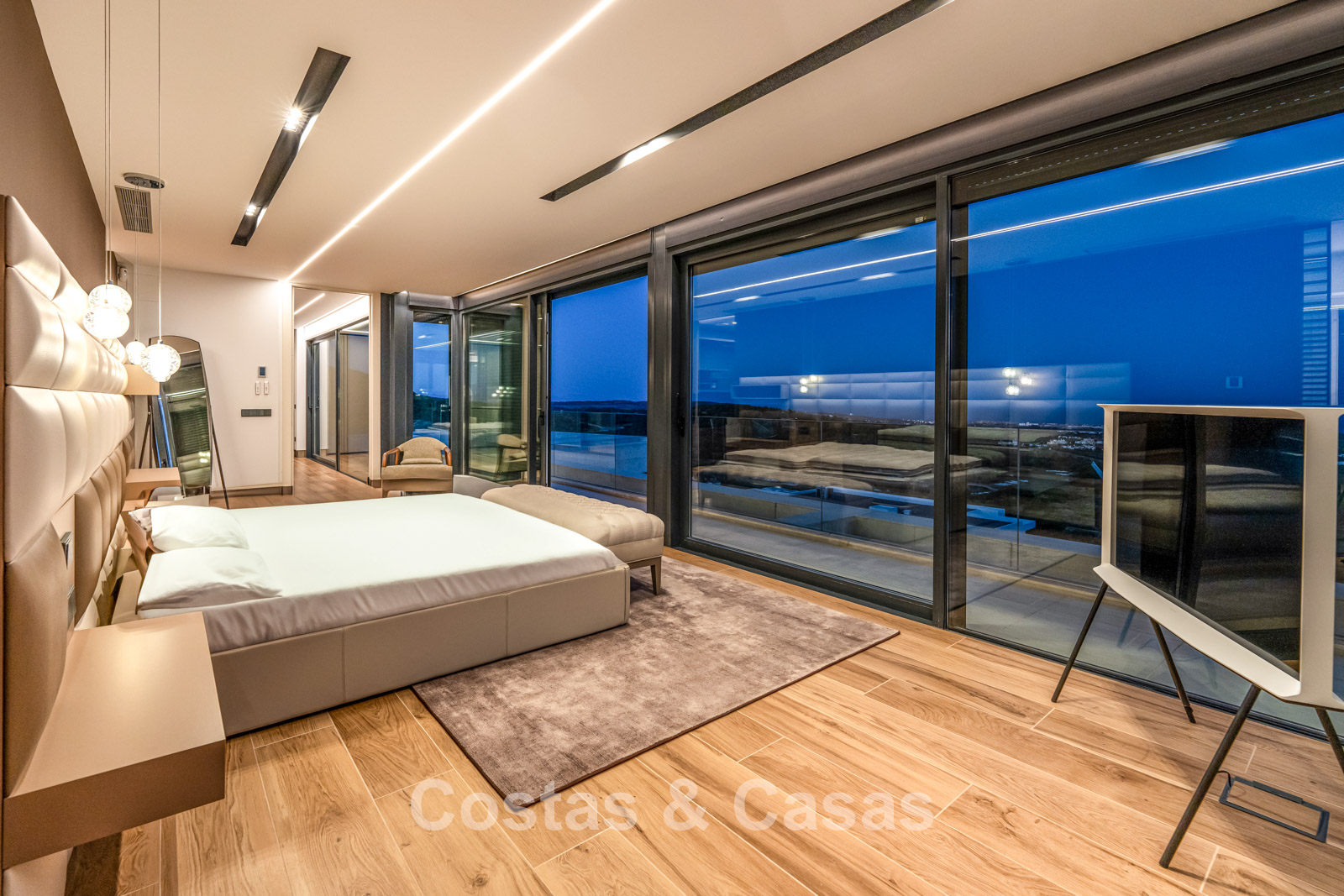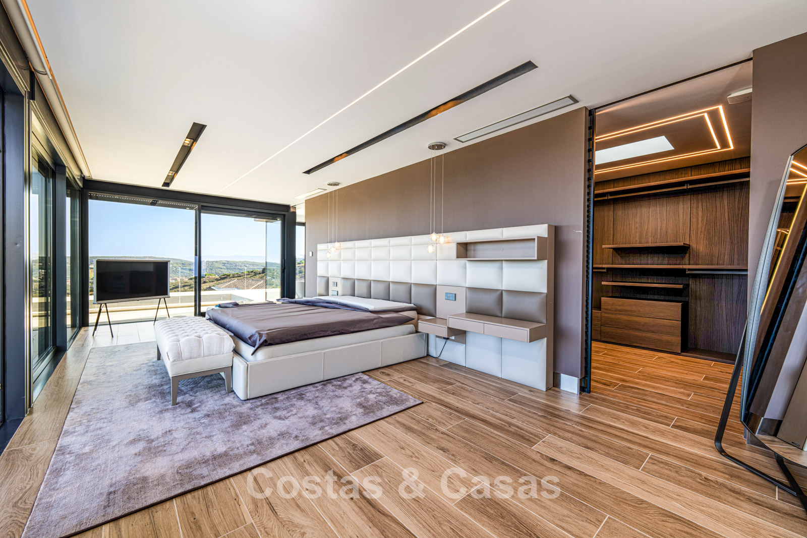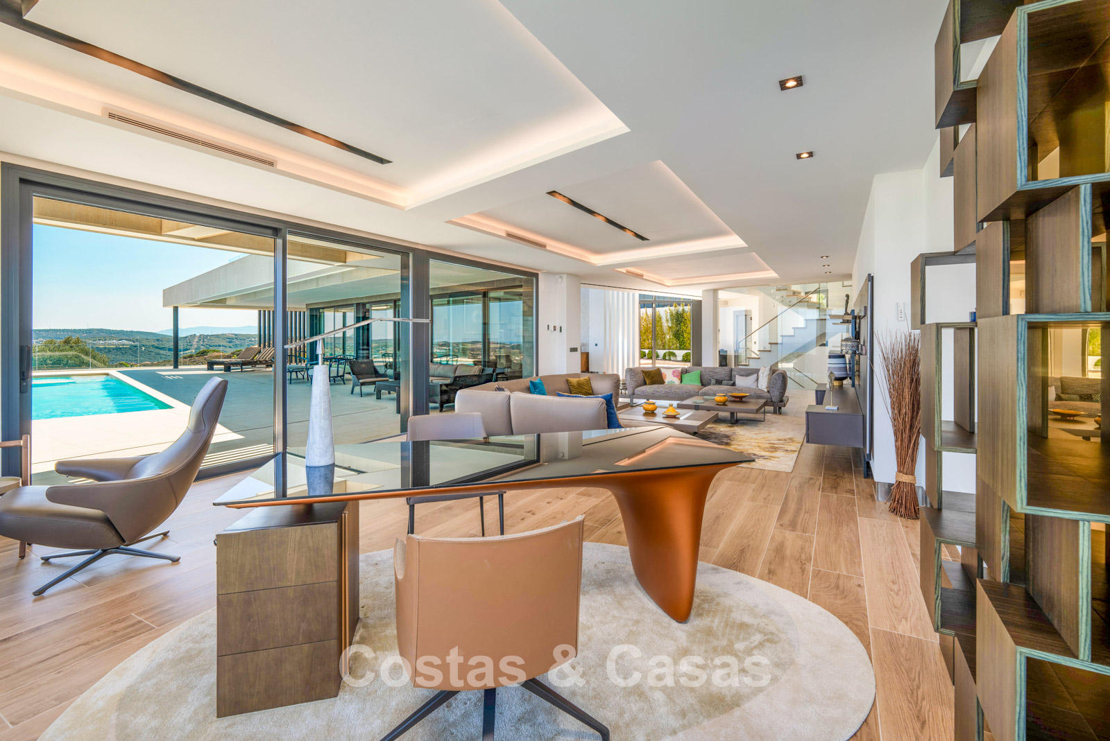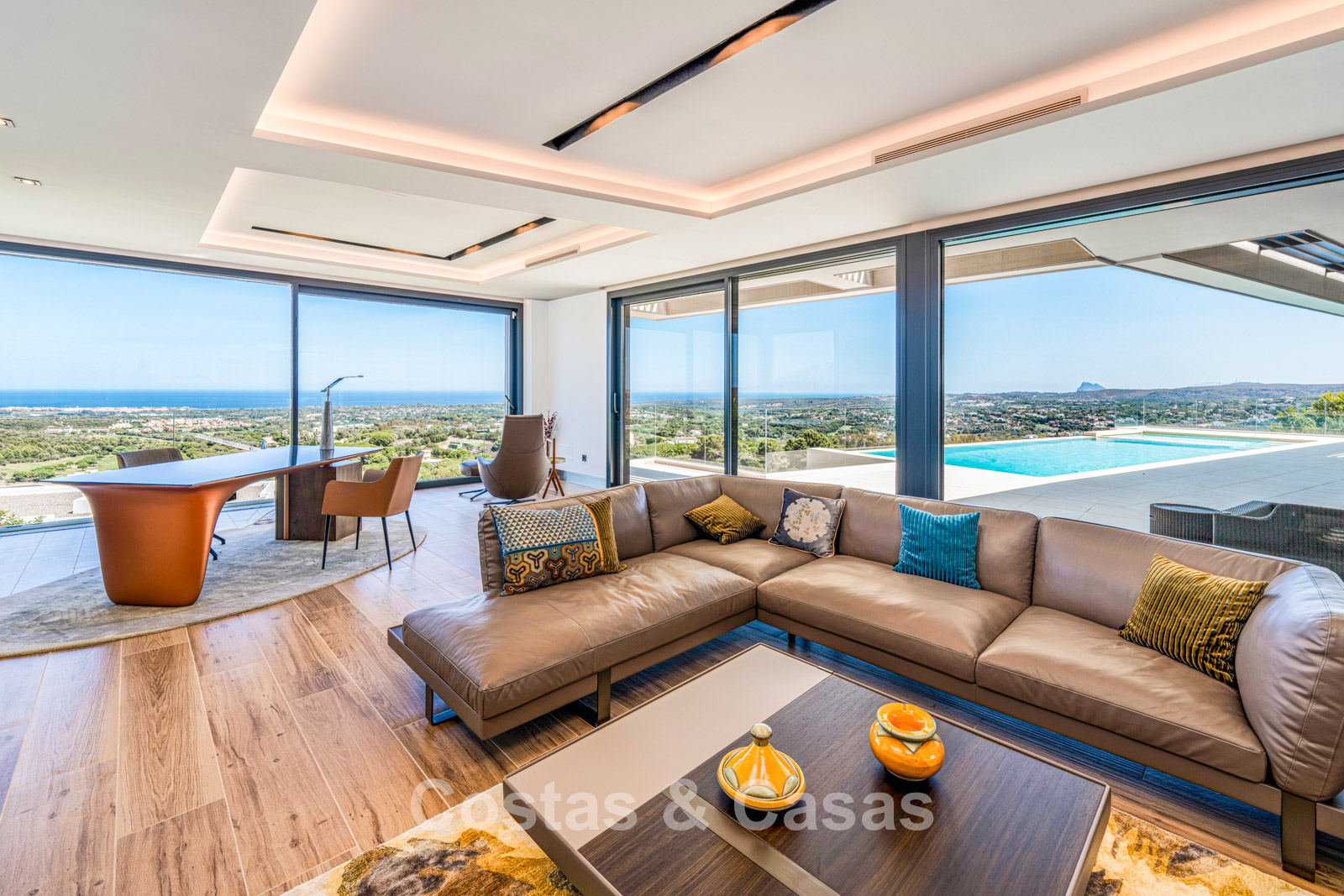 The villa is situated in an elevated position on a spacious, sloping plot. Manicured outdoor space with sustainably landscaped garden. Infinity pool with a built-in Jacuzzi and adjacent sun terrace. Extensive open and covered terraces are fitted with lounge facilities. Panoramic views of the surrounding area towards the Mediterranean Sea to the African continent.