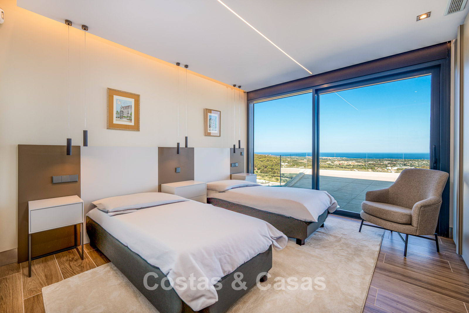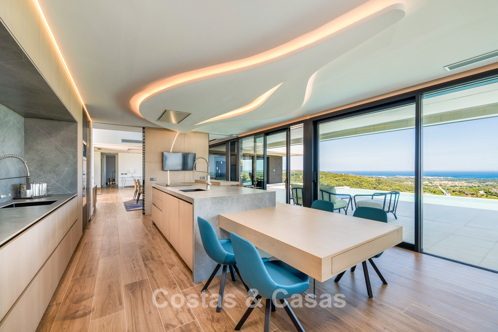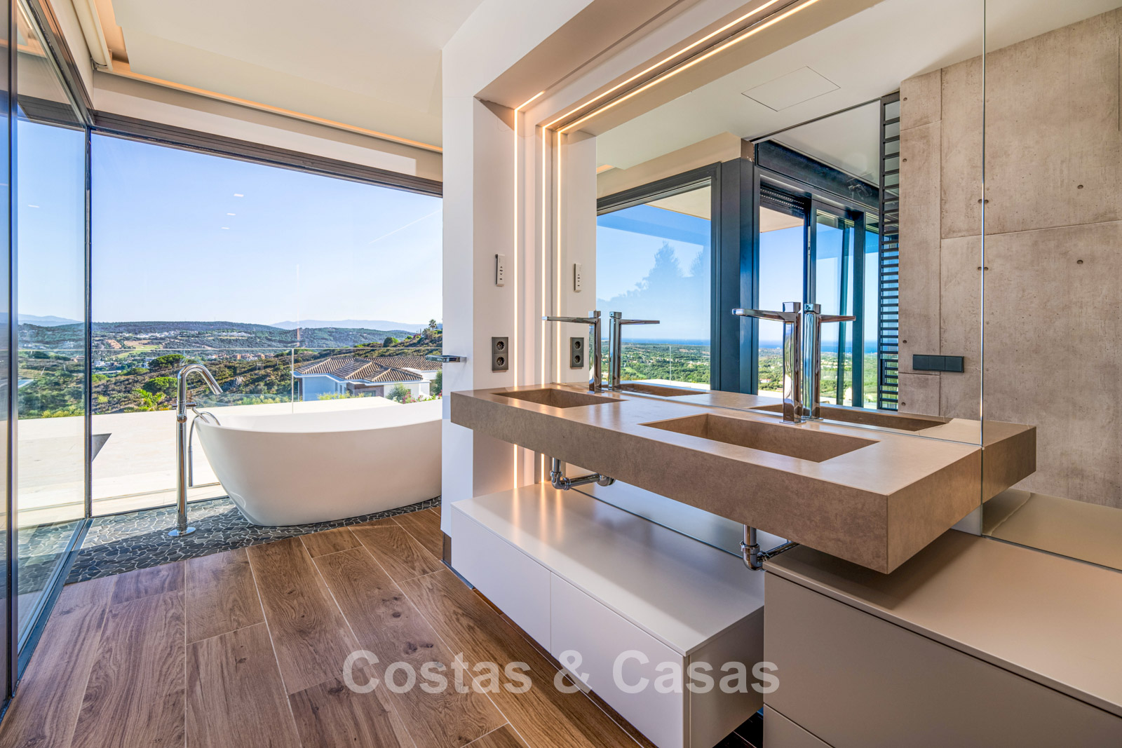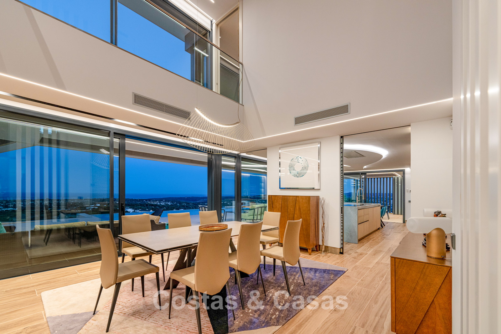 The villa is situated in an elevated position on a spacious, sloping plot. Manicured outdoor space with sustainably landscaped garden. Infinity pool with a built-in Jacuzzi and adjacent sun terrace. Extensive open and covered terraces are fitted with lounge facilities. Panoramic views of the surrounding area towards the Mediterranean Sea to the African continent.