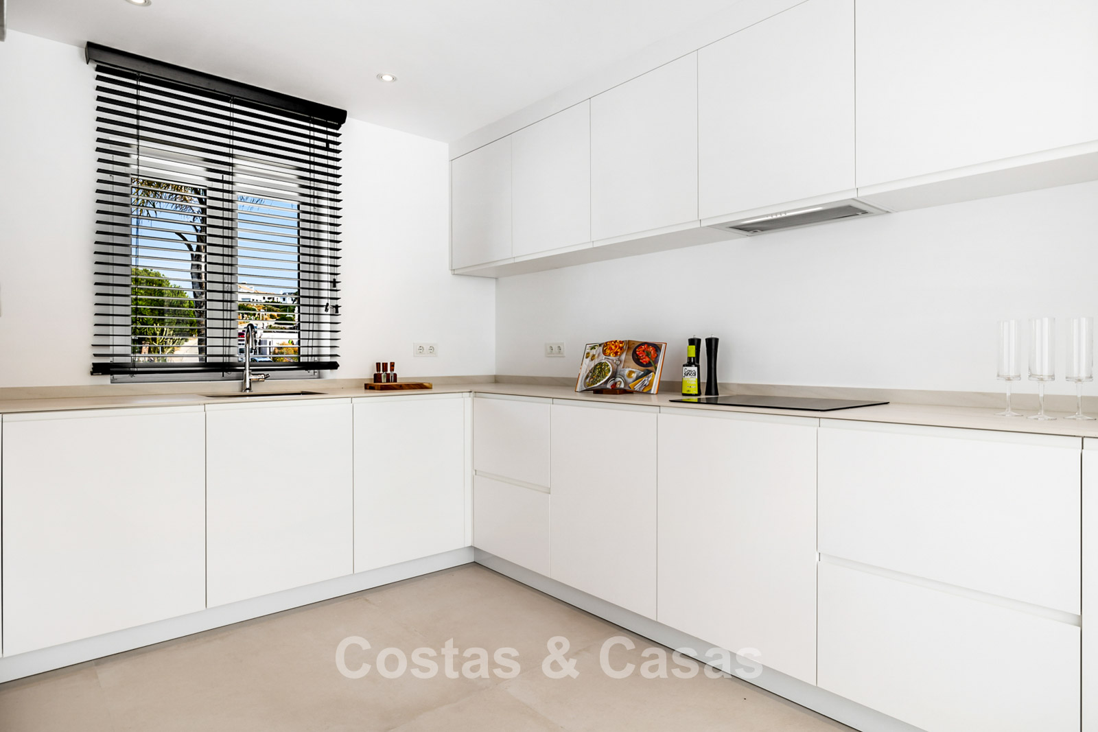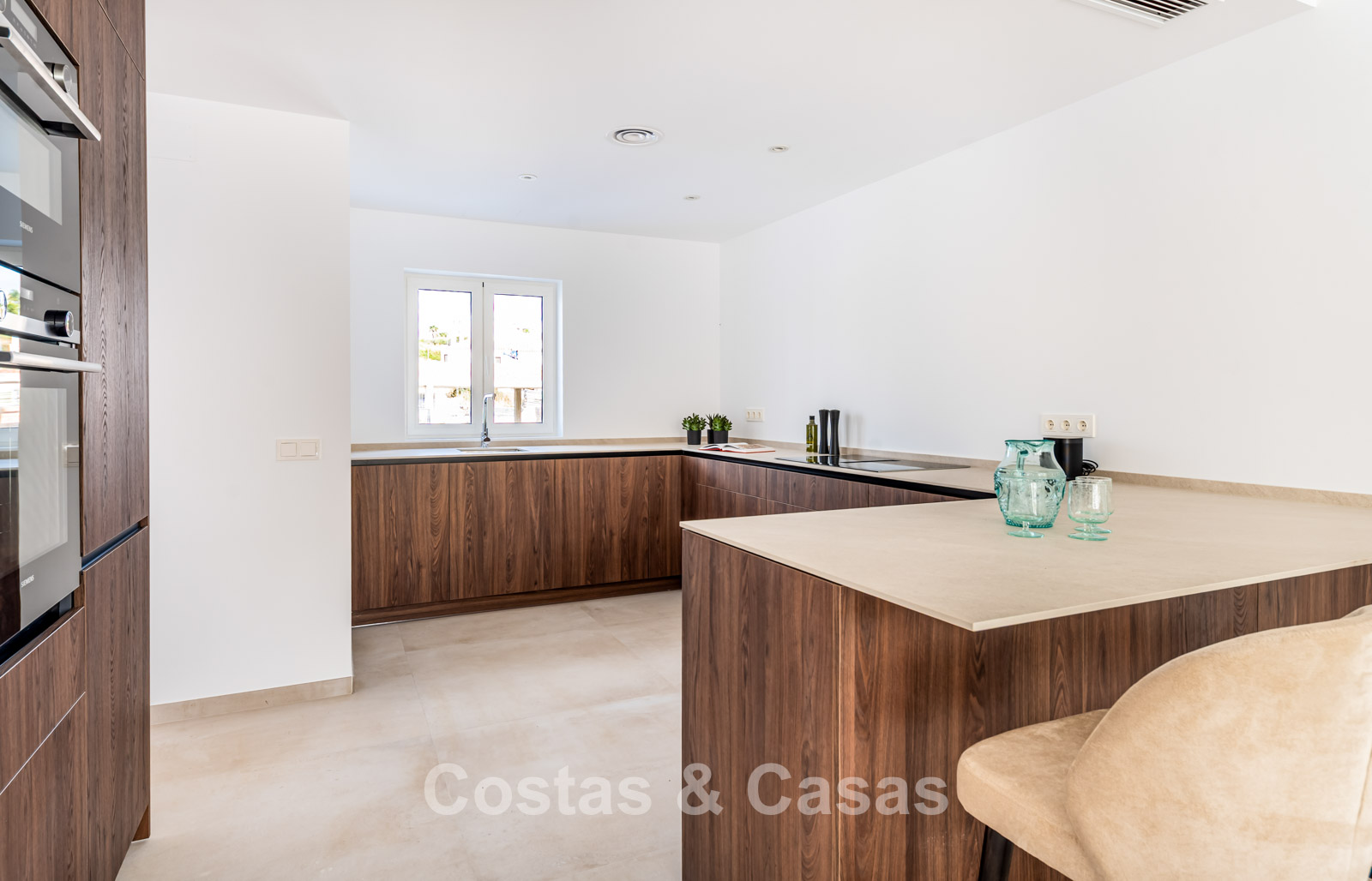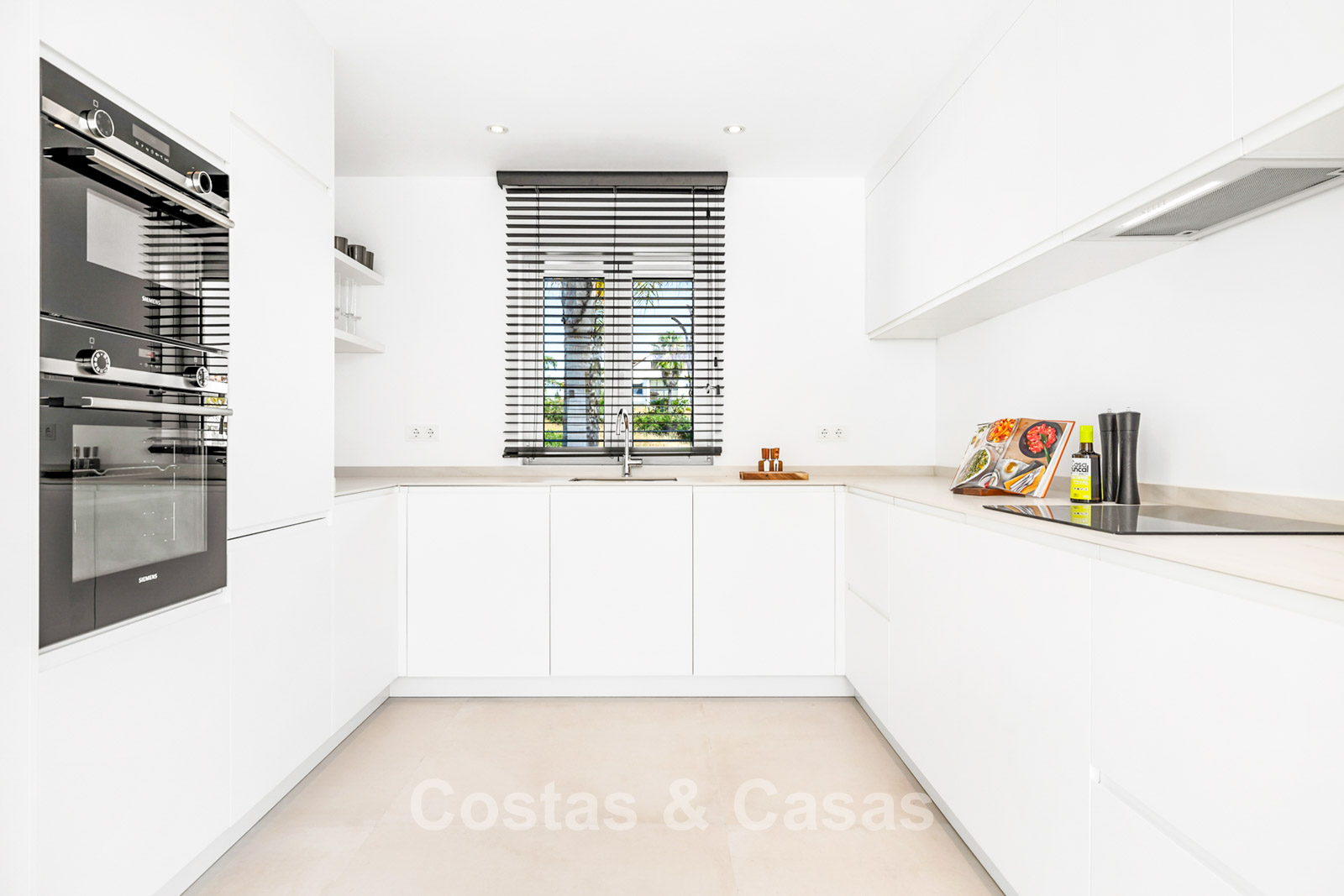 2 contemporary villas with Mediterranean influences, characterized by modern design, right next to each other. The villas exude Spanish elegance, with white walls and terracotta roofs that perfectly complement the luxurious, contemporary design and its timeless charm. High-quality materials are used. High sliding windows in the living room open onto the outdoor area and generate abundant natural light. Open-plan living space with a raised ceiling. Fully equipped kitchen with Siemens appliances. 4 bedrooms, 4 bathrooms, and a separate guest toilet. Large, cream-colored tiled floors. Attached garage for one car.
