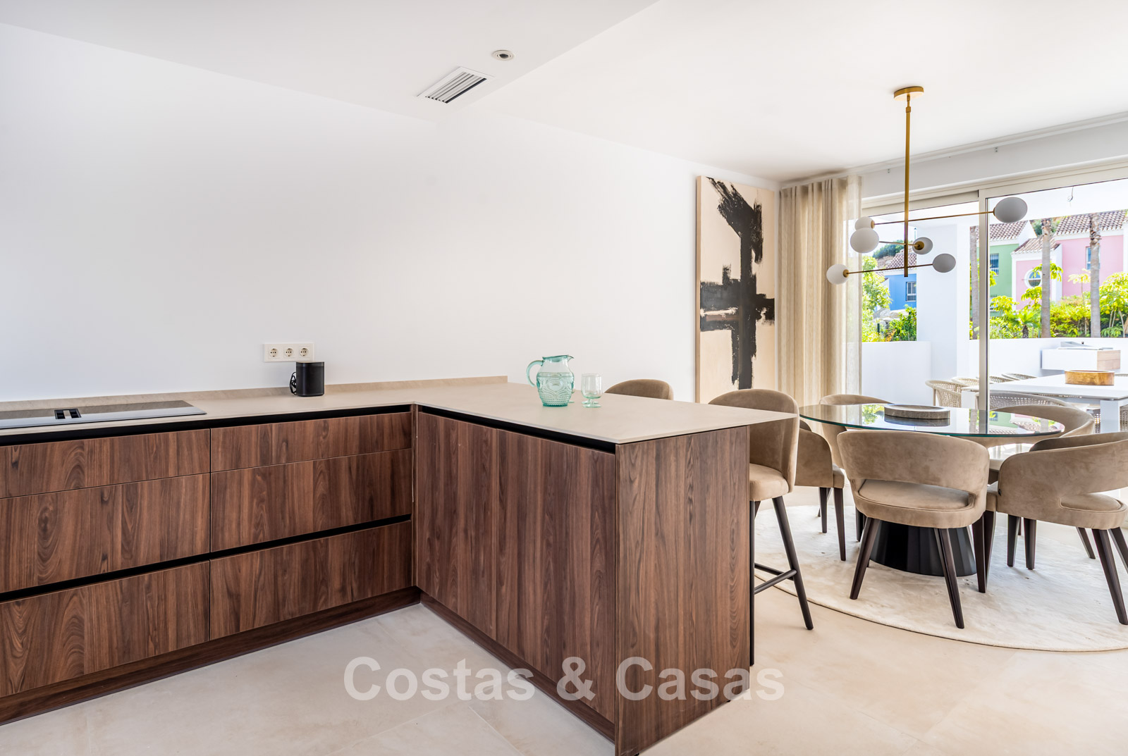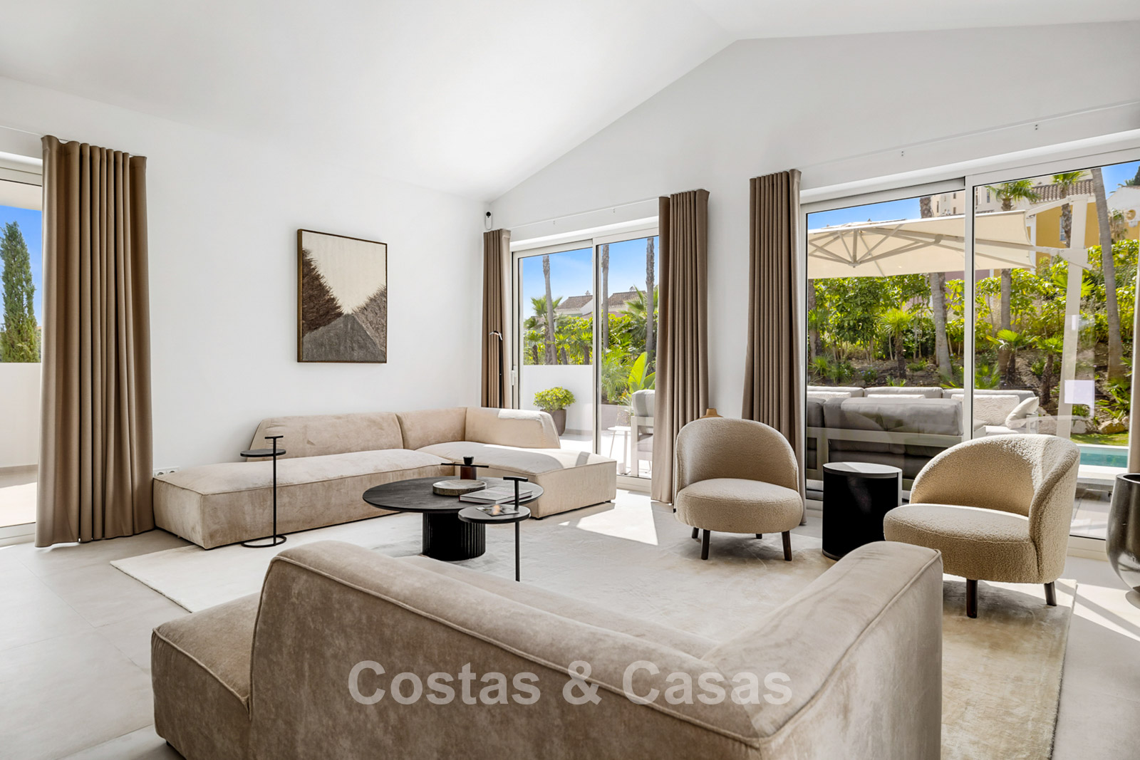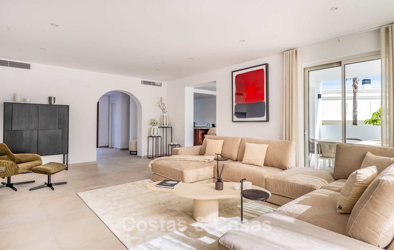 2 contemporary villas with Mediterranean influences, characterized by modern design, right next to each other. The villas exude Spanish elegance, with white walls and terracotta roofs that perfectly complement the luxurious, contemporary design and its timeless charm. High-quality materials are used. High sliding windows in the living room open onto the outdoor area and generate abundant natural light. Open-plan living space with a raised ceiling. Fully equipped kitchen with Siemens appliances. 4 bedrooms, 4 bathrooms, and a separate guest toilet. Large, cream-colored tiled floors. Attached garage for one car.
