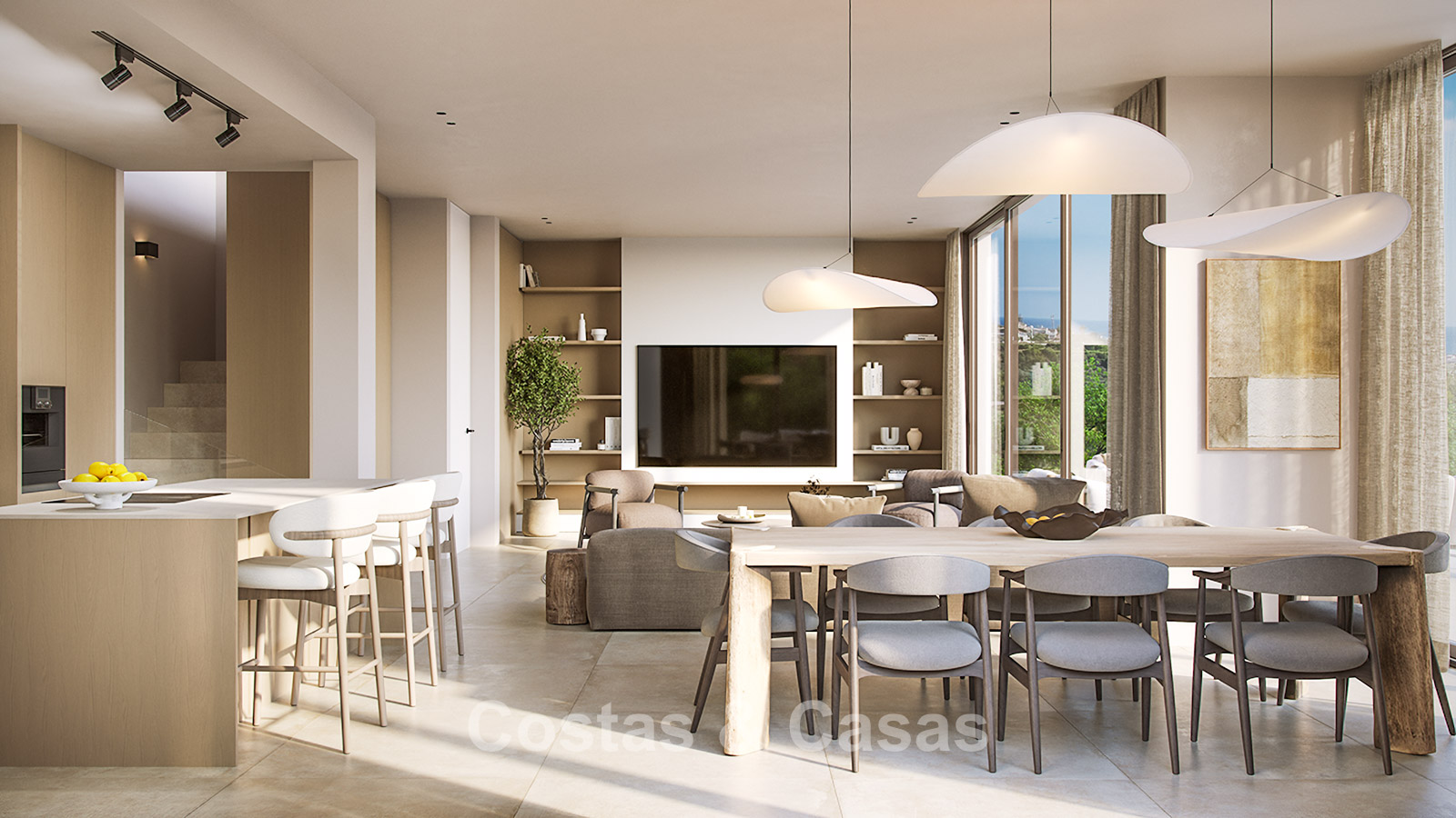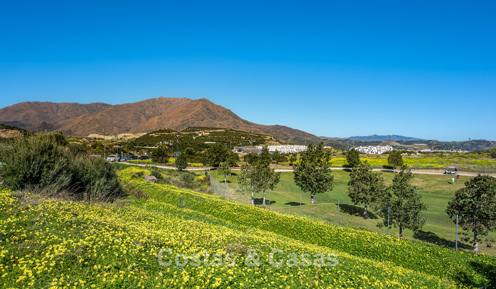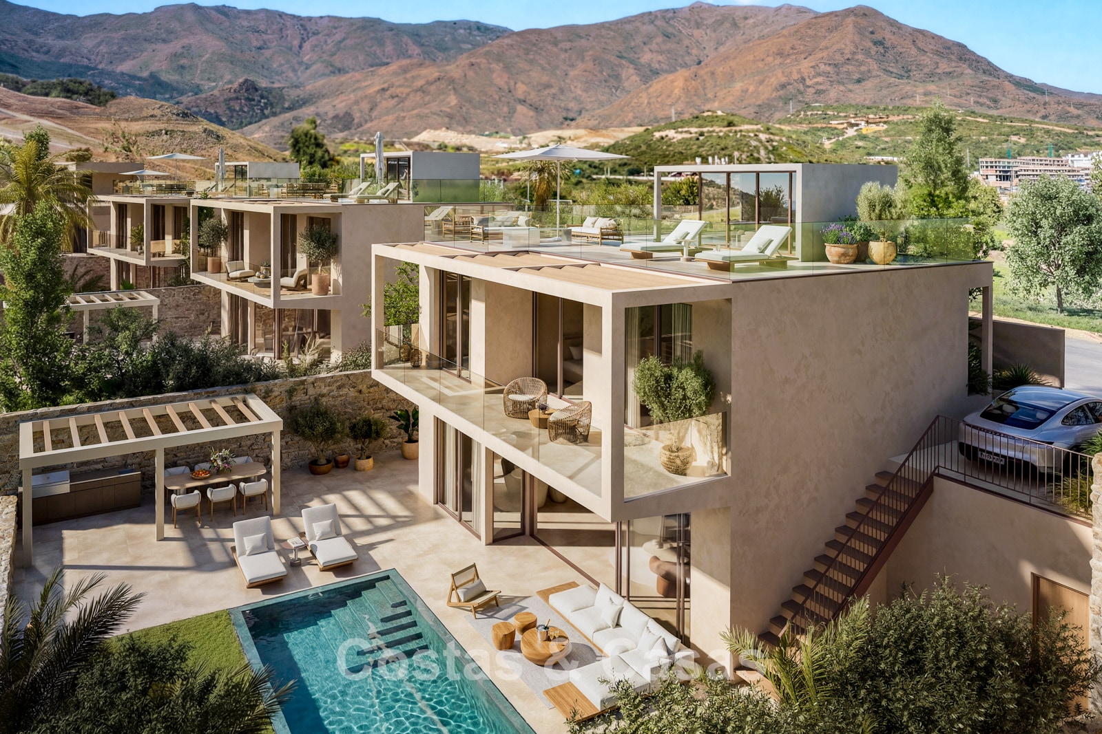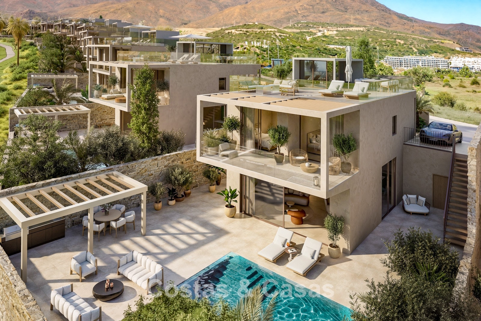 This exclusive development consists of just 17 modern villas in a timeless and elegant style. Each villa is set on a carefully enclosed plot directly bordering the expansive green fairways of the golf course, creating optimal privacy and open views of the surrounding mountain landscape. The garden is designed as a luxurious oasis, complete with a modern swimming pool, lounge area and an outdoor kitchen with adjoining dining space. In addition to spacious terraces, the properties also feature a generous rooftop solarium, providing extra outdoor living space. Only high-quality materials and refined finishes have been used throughout. Enjoy wide-ranging views over the golf course, the sea and the surrounding landscape. All villas come with their own private swimming pool. Large sliding windows with recessed frames create a seamless connection between indoor and outdoor living, allowing abundant natural light to flood the interiors and enhancing the bright, open-plan design. Open-plan living area with a TV lounge and integrated dining space. Fully fitted bespoke kitchen equipped with high-end appliances and a central island with seating. Floors finished with large-format porcelain tiles. Utility room, storage room and technical room. Private parking on the plot.