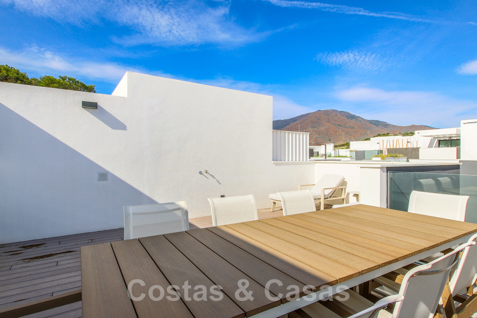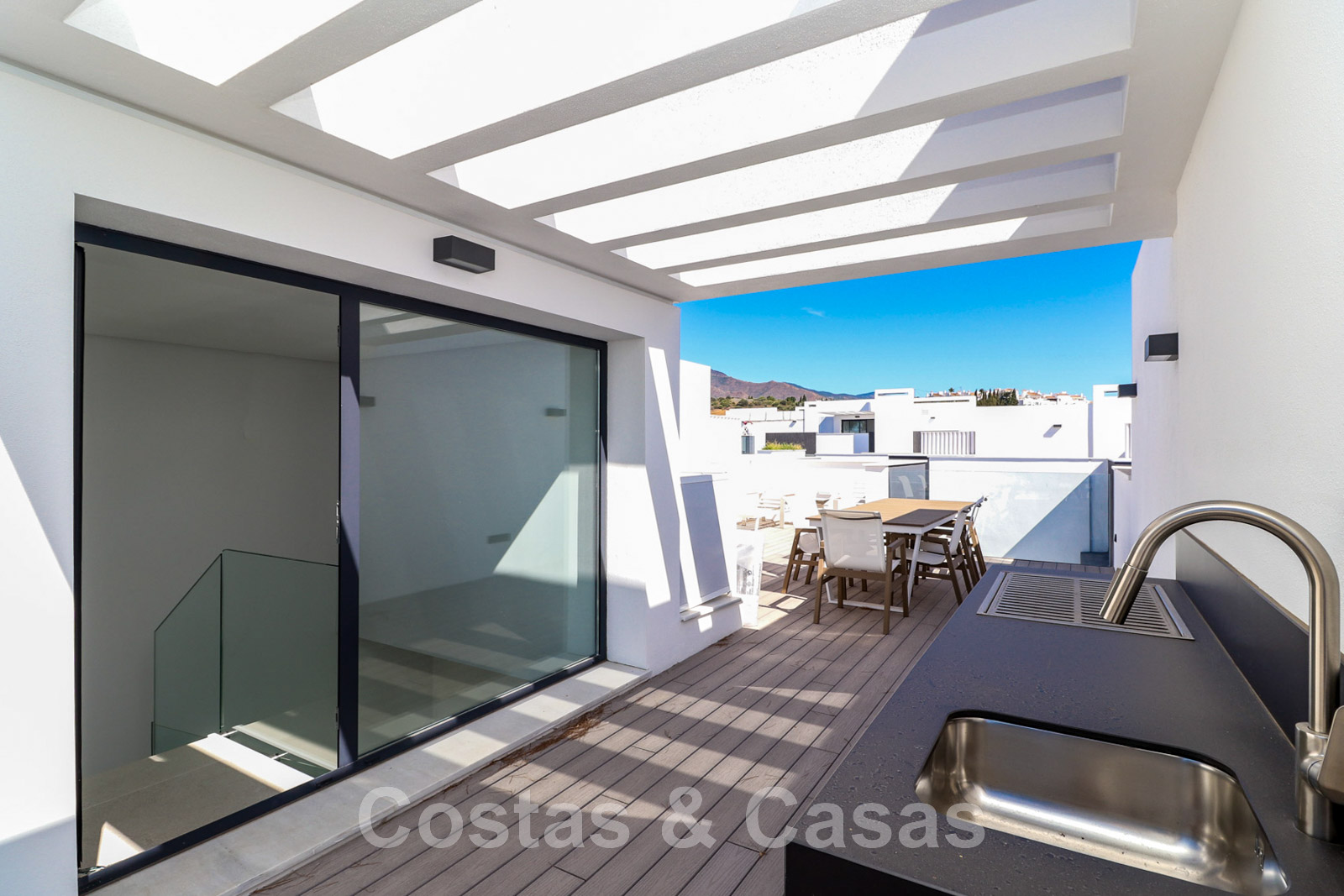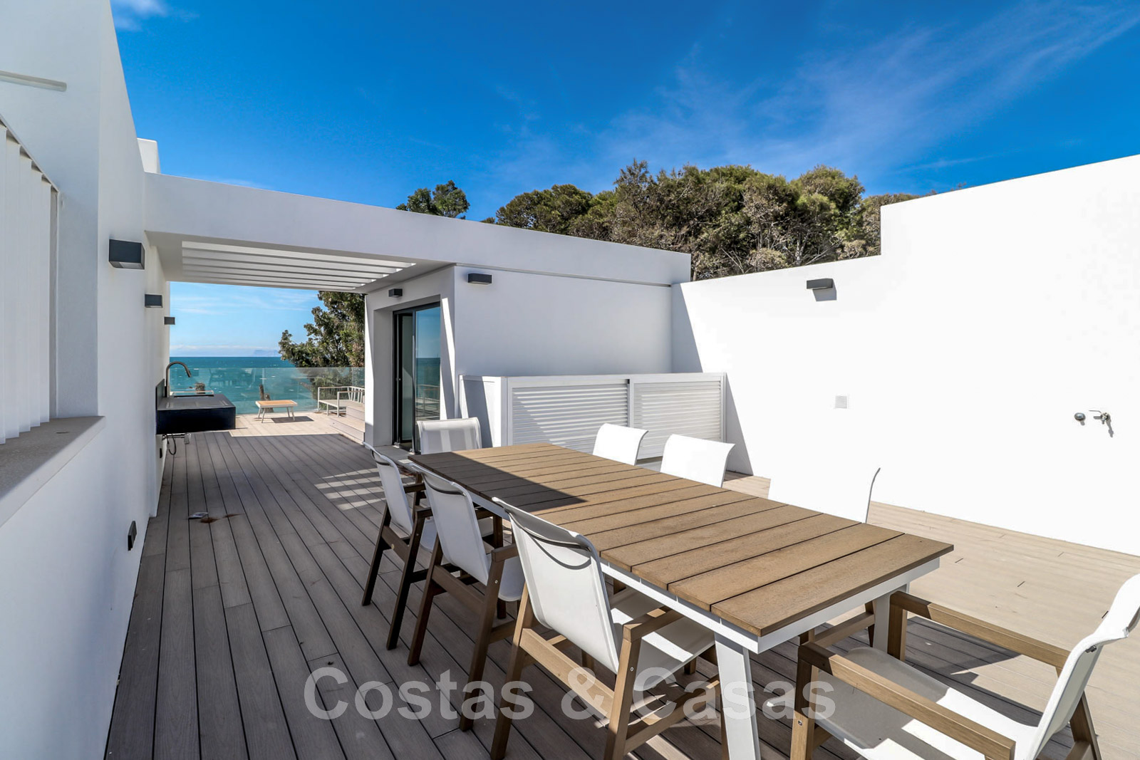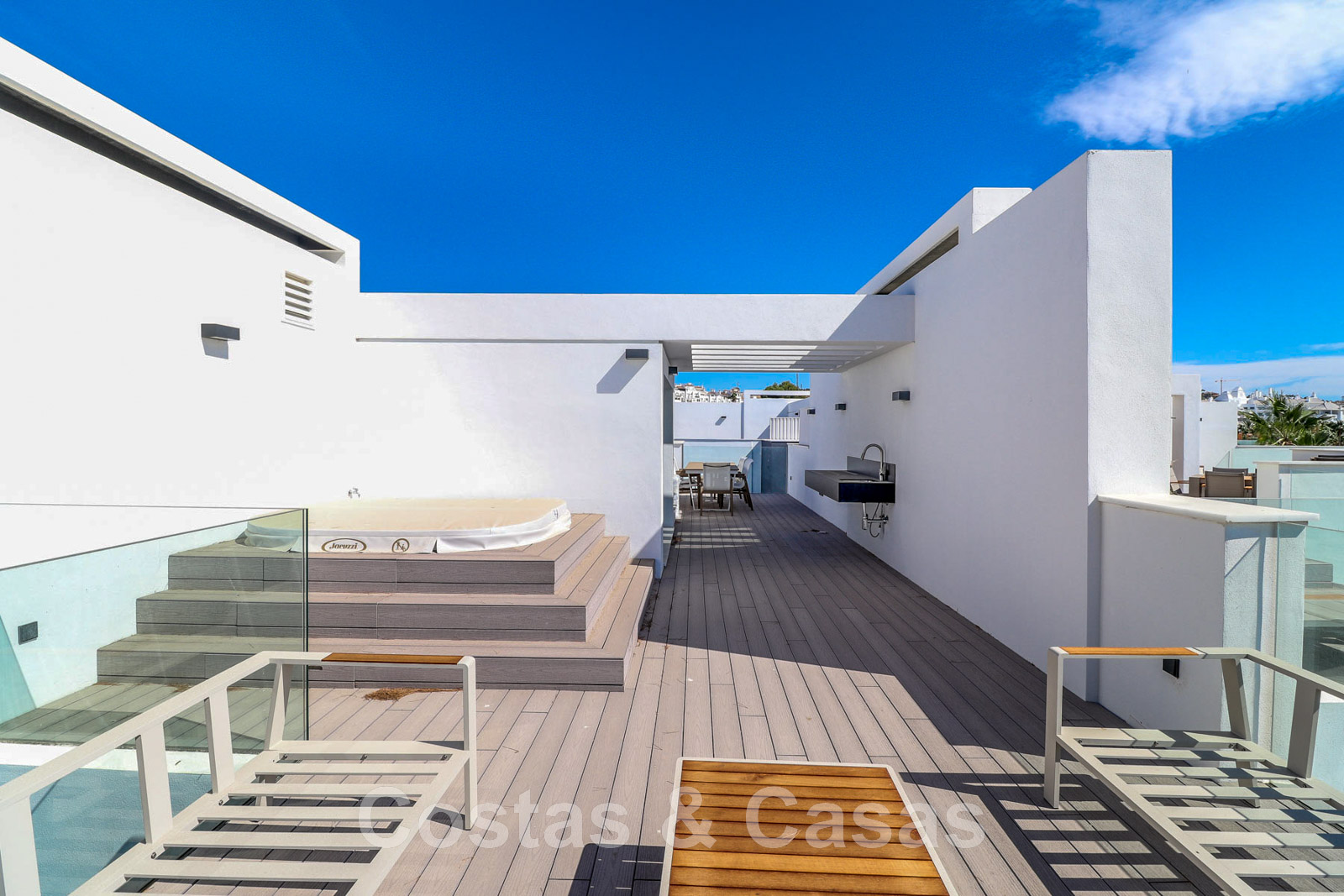 Luxurious townhouse with sleek, contemporary architecture. Corner house on the first row of the beach complex. Featuring high-quality materials and refined finishes. Expansive solarium with a built-in jacuzzi, a chill-out area, and an outdoor kitchen with al fresco dining. South-facing. Frontal views of the Mediterranean Sea. Open-plan concept. Living room with a TV lounge and integrated dining table. The living area opens onto a partially covered terrace, equipped with a lounge and dining area, ideal for al fresco meals. Adjacent is a private garden. Open-plan gourmet kitchen, fully equipped with Neff appliances and a cooking island. High sliding windows provide natural light. High-quality tiled floors. 3 bedrooms and 3 bathrooms. Underground garage.