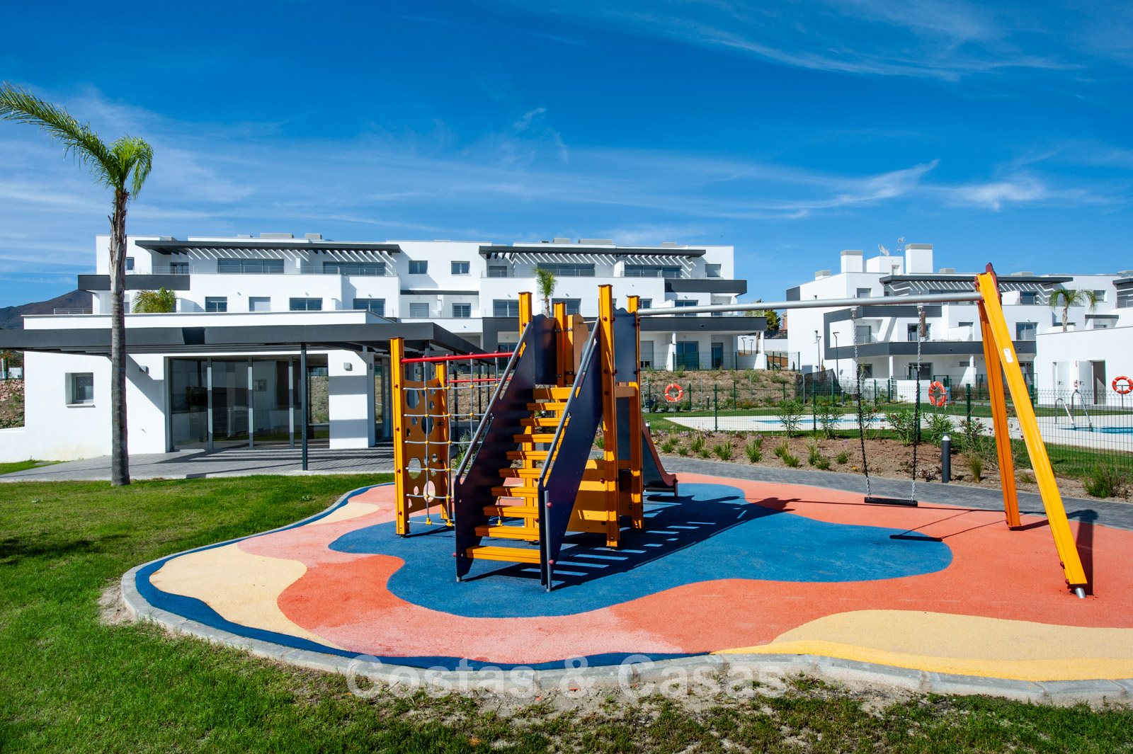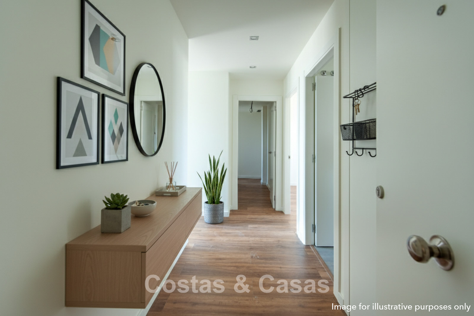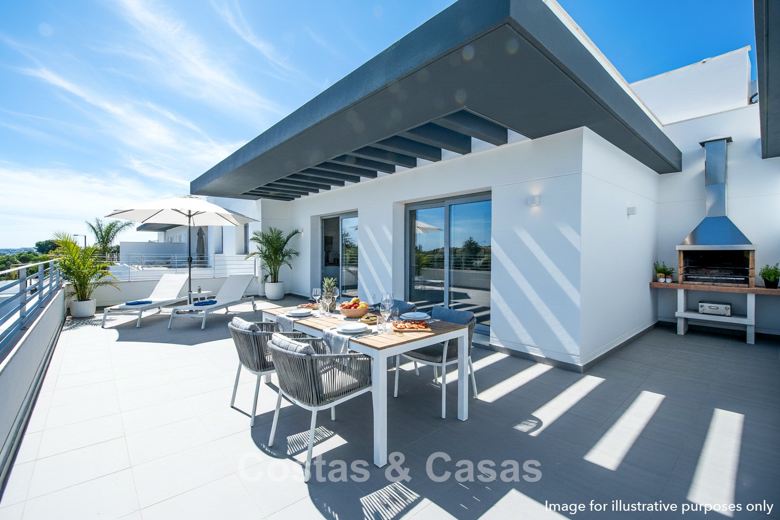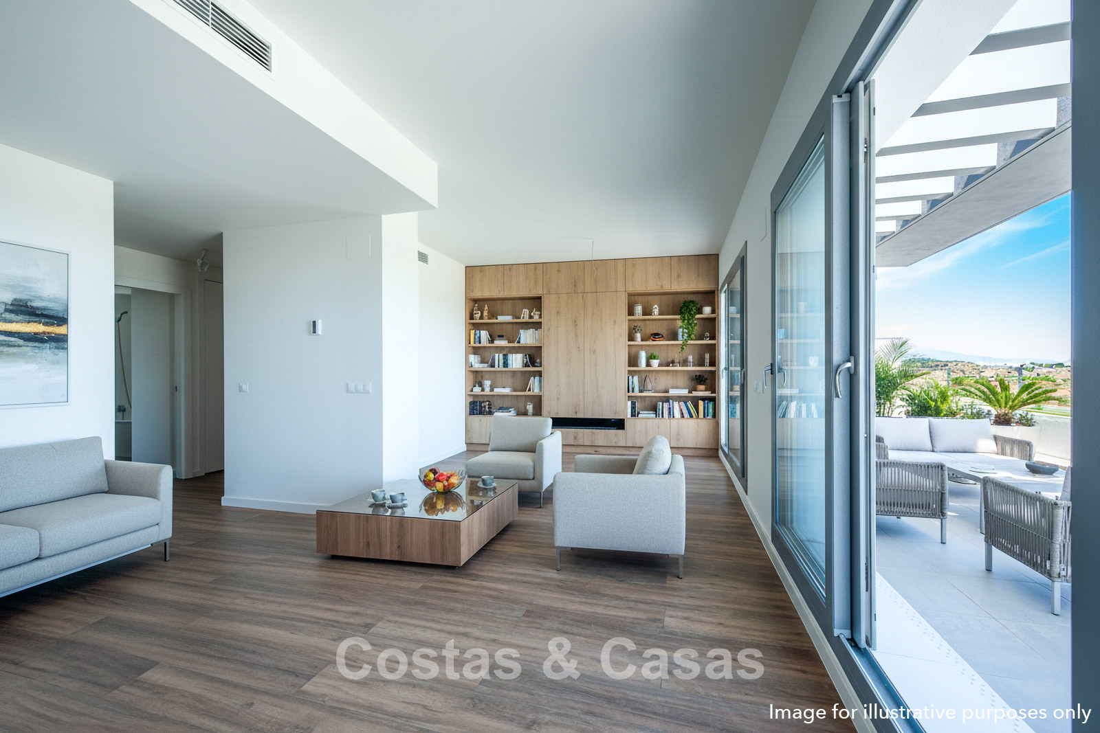 Brand new, contemporary top-floor apartment. Designed with light, comfort, and functionality in mind. South-facing. Unobstructed views of the green fairways and the Mediterranean Sea. Thanks to the two tall sliding windows in the living area, you can enjoy maximum natural light and a spacious, open feeling. A spacious, semi-covered terrace, complete with a stylish stone pergola. Contemporary open-plan living space with a seamless transition between the living room, dining area, and kitchen. Practical, partially equipped kitchen. Hallway with hallway closet. Storage room and garage space included.