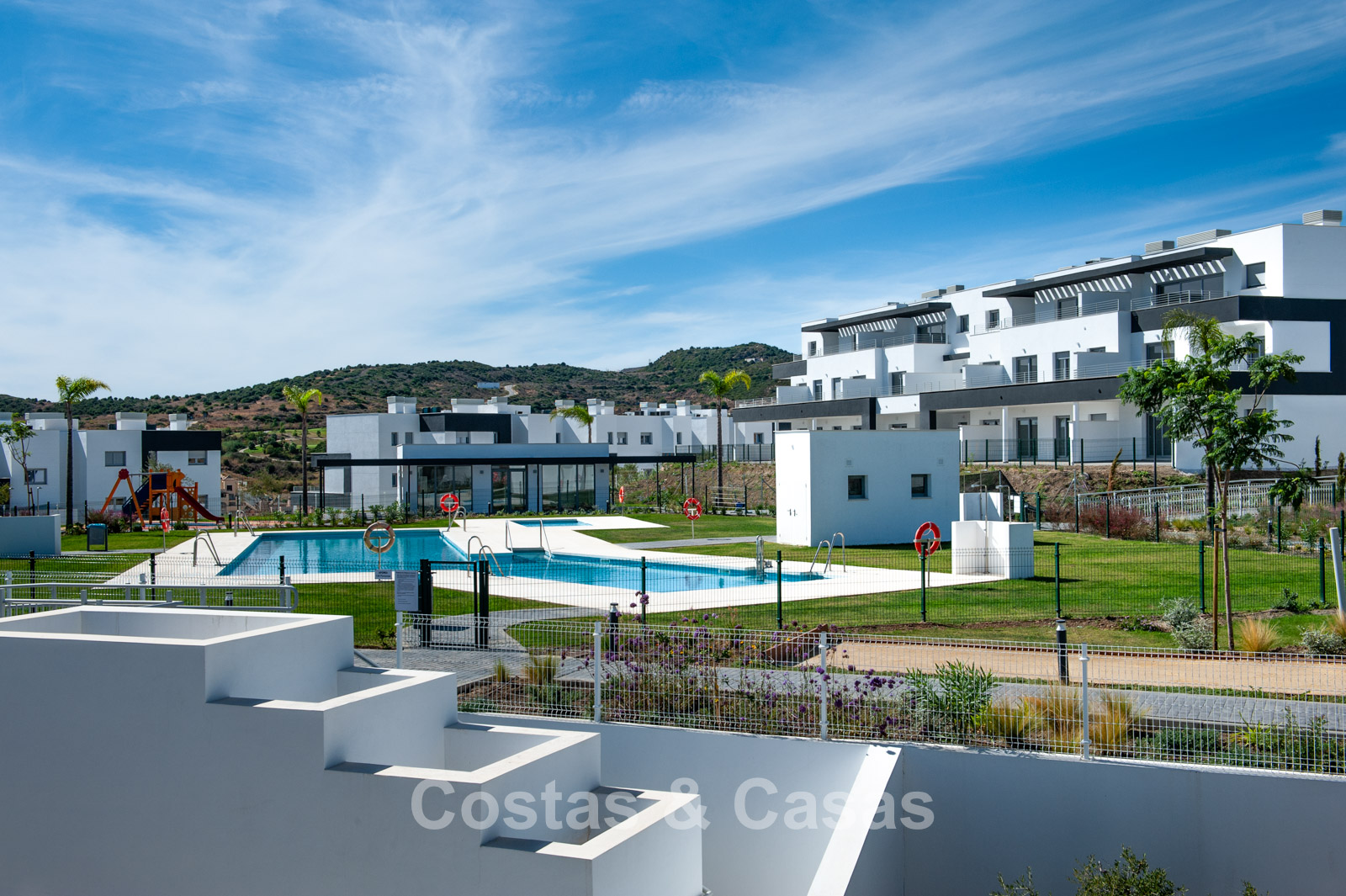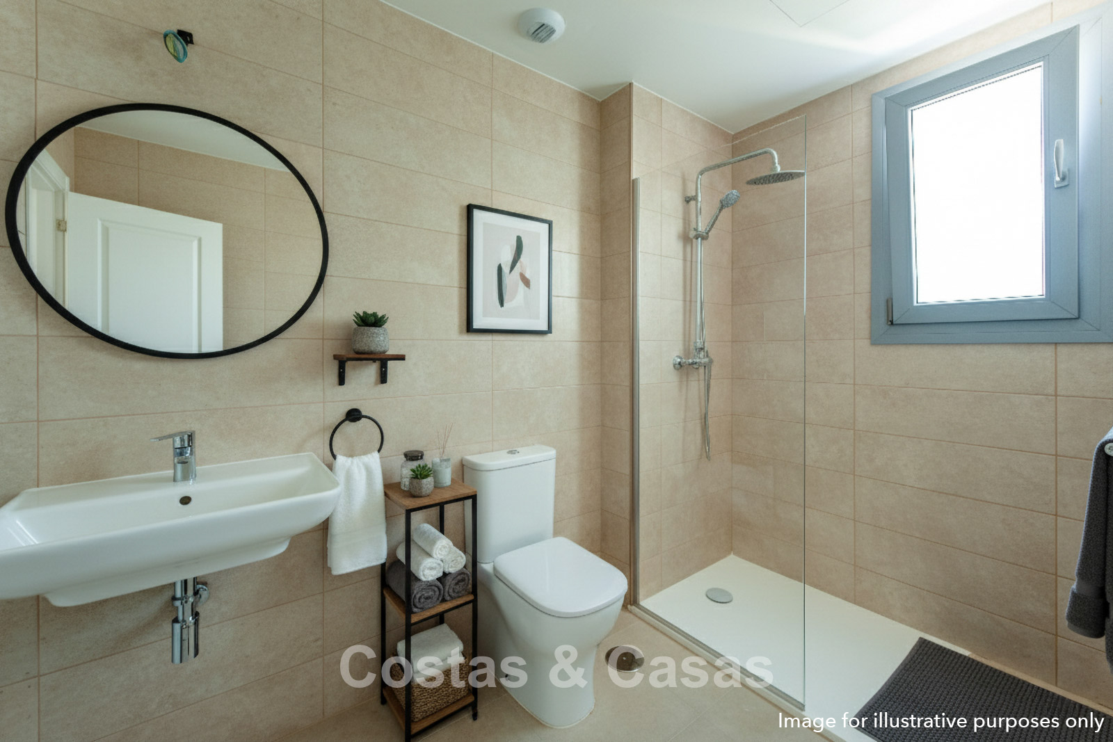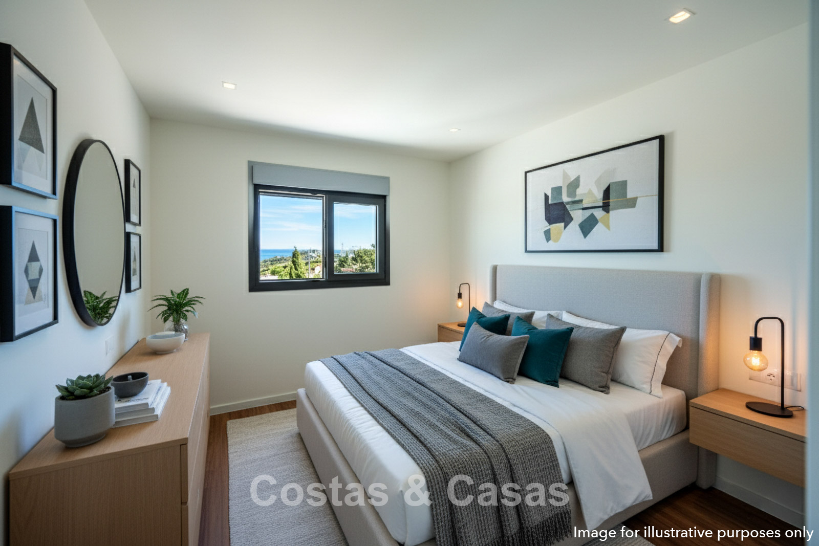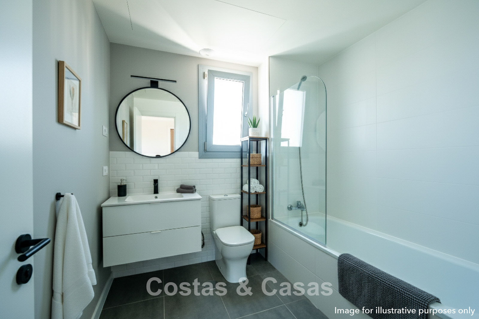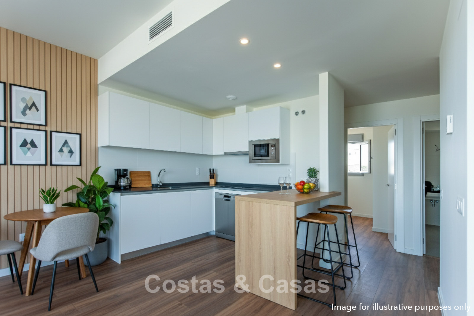 Brand new, contemporary top-floor apartment. Designed with light, comfort, and functionality in mind. South-facing. Unobstructed views of the green fairways and the Mediterranean Sea. Thanks to the two tall sliding windows in the living area, you can enjoy maximum natural light and a spacious, open feeling. A spacious, semi-covered terrace, complete with a stylish stone pergola. Contemporary open-plan living space with a seamless transition between the living room, dining area, and kitchen. Practical, partially equipped kitchen. Hallway with hallway closet. Storage room and garage space included.