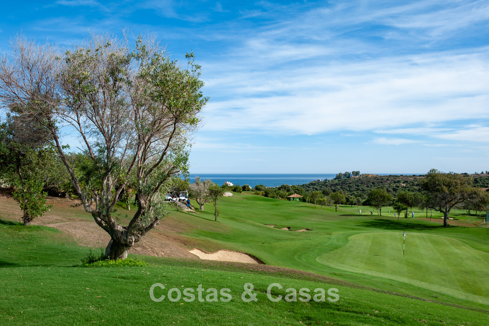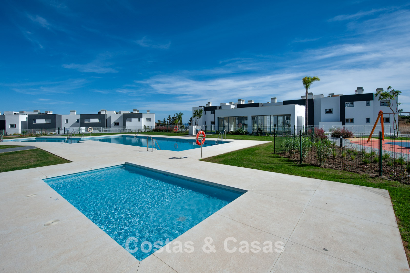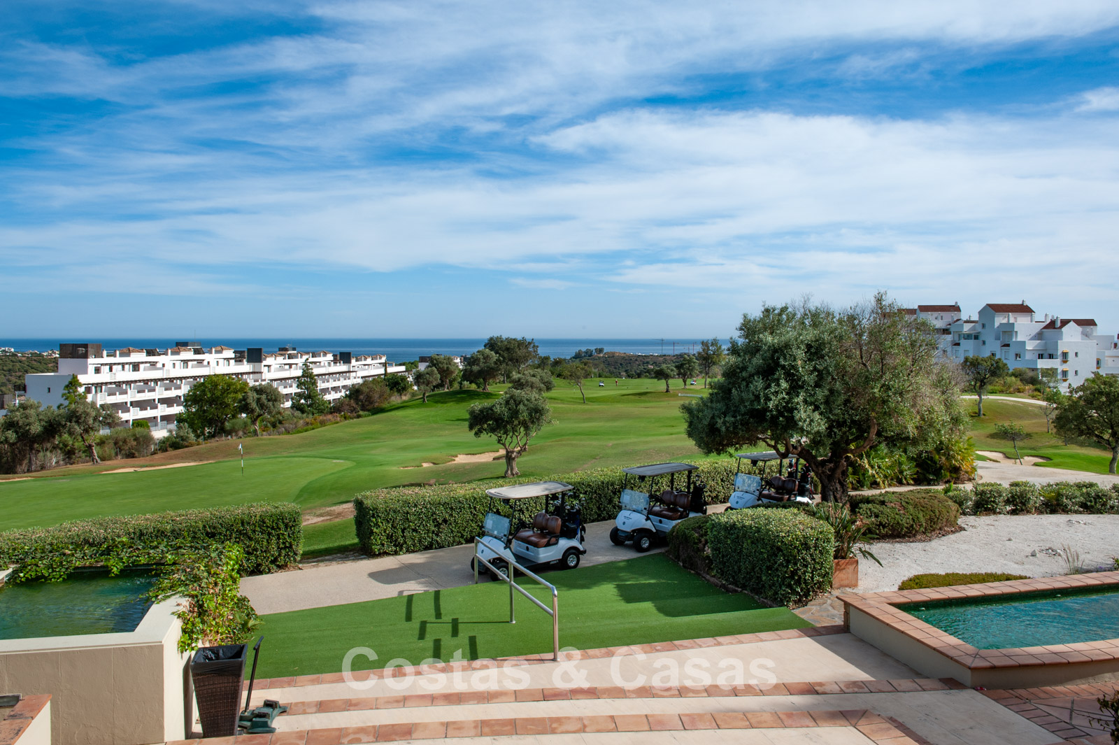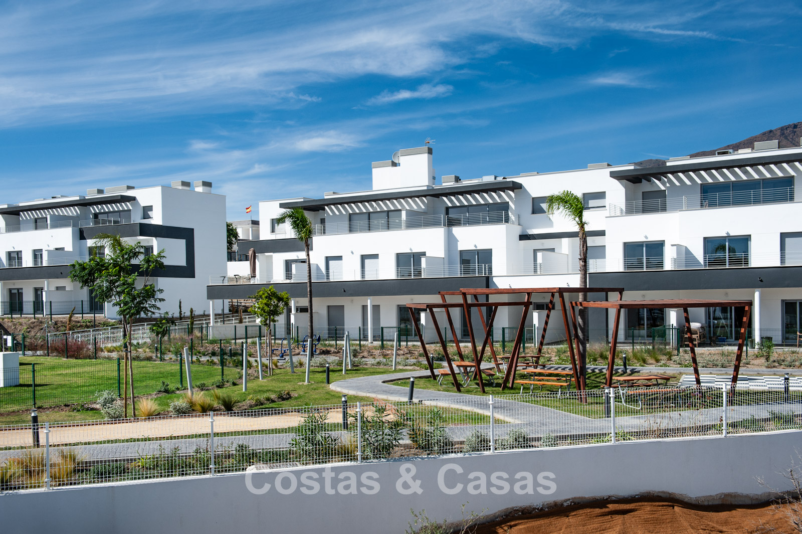 Brand new, contemporary top-floor apartment. Designed with light, comfort, and functionality in mind. South-facing. Unobstructed views of the green fairways and the Mediterranean Sea. Thanks to the two tall sliding windows in the living area, you can enjoy maximum natural light and a spacious, open feeling. A spacious, semi-covered terrace, complete with a stylish stone pergola. Contemporary open-plan living space with a seamless transition between the living room, dining area, and kitchen. Practical, partially equipped kitchen. Hallway with hallway closet. Storage room and garage space included.