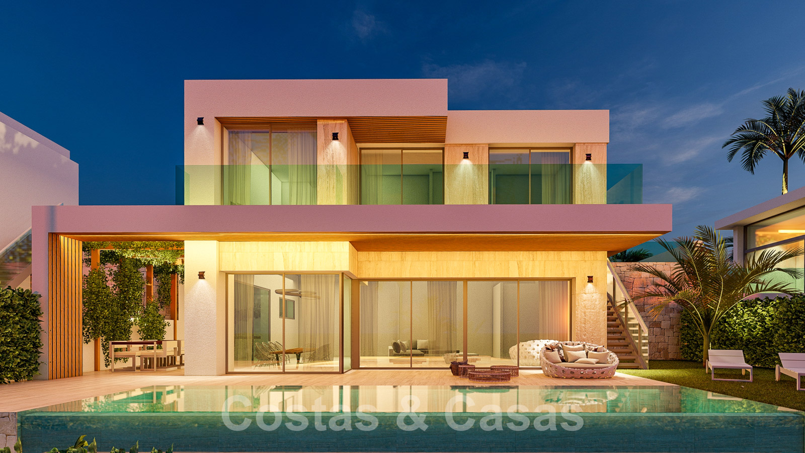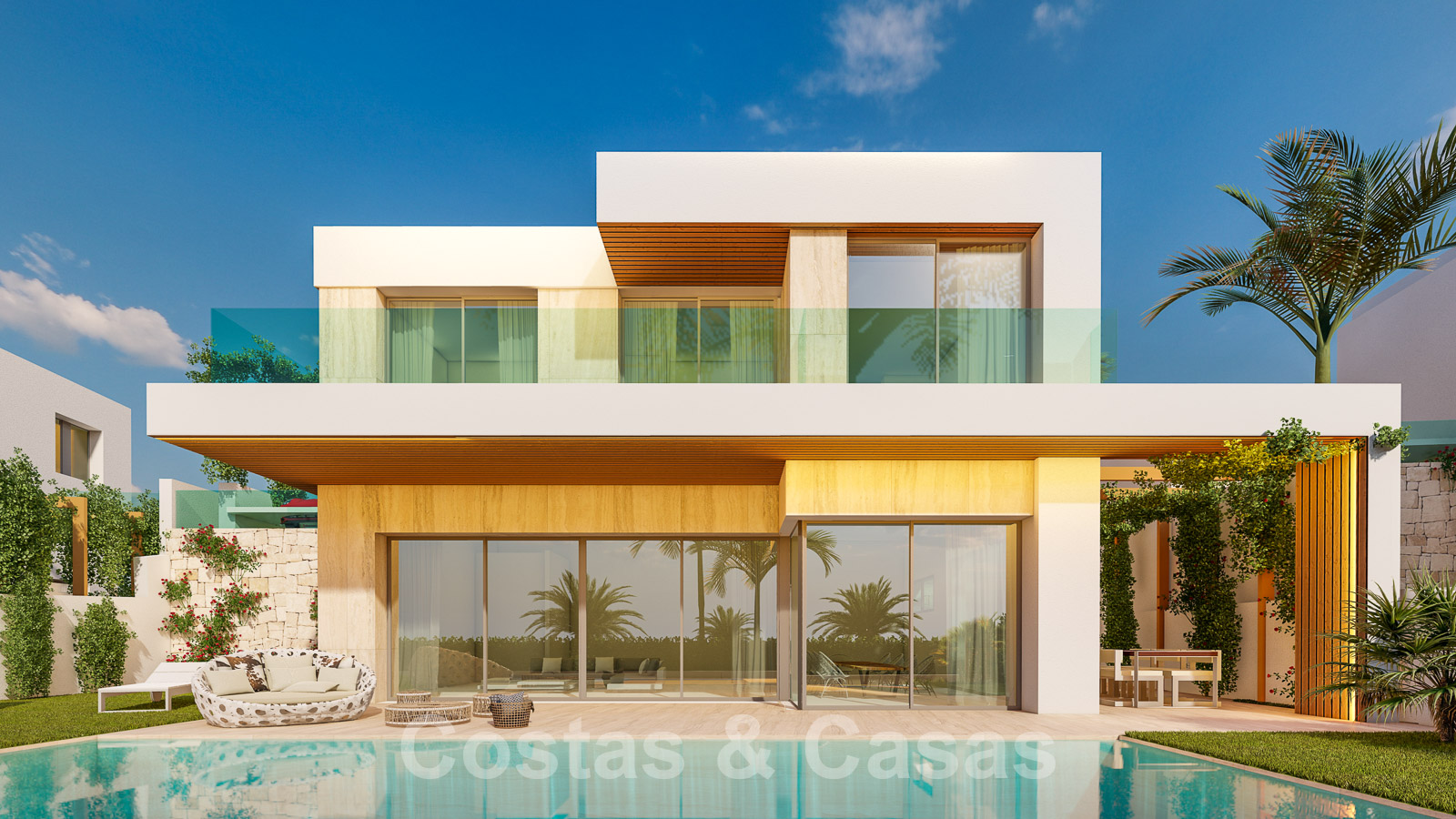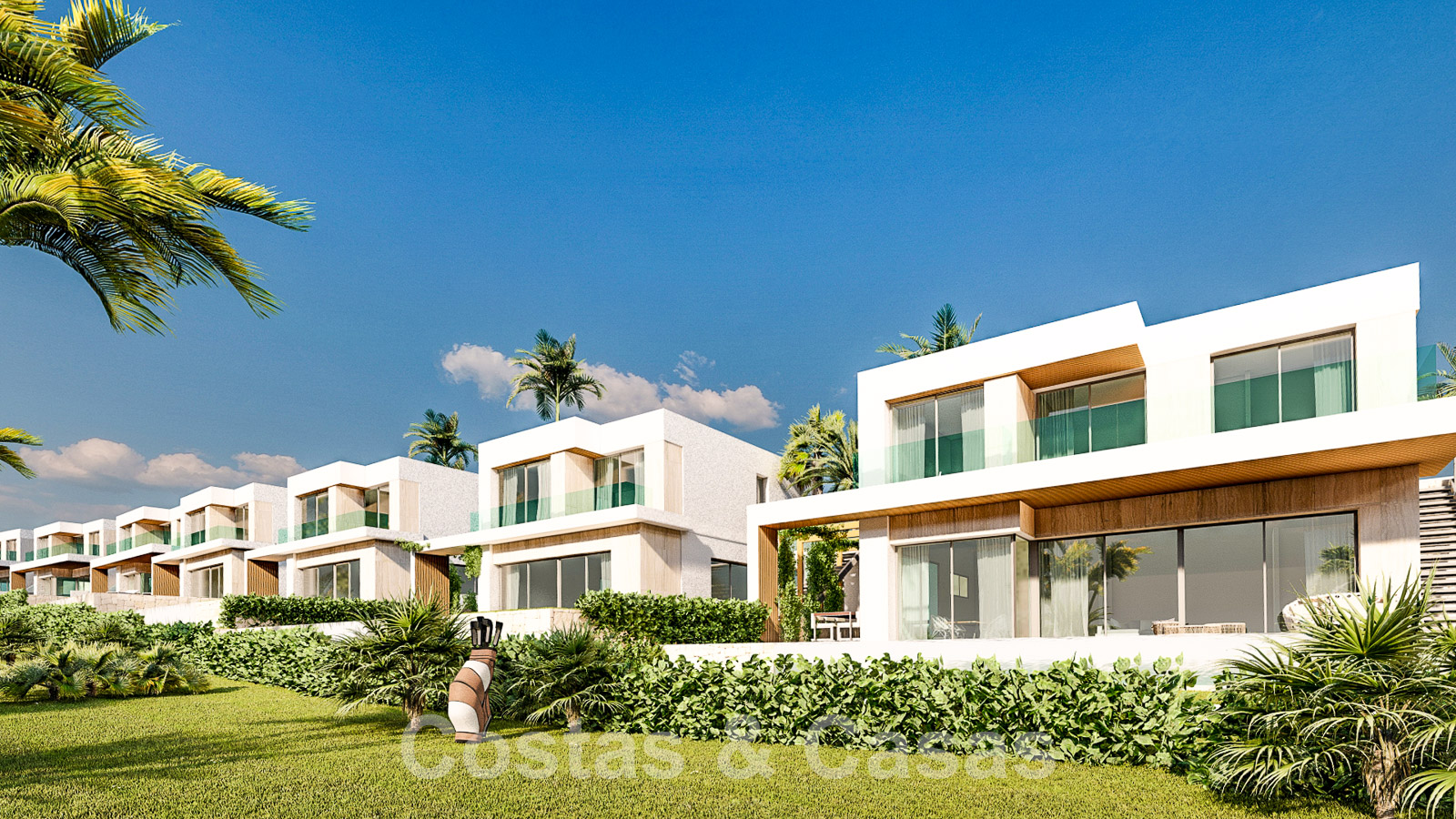 Manicured gardens with a private saltwater swimming pool and adjacent sun terrace. Open and covered terraces with ample space for relaxation. Oriented from south to south-west with magnificent views over the golf courses towards the Mediterranean Sea. The villas have two residential floors.