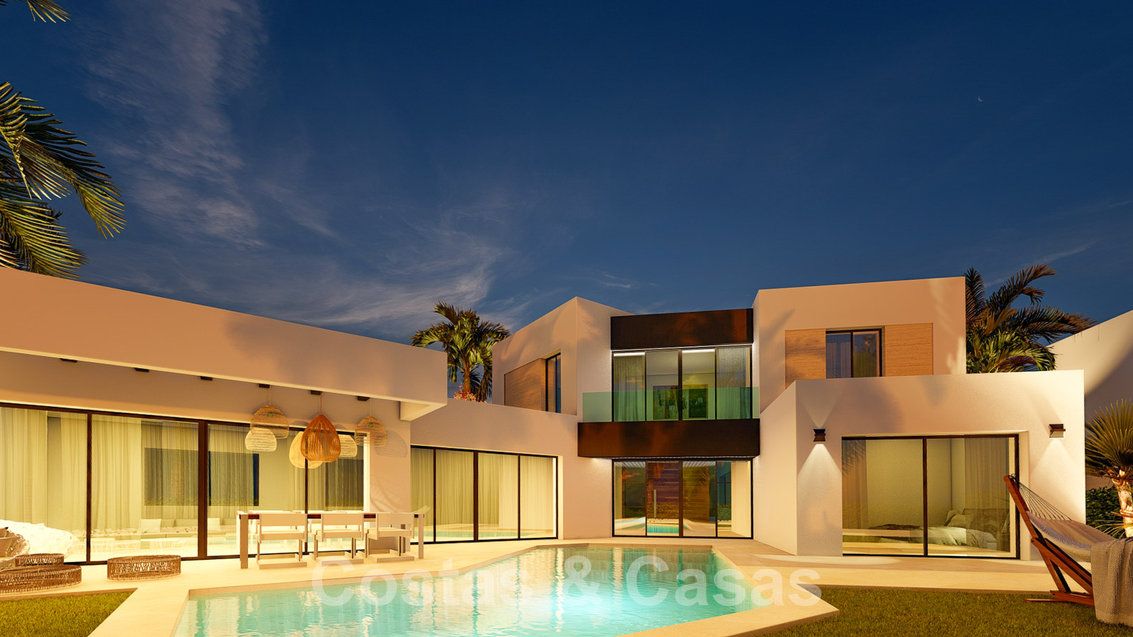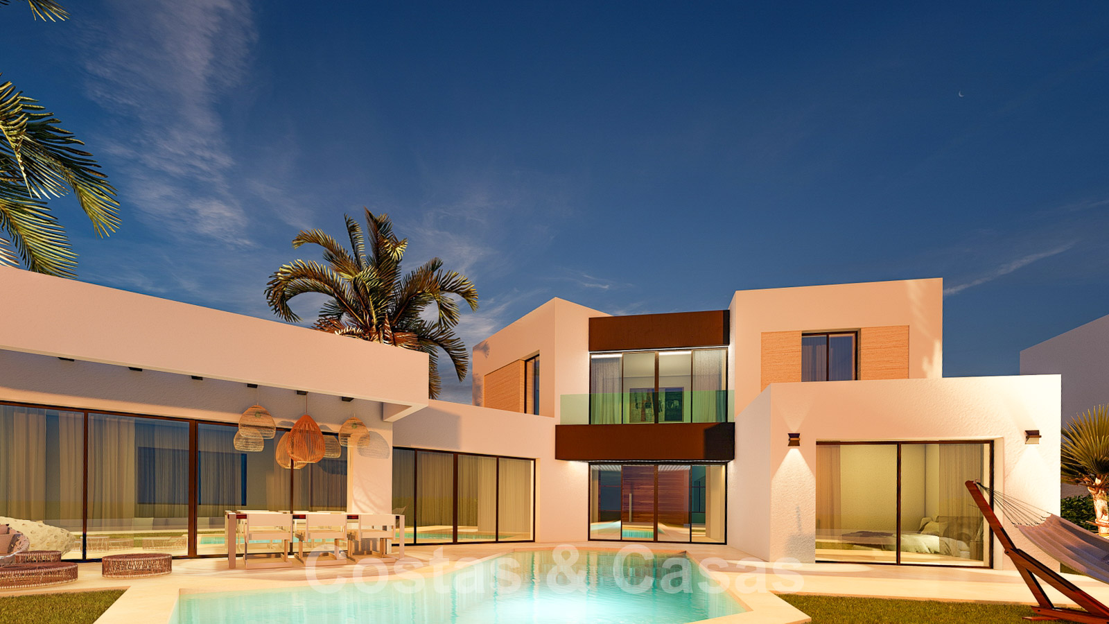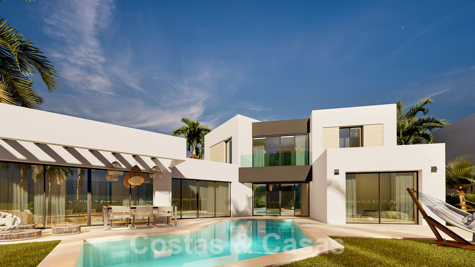 Manicured gardens with a private saltwater swimming pool and adjacent sun terrace. Open and covered terraces with ample space for relaxation. Oriented from south to south-west with magnificent views over the golf courses towards the Mediterranean Sea. The villas have two residential floors.