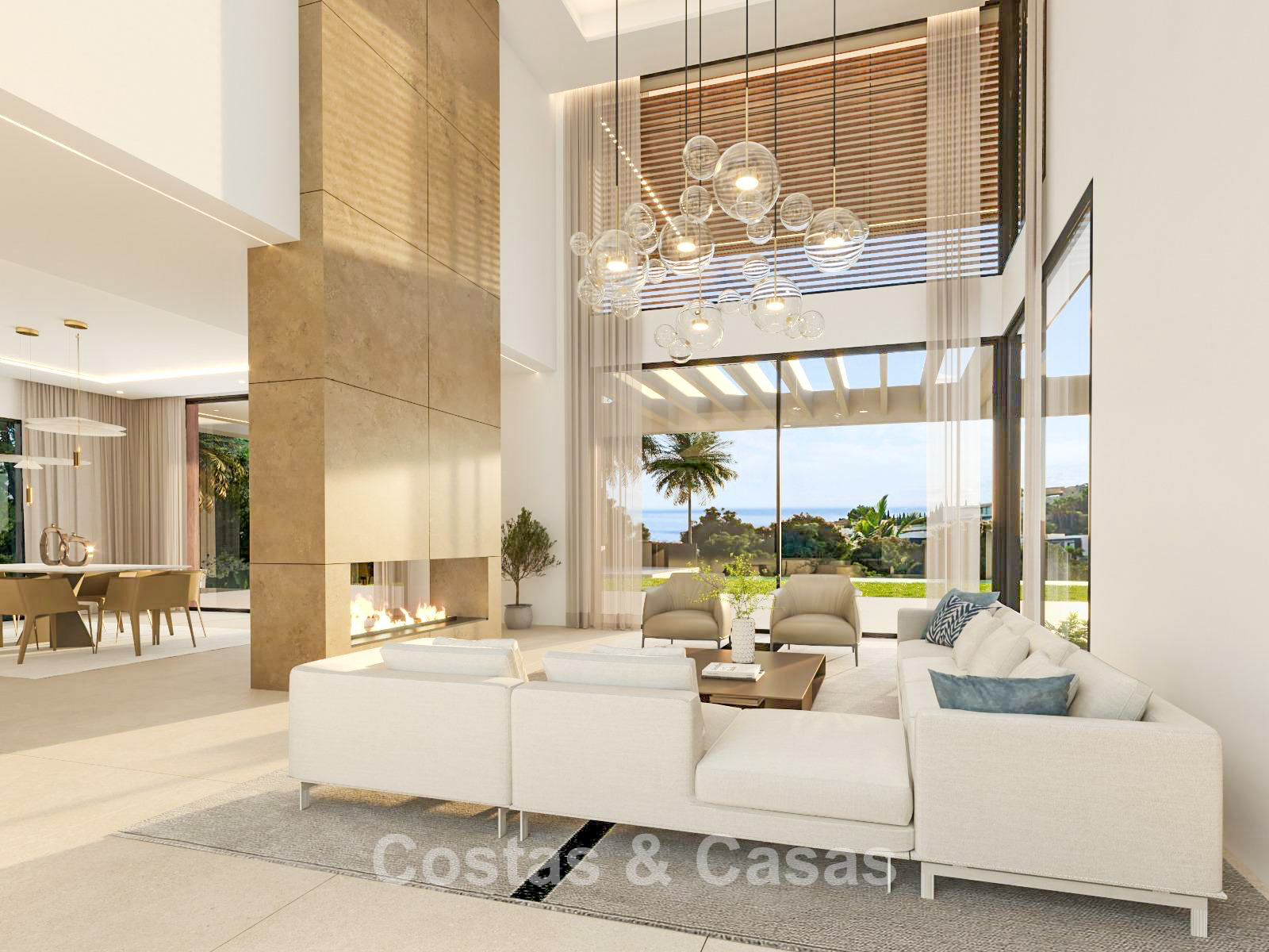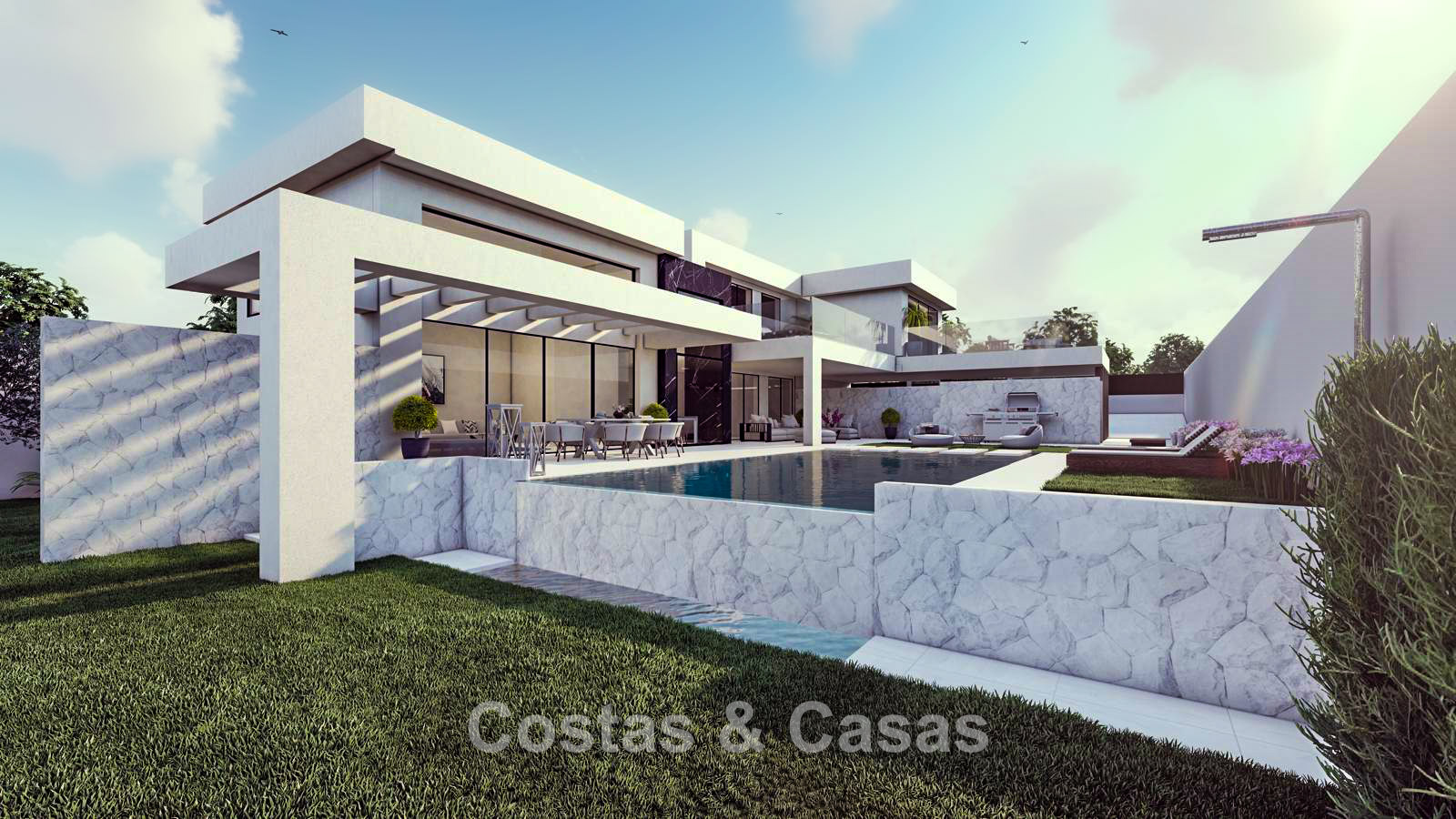Set on a spacious, south-facing plot of 1,034 m², ensuring maximum natural light and sunshine throughout the year. The outdoor areas showcase modern landscape design, seamlessly blending the garden with multiple terraces, including covered lounge areas and sun-drenched platforms. At the heart of the exterior lies a stunning private swimming pool, surrounded by a sleek terrace ideal for al fresco dining. Thanks to its elevated position, the villa enjoys breathtaking panoramic views across the golf fairways, the Mediterranean Sea and the surrounding mountains.
