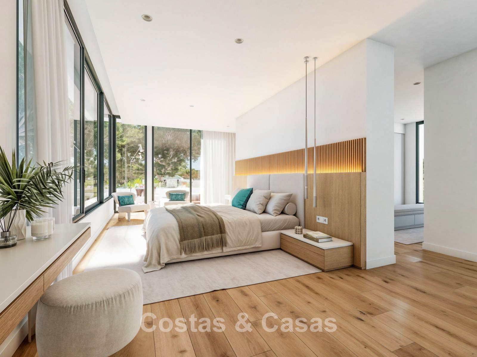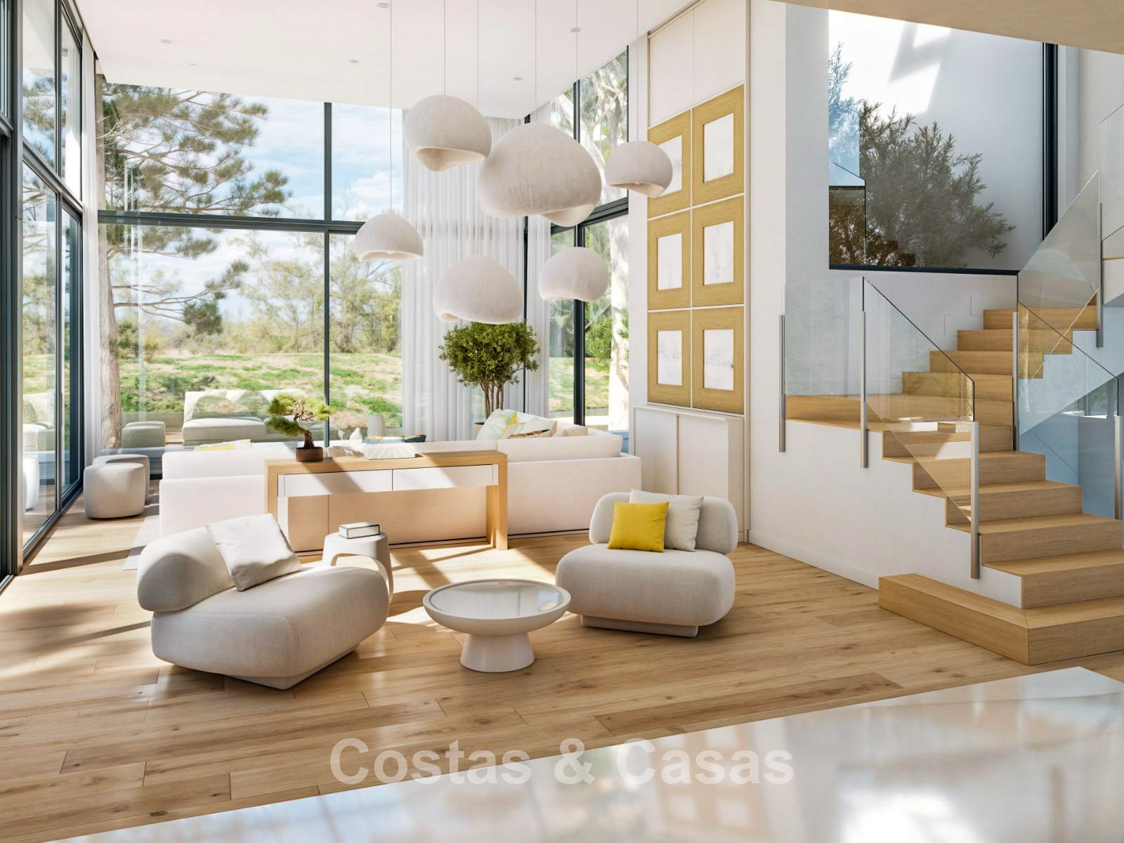 Detached villa with a contemporary architectural style. Open-plan living area featuring impressive high ceilings and floor-to-ceiling glass walls, creating a seamless connection between interior spaces and the surrounding landscape. Open designer kitchen with central island and high-quality appliances. Integrated dining area. The villa offers three spacious bedrooms, each with its own en-suite bathroom. The master suite is an architectural highlight, featuring a freestanding bathtub positioned behind a panoramic glass wall. An additional highlight is the fully customisable basement level, a versatile space that can be transformed into a private gym, wellness area with indoor pool, cinema room or exclusive wine cellar. Technical room. Private carport for two vehicles.