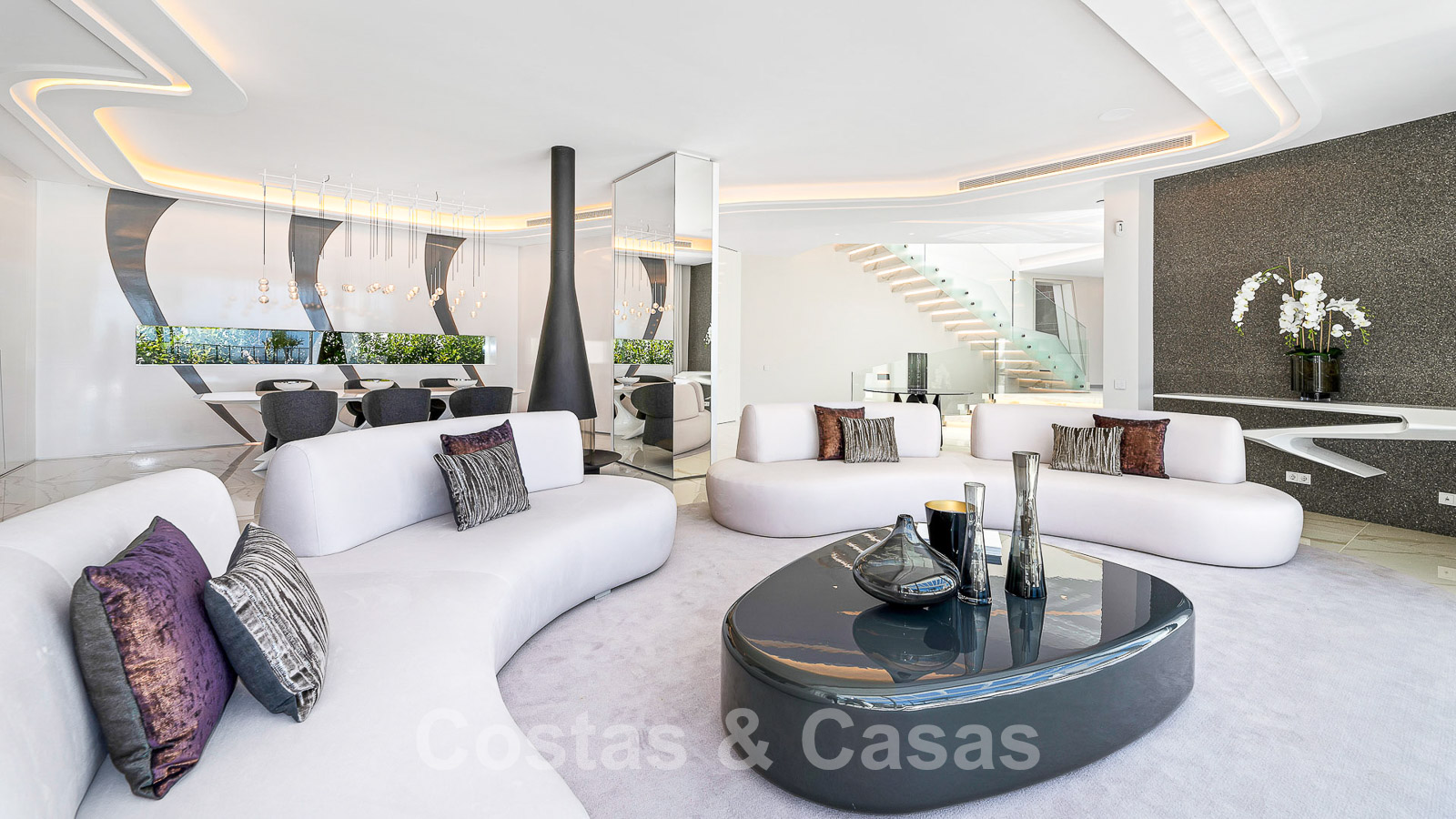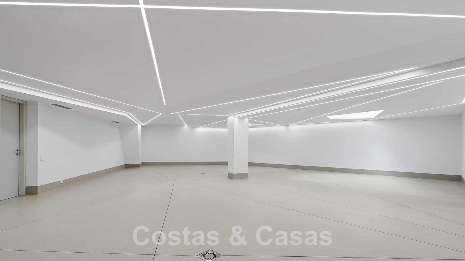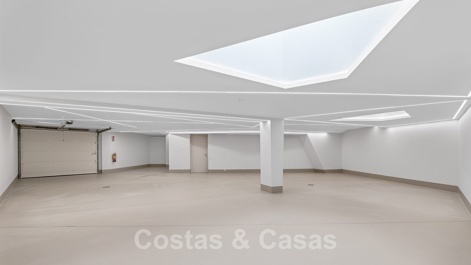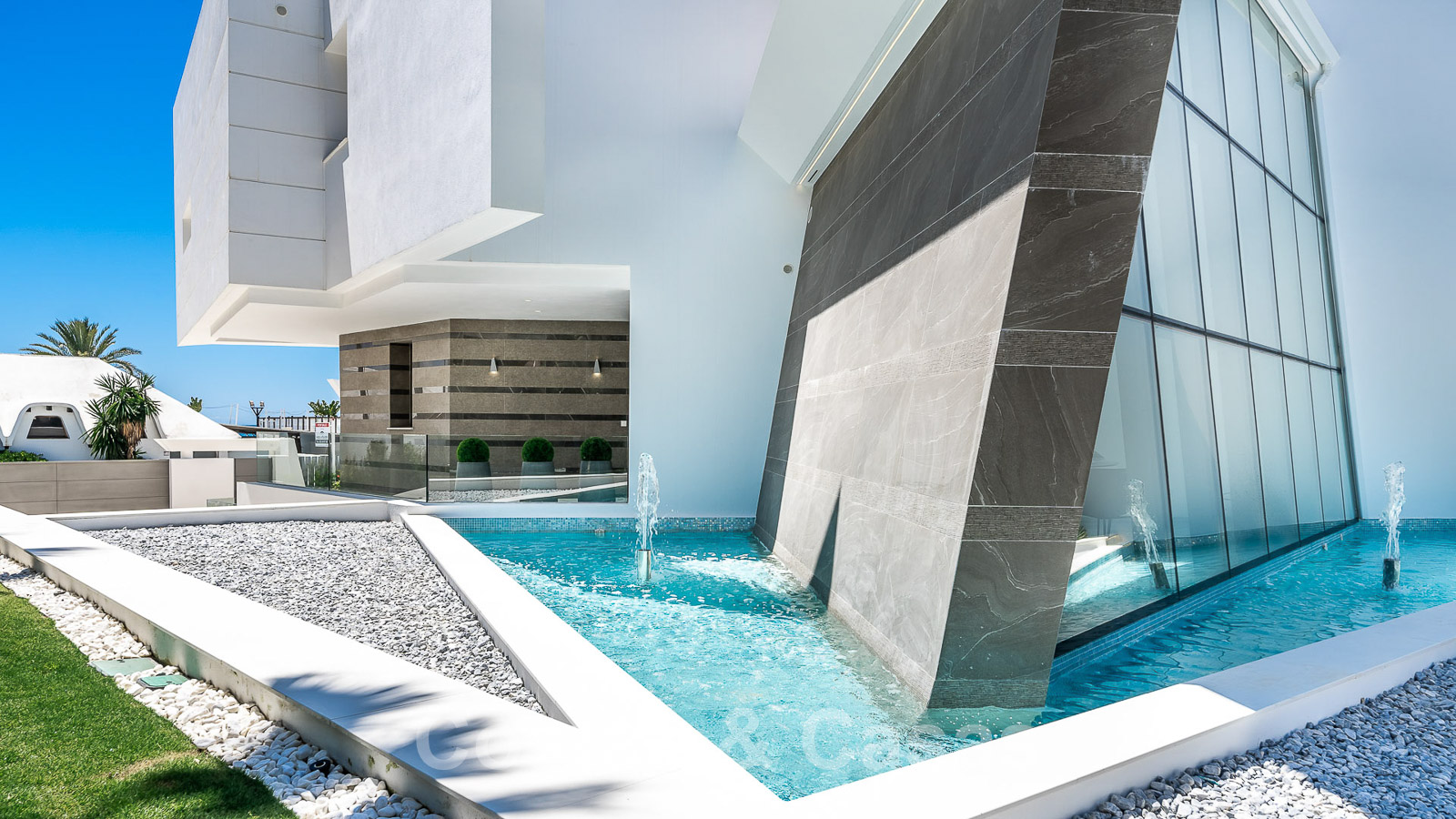 Spacious, complete fenced plot. A stunning, quality detached villa designed with attention to detail and high finishes. Facing south. High-quality landscaping with a large infinity pool, lots of greenery and water features. An attached pergola terrace provides a lounge area. An expansive roof terrace with a Jacuzzi and several lounge areas, from where you have panoramic views to the sea, Gibraltar and Africa. Highly artistic and sophisticated furnishing with designer pieces, creating a luxurious living atmosphere. Walking in, you are welcomed into a large entrance hall that connects to the open-plan living, and dining room. Semi-enclosed kitchen with an island where you can sit. The presence of high windows throughout the villa make for a very bright interior. A unique, modern office with a double-height ceiling and surrounded by water features makes you feel like you are in a boat. On the ground lower, there is a multi-purpose room that can be freely furnished with a gym, sauna, bar or home cinema. Laundry room, storage room and technical room. Indoor garage with daylight with space for 5 cars.