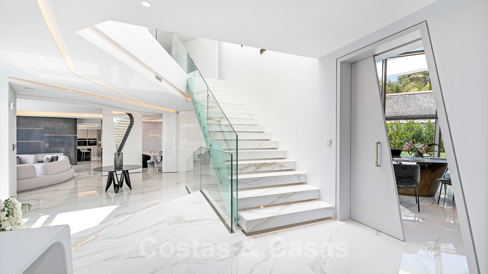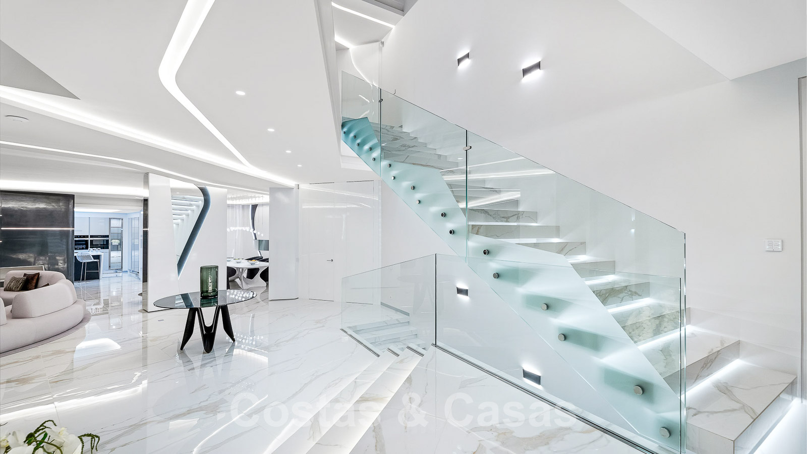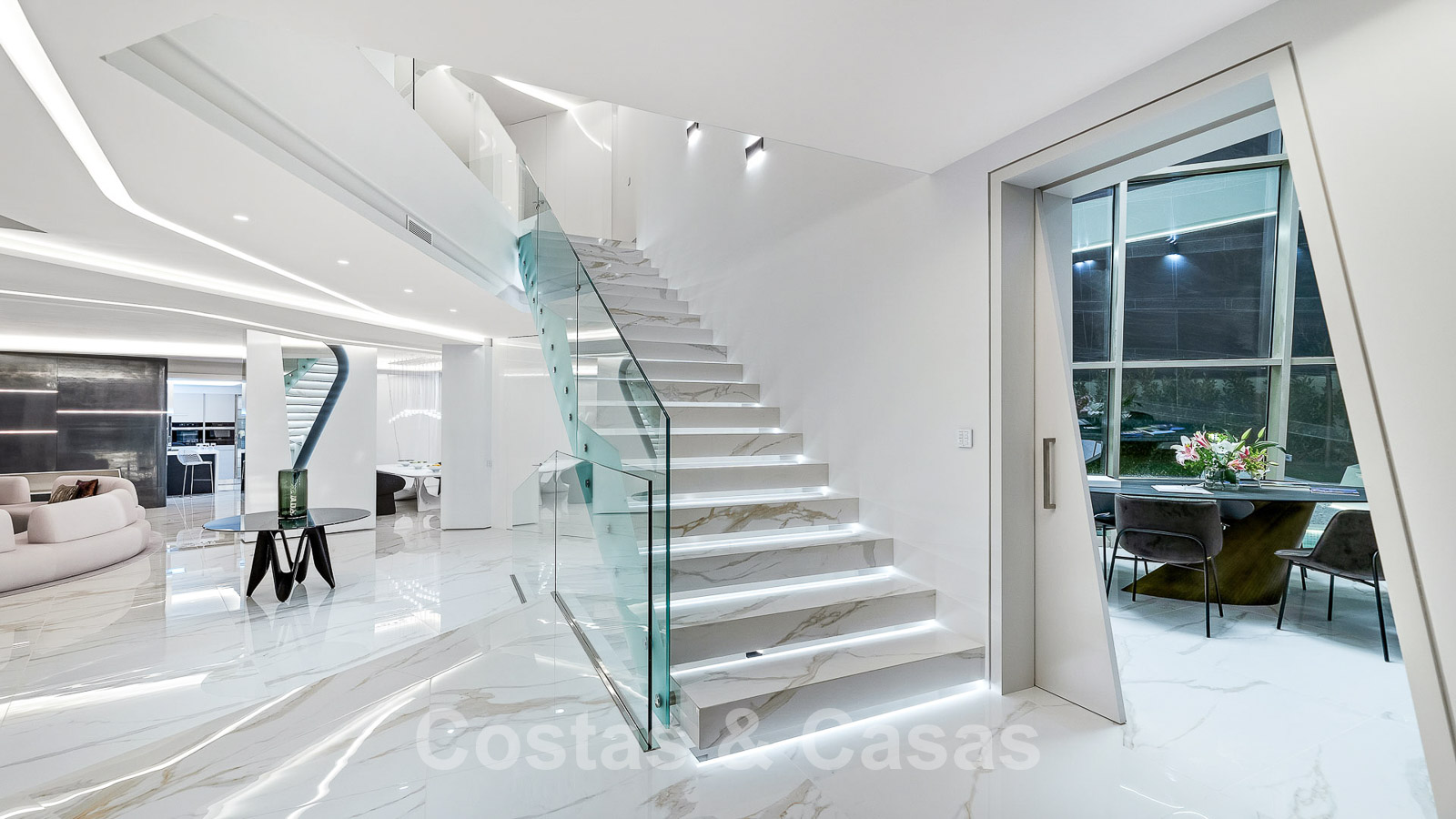 Lift. Glass balustrades. Air conditioning. Underfloor heating. Miele appliances in the kitchen. Marble floors. Domotics system. Advanced LED lighting throughout the interior and exterior. Alarm system.