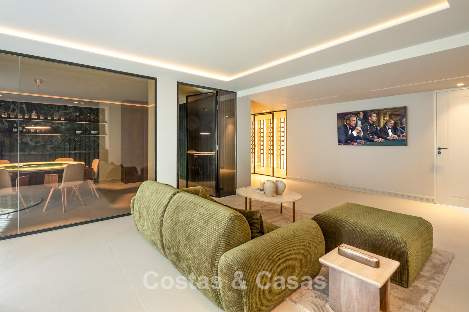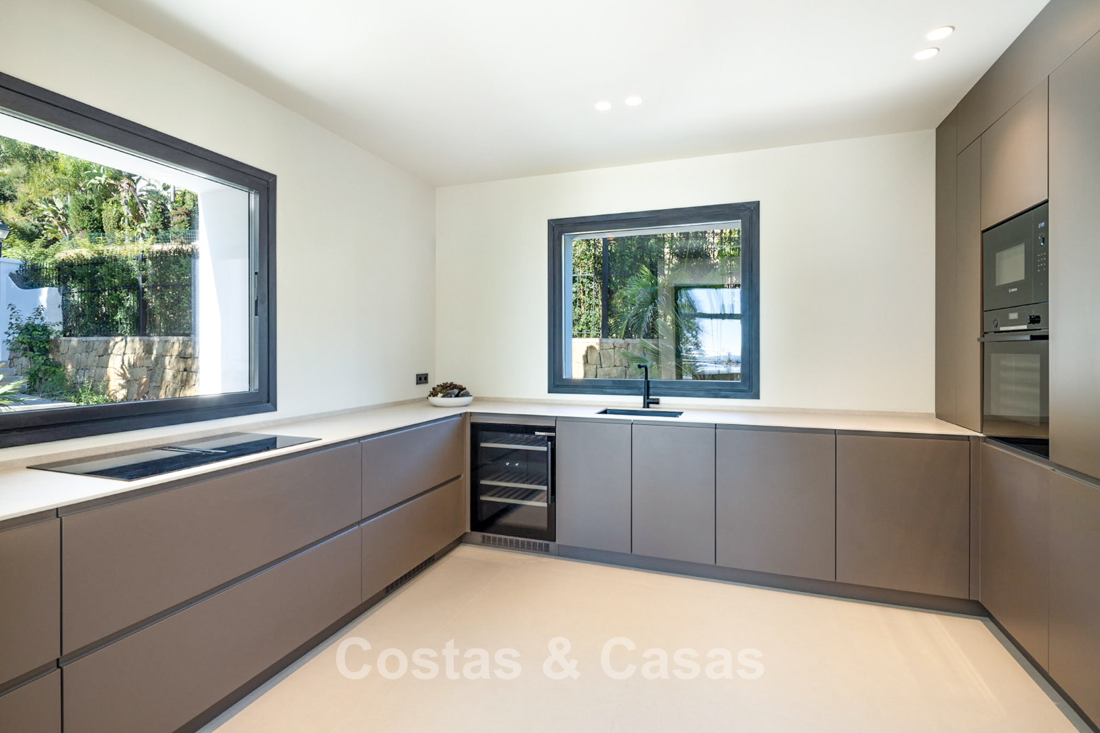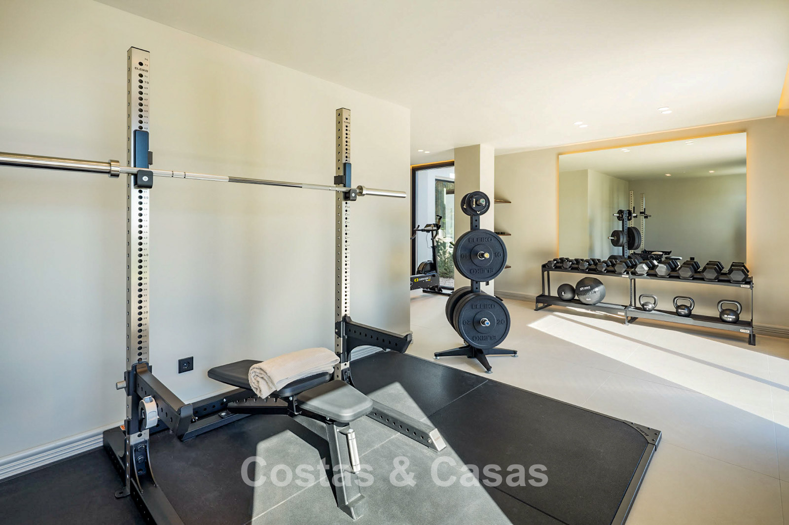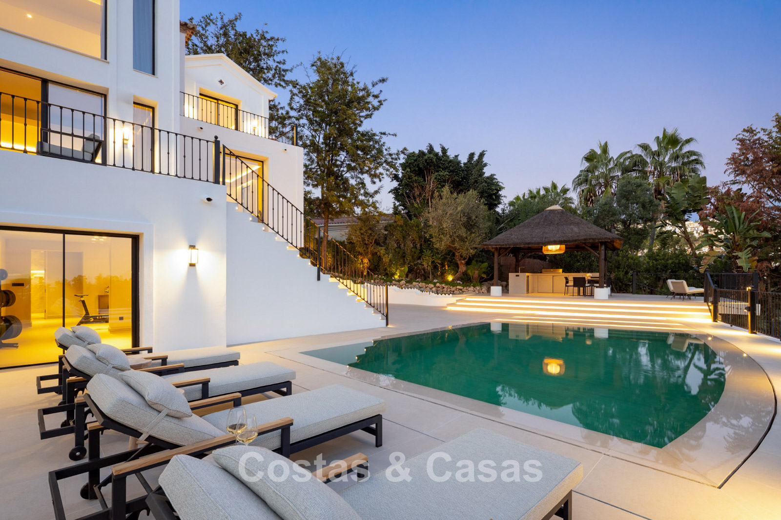 Villa showcasing contemporary Mediterranean architecture. Fully renovated using high-end materials throughout. Floor-to-ceiling windows flood the interiors with natural light and create a seamless connection to the sun-drenched terraces. The open-plan living areas offer an exceptional sense of space and flow. Designer kitchen fully equipped with premium appliances and a breakfast island. Adjacent utility room. Five bedrooms and six bathrooms. Guest or staff apartment with kitchenette. Wellness area including built-in jacuzzi, sauna and relaxation zone. Entertainment space with elegant lounge, bar and separate poker room. Modern gym fitted with Eleiko fitness equipment. Custom-designed wine cellar. Dedicated home office. Fully equipped laundry room. Storage areas. Multiple technical rooms. Carport for three vehicles.