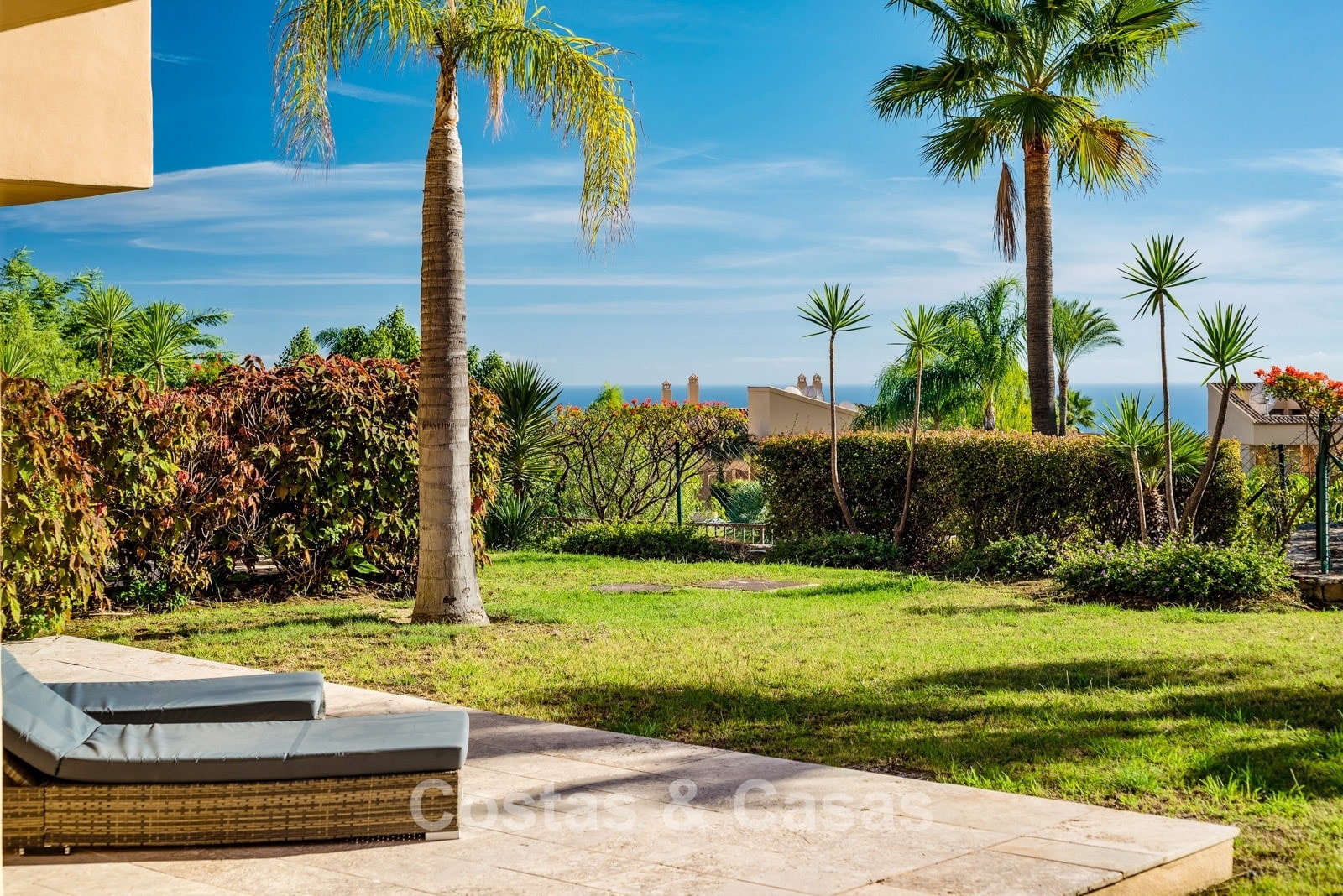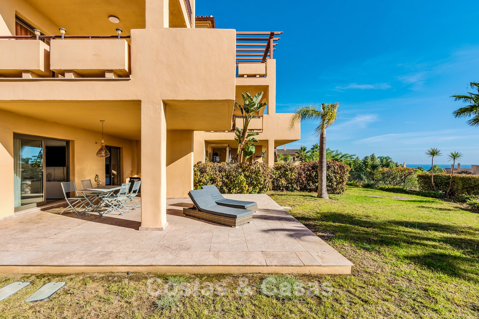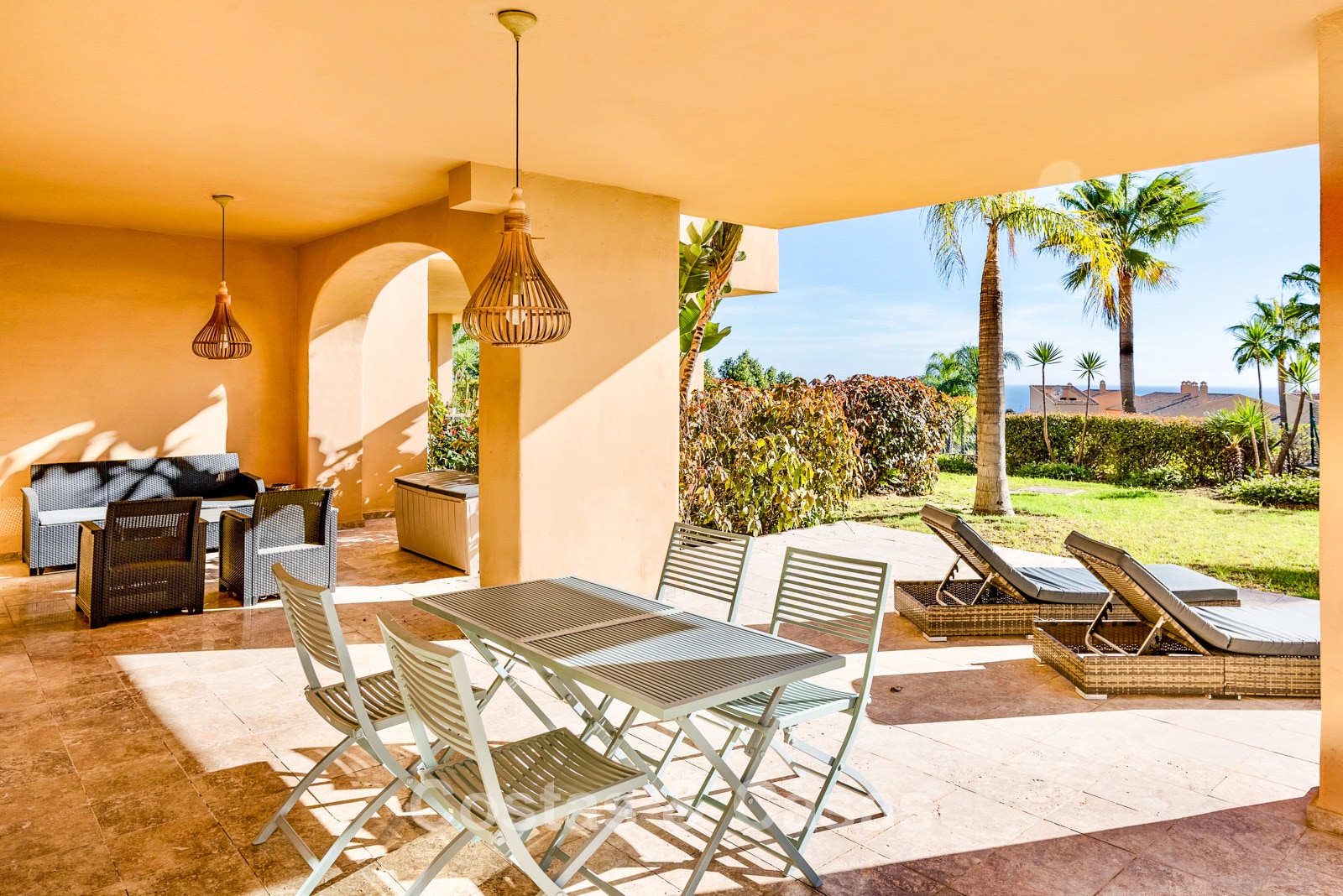 Spacious ground-floor corner apartment located at the highest point of the urbanisation. Built using high-quality materials. South to southwest orientation. Stunning views of the Mediterranean Sea. Two spacious terraces, partly covered, with direct access to a 140 m² private garden. A dynamic, bright interior with a modern open-plan concept. Living room with lounge and dining area. Fully fitted open-plan kitchen equipped with Siemens appliances and a central island. Adjacent storage/laundry room. Large sliding glass doors providing access to the outdoor areas. Three bedrooms and two bathrooms, one en-suite and one shared family bathroom. Marble flooring throughout. An 8 m² storage room and a private underground parking space are included, both accessible by lift.