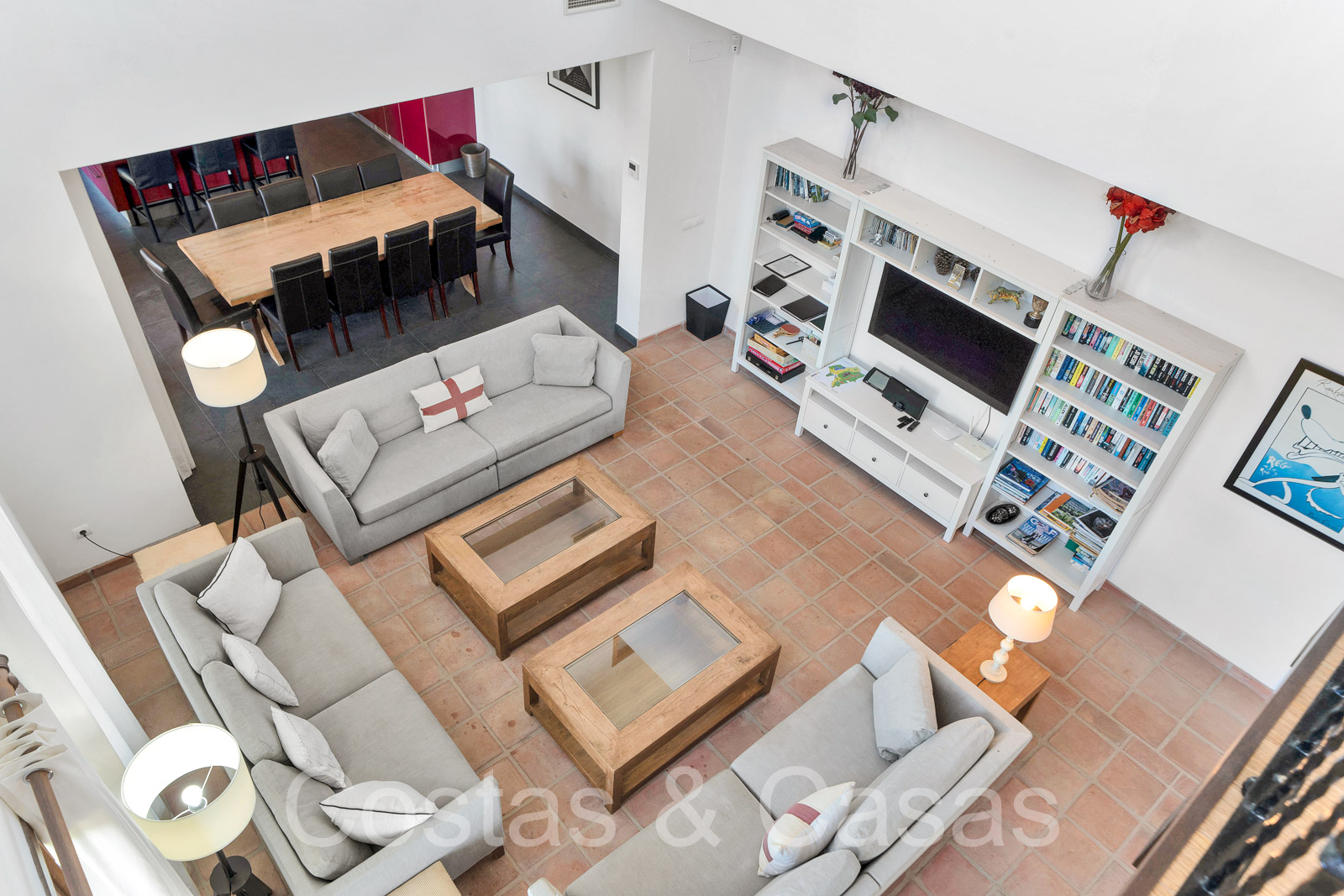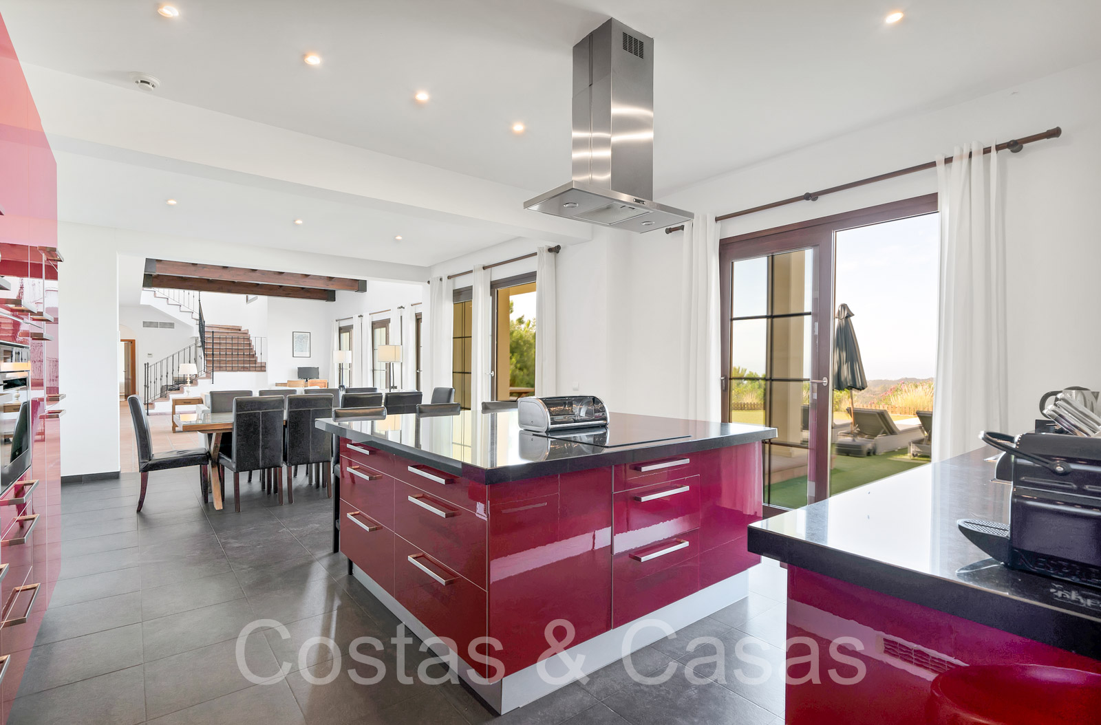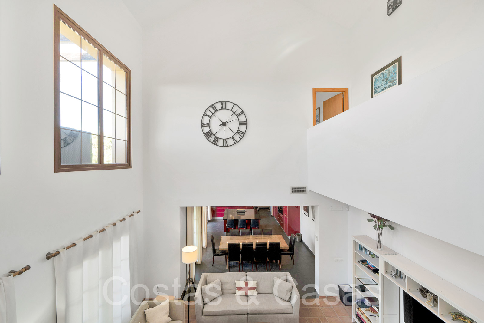 Detached villa with a stylish, Mediterranean architectural style. Using natural materials including wood and terracotta. As you enter, you are greeted by a unique gallery bridge that gracefully overlooks the vast open spaces below. Spacious, airy rooms with double height ceilings. High sliding windows open out onto the outside spaces and generate plenty of natural light. Fully equipped kitchen/diner with seating island. Integrated dining room. 5 bedrooms, 5 bathrooms and separate toilet. Ample storage. The driveway offers parking for 2+ cars.