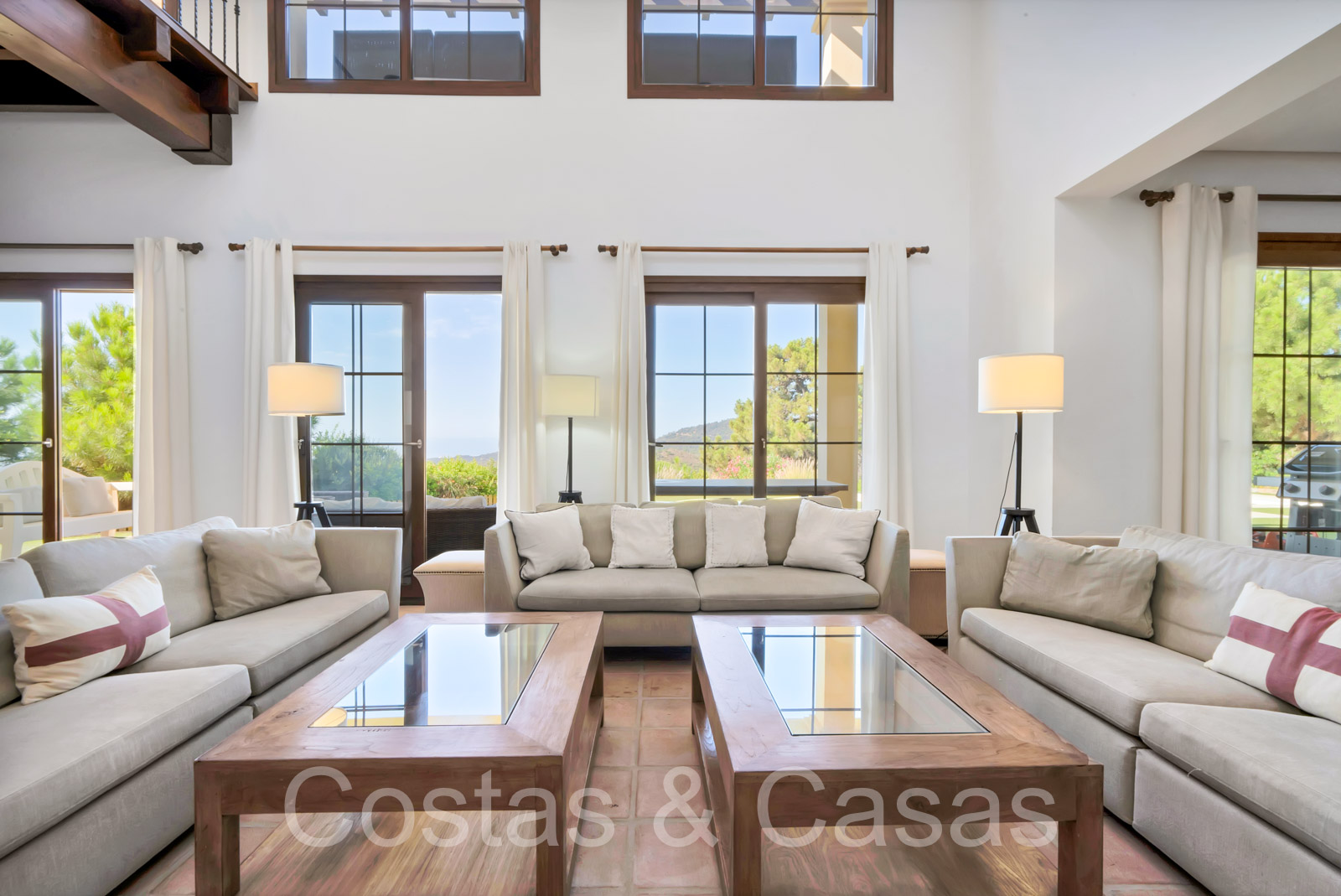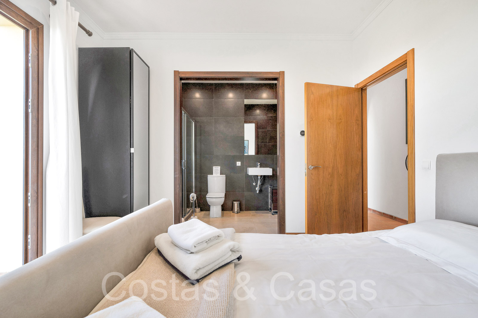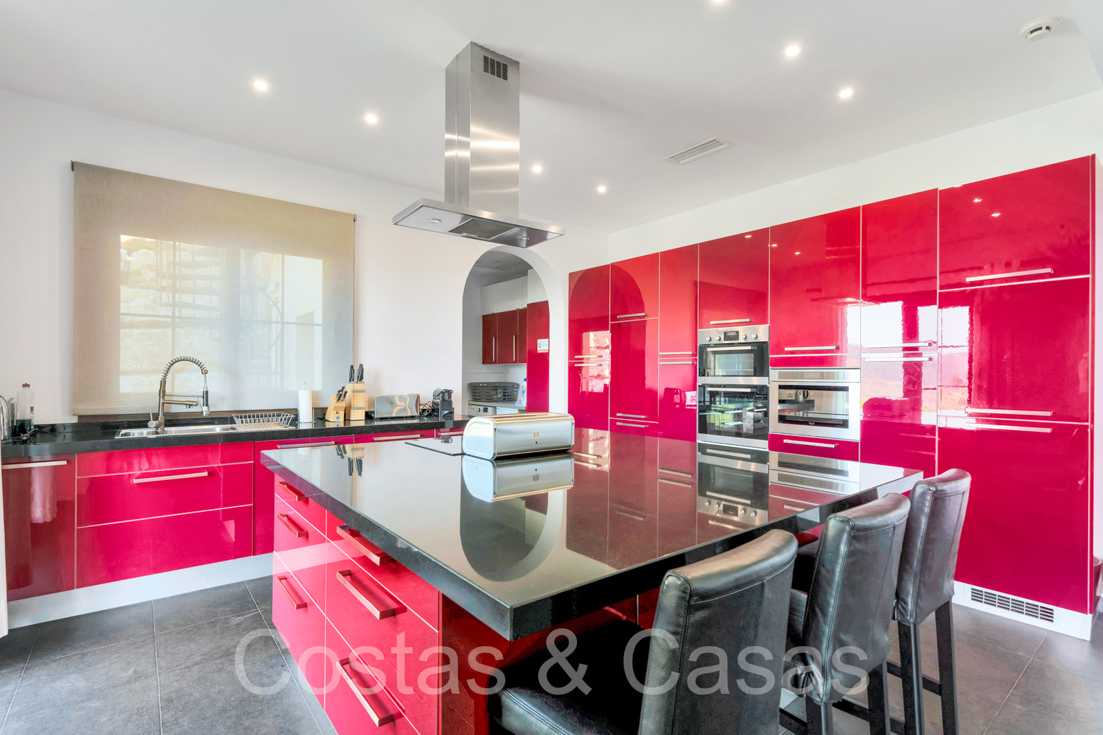 Detached villa with a stylish, Mediterranean architectural style. Using natural materials including wood and terracotta. As you enter, you are greeted by a unique gallery bridge that gracefully overlooks the vast open spaces below. Spacious, airy rooms with double height ceilings. High sliding windows open out onto the outside spaces and generate plenty of natural light. Fully equipped kitchen/diner with seating island. Integrated dining room. 5 bedrooms, 5 bathrooms and separate toilet. Ample storage. The driveway offers parking for 2+ cars.