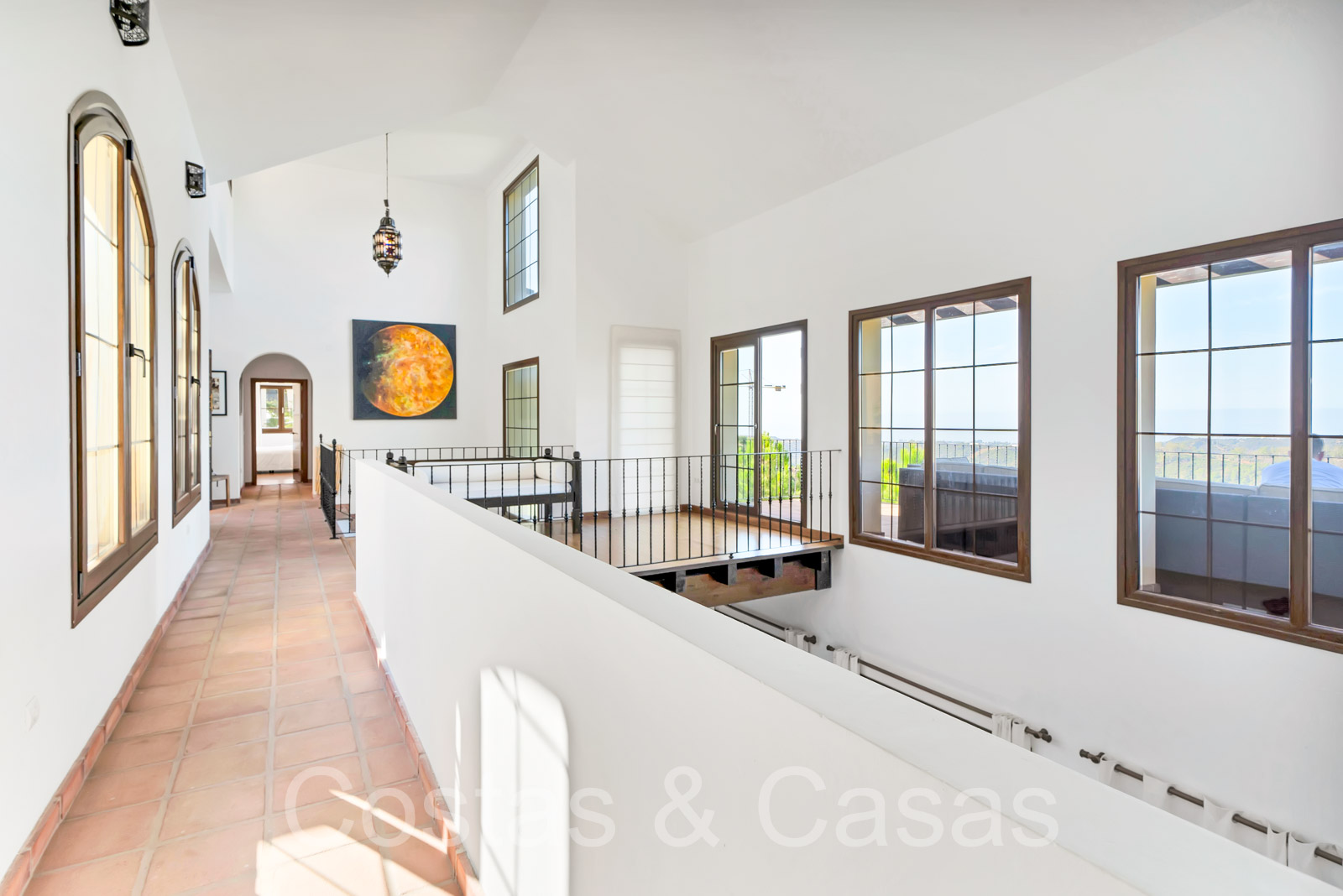 Spacious, secluded plot situated in an elevated position. Well-kept landscaped garden with tropical greenery and low-maintenance lawn. Built-in infinity pool surrounded by lawn. Sunny and shady terraces offer the opportunity to enjoy the pleasant Mediterranean climate. An external outdoor staircase climbs to a roof terrace that offers space for several lounge facilities. Oriented from south to southwest. Views over the lush valley towards the Mediterranean Sea and the Strait of Gibraltar.