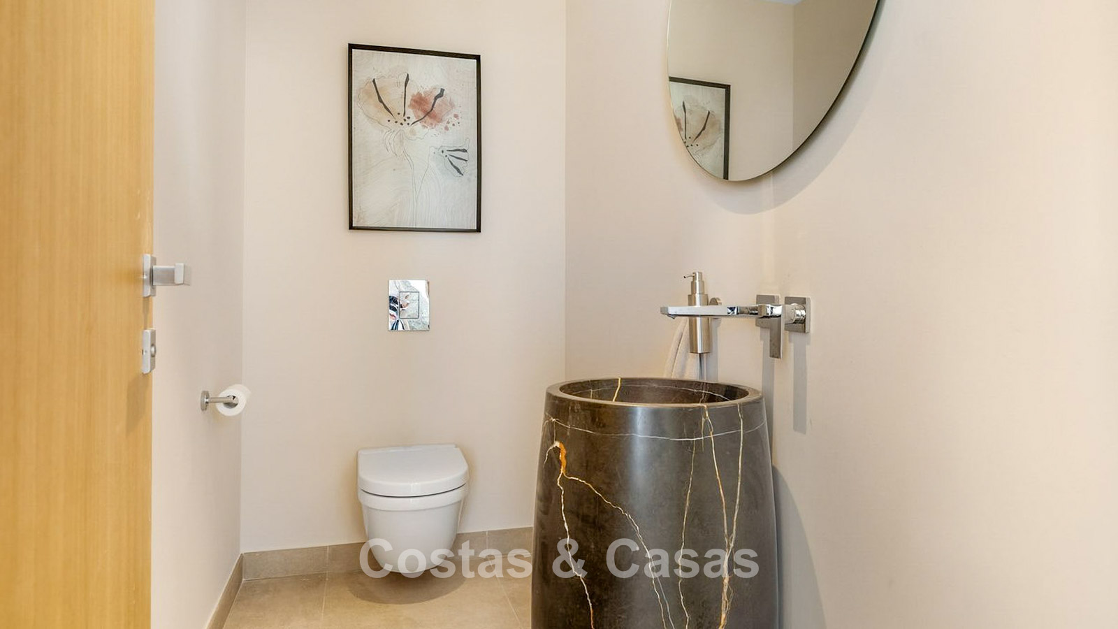 Enclosed corner plot in an elevated position. Beautifully landscaped private garden with a manicured lawn. Swimming pool surrounded by a sun terrace. The outdoor area with spacious terraces invites you to fully enjoy the pleasant Mediterranean climate. A roof terrace provides additional space for relaxation and offers phenomenal views. East/southeast facing. Spectacular panoramic views of the iconic La Concha mountain and the Mediterranean Sea.
