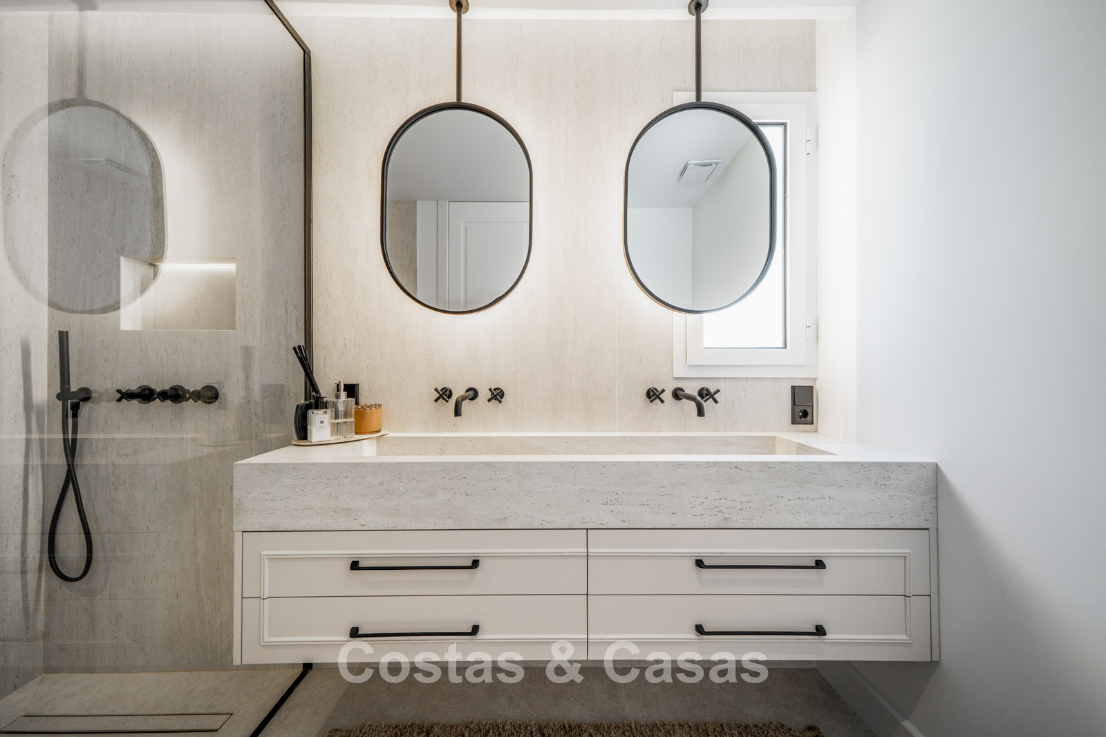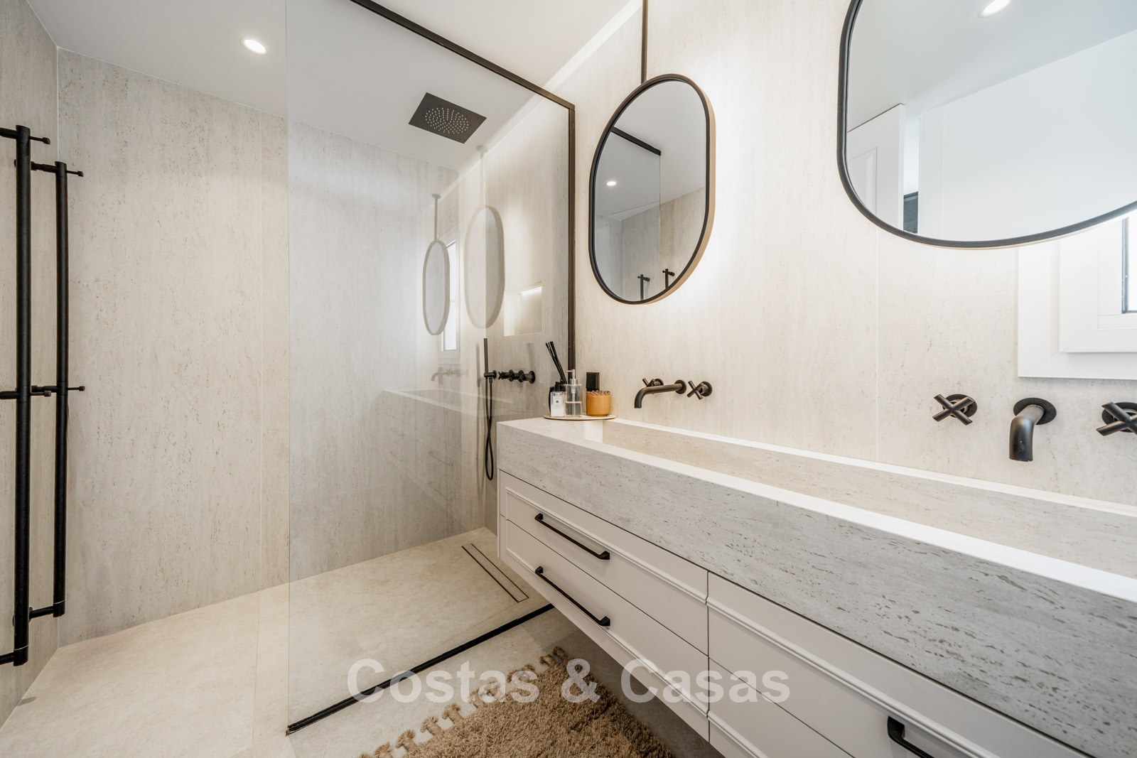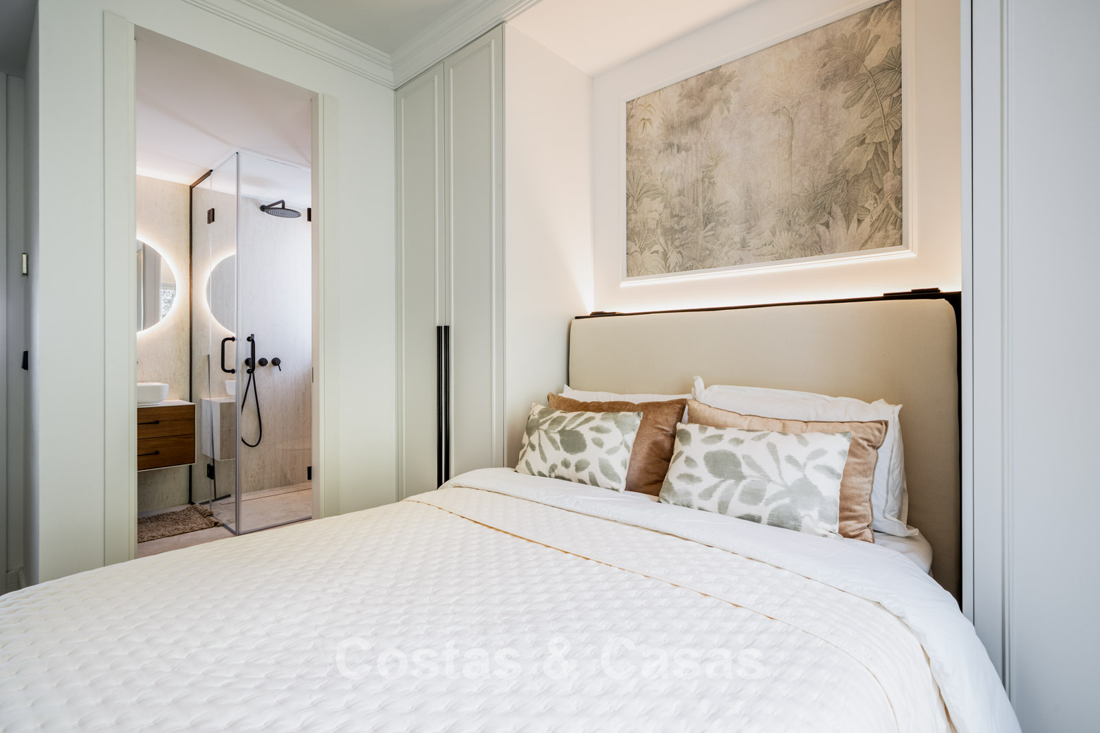 Modern apartment in a contemporary Mediterranean-style complex. Situated on the top floor. Fully renovated using high-quality materials. Stunning views over the golf courses and the hills towards the Mediterranean Sea. Partially shaded terrace with a lounge area, built-in outdoor kitchen with barbecue, and an alfresco dining space. Large sliding windows allow plenty of natural light and open onto the cosy outdoor area. Open-plan living area with TV lounge and integrated dining space. Functional kitchen equipped with high-quality Smeg appliances. 3 bedrooms, 3 bathrooms and a separate toilet. Storage room. Hardwood floors with herringbone pattern.