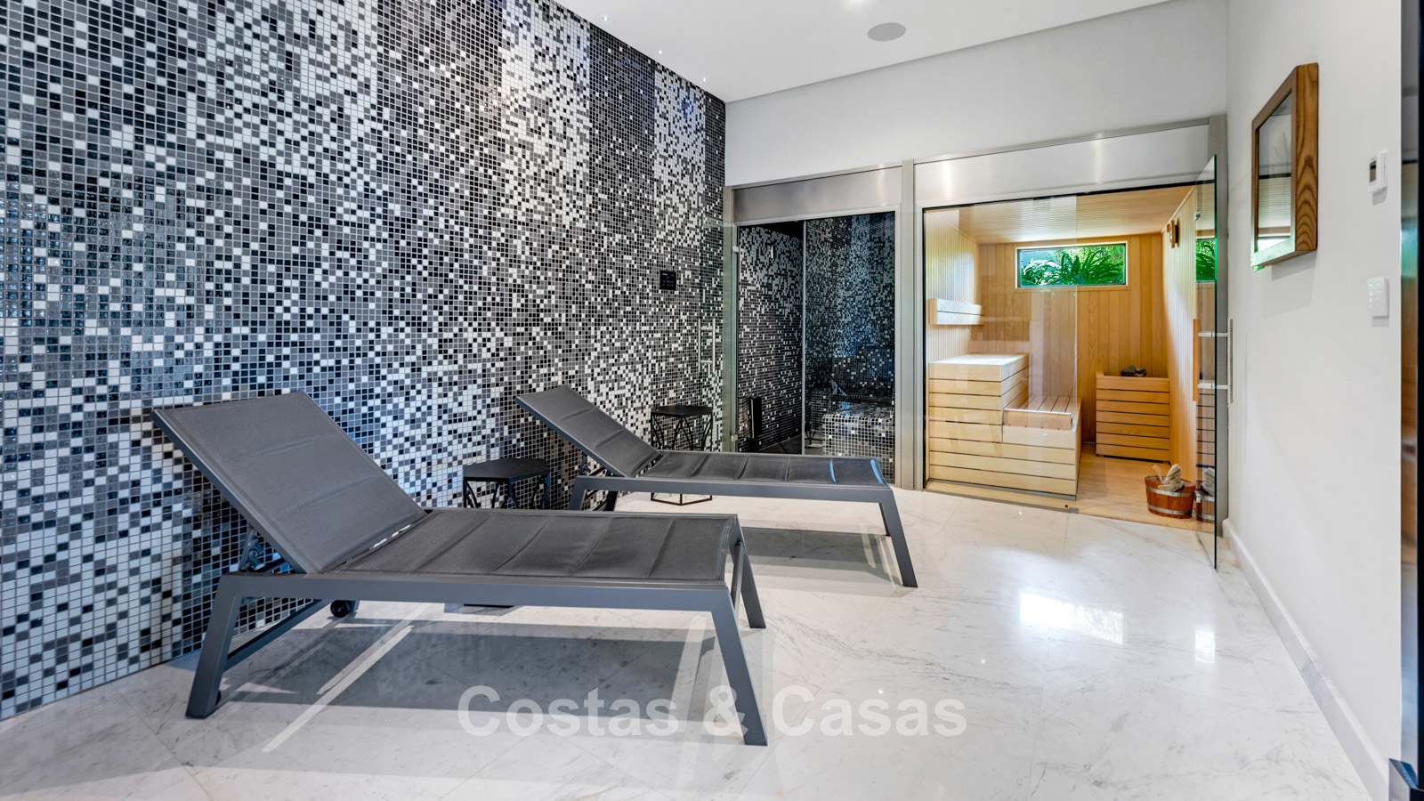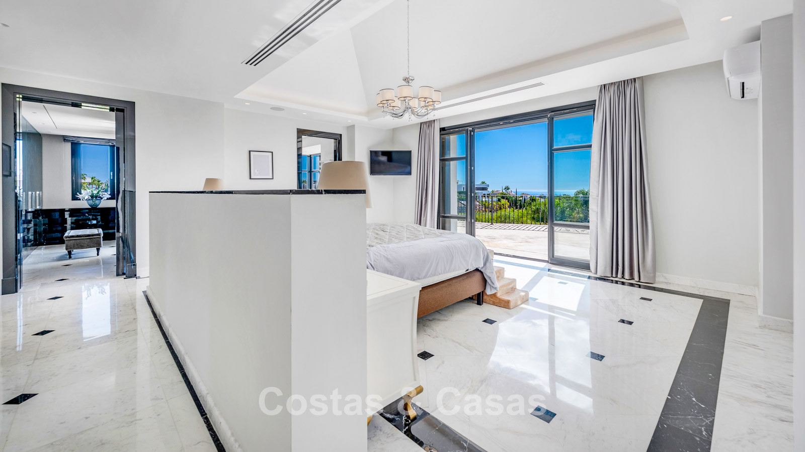 This stately villa is in excellent condition and combines classical elegance with modern luxury. The property is distributed over three spacious floors with a symmetrical architectural layout. Only the finest materials have been used, including refined marble and high-quality woodwork. The villa benefits from an ideal south-facing orientation and enjoys views of the golf course, valley, mountains and the open sea. The interior exudes grandeur thanks to a spectacular double-height entrance hall with a domed skylight. Open living area with a TV lounge and integrated dining space. The generous living room has an open layout with a classic fireplace as the central focal point. There is a separate fully equipped kitchen with direct access to the dining room and terrace. The villa offers 5 elegant bedrooms, each with its own en-suite bathroom and fitted wardrobes. A guest toilet is located on the ground floor. The lower level is a true relaxation paradise, featuring additional facilities such as a private cinema, a fully equipped gym, a sauna, a Turkish bath and an exclusive wine cellar. A complete service apartment for staff or guests. Spacious storage room and a separate laundry room. Technical room. Indoor garage for 2 cars. Additional parking space on the plot.