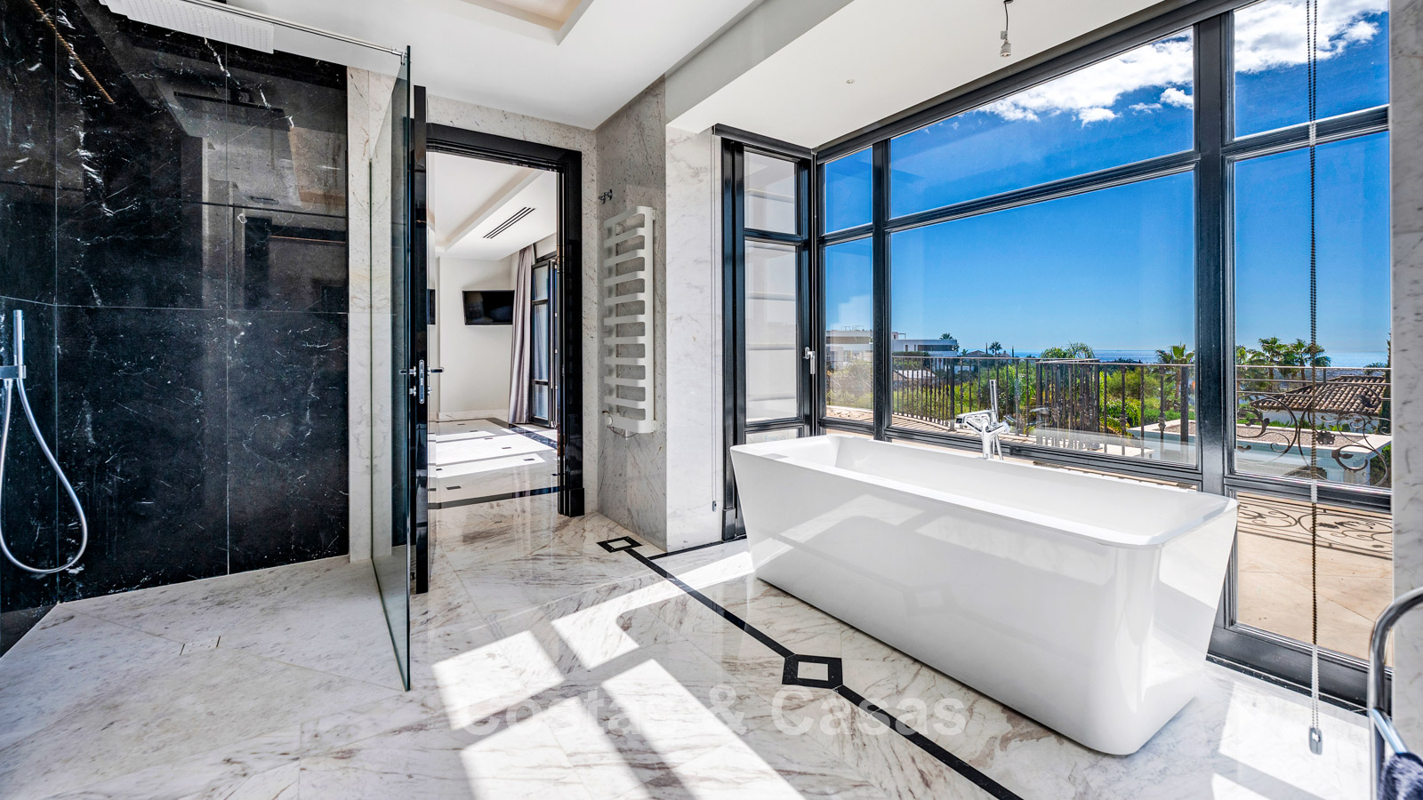 Located in a prestigious residential area, just a stone’s throw from a renowned golf course, with several top golf courses only minutes away by car. A large supermarket, an international school and a commercial centre currently under construction are just a few minutes’ drive away. Only 5 to 15 minutes by car to the beach, San Pedro, Puerto Banús, Marbella and Estepona, not to mention the beautiful gastronomic village of Benahavís Pueblo.