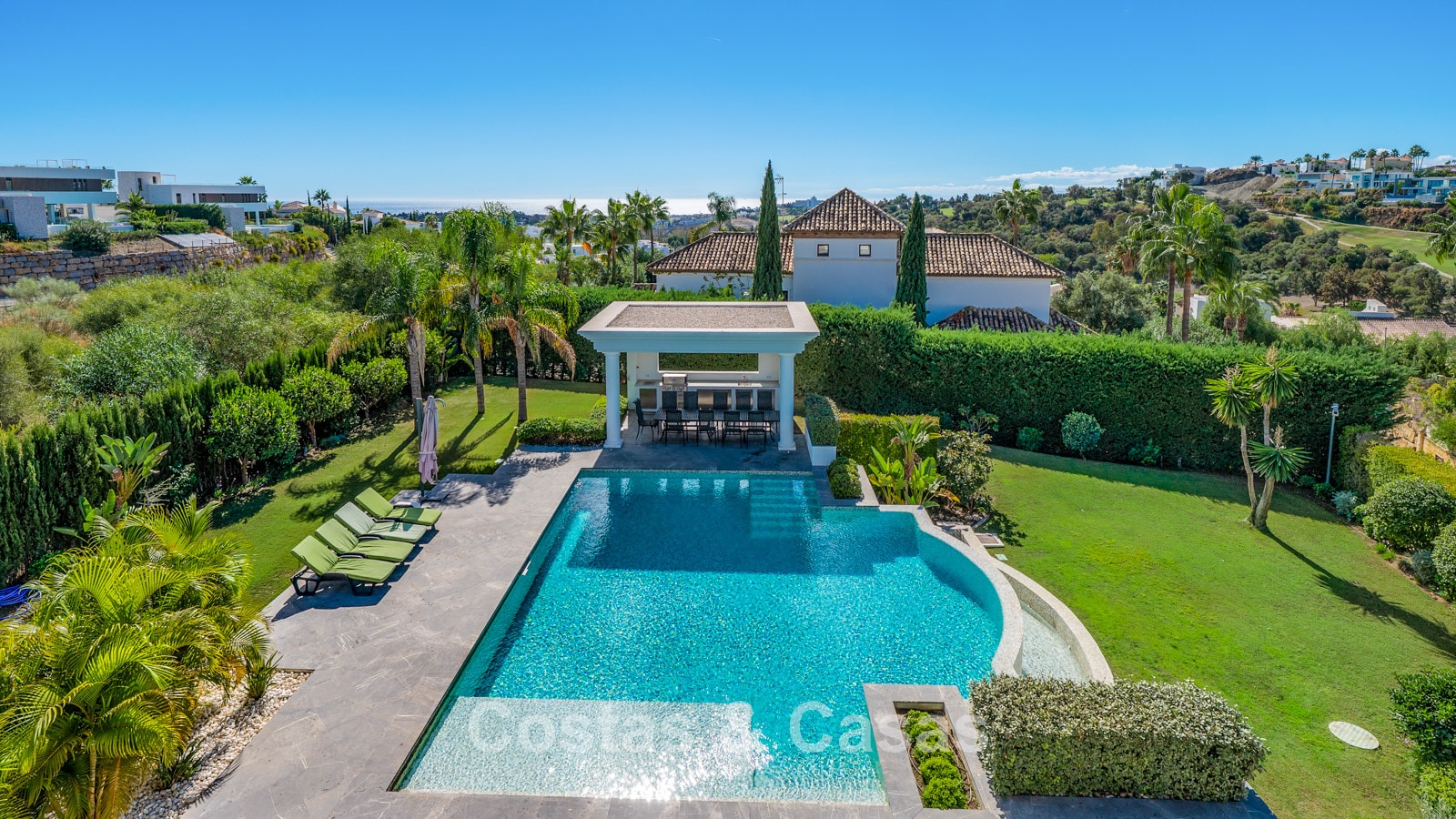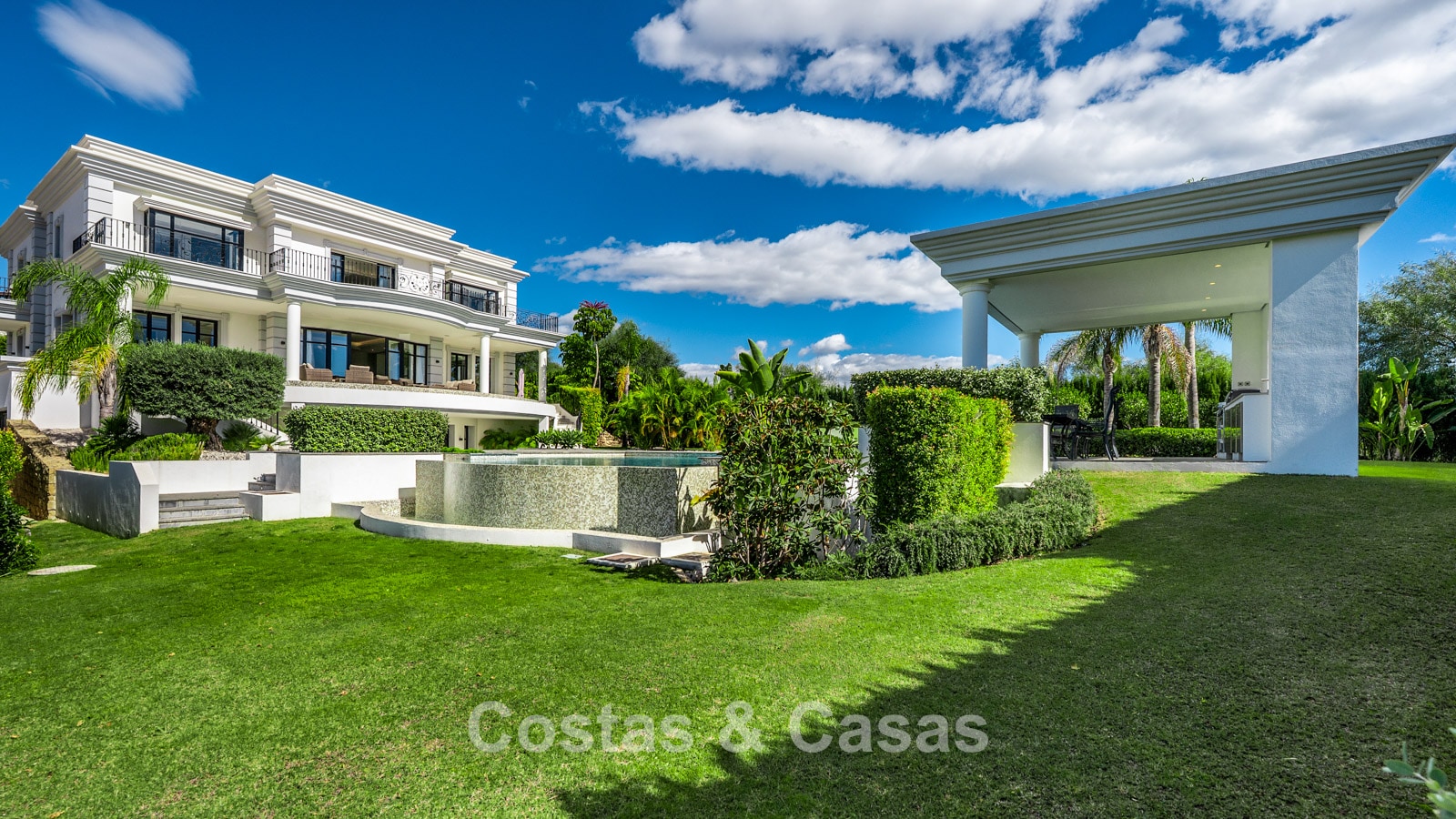 The extensive plot is fully landscaped with tropical gardens. The outdoor area features a large swimming pool surrounded by sun terraces and a shaded dining pavilion complete with an outdoor kitchen. Several covered and open terraces connect the villa seamlessly with the garden.