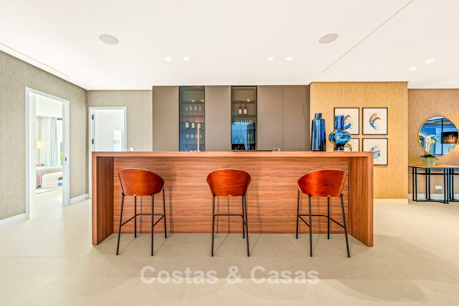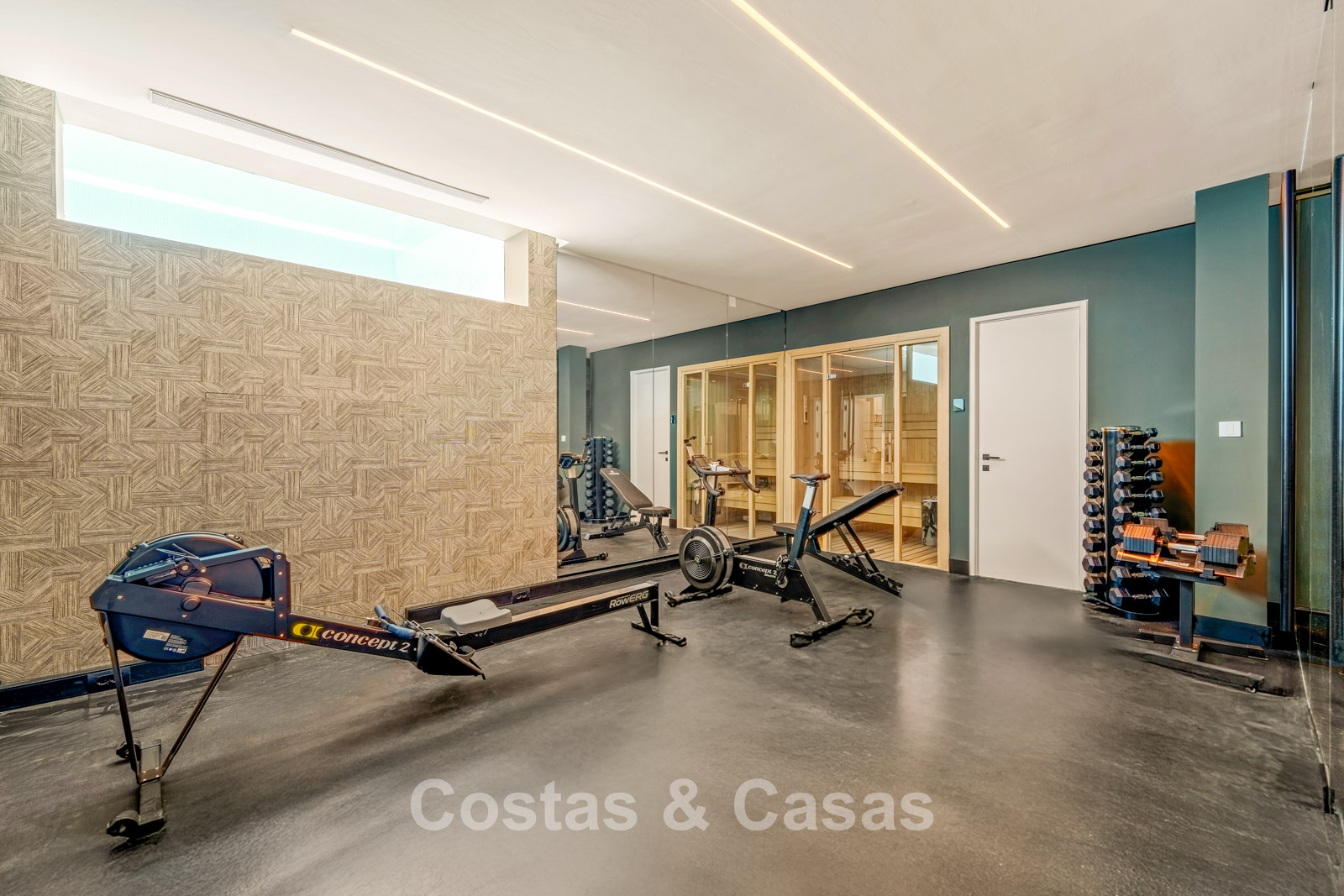 Detached villa with strong architectural lines and a timeless design. Attention to the finest detail and highest quality finishes. Floor-to-ceiling sliding windows and glass doors create a natural transition between interior and exterior, emphasizing the abundance of light and openness. Cozy TV lounge with a modern gas fireplace. A central sitting area forms the heart of the villa, with an impressive double-height ceiling and large windows that allow abundant natural light to flood in. Integrated dining area. Minimalist kitchen equipped with appliances and a central island perfect for breakfast. Adjacent is a climate-controlled wine display. 6 bedrooms, 7 bathrooms, and a separate guest toilet. A recreational basement level features a well-equipped home gym, spa facilities with an indoor pool, and a separate entertainment room that can be used as a social gathering space with a TV lounge and bar. This level also connects directly to a lower garden, providing natural daylight. Porcelain tiled floors. Carport for two vehicles, with pre-installation for electric charging stations.