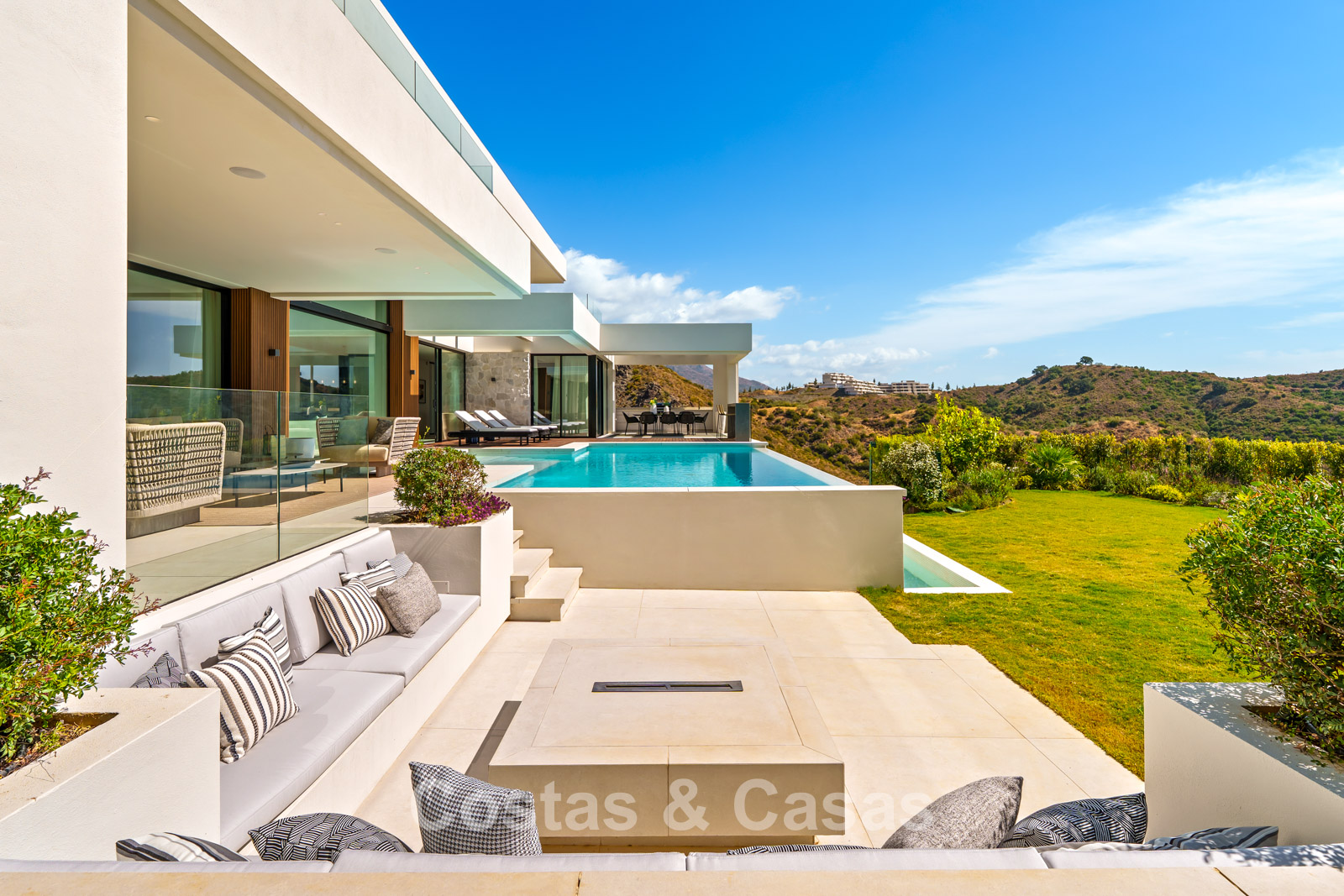 Situated on a spacious plot in an elevated position. The outdoor area offers several inviting seating and relaxation areas, including a fire pit lounge, a sun terrace, and an equipped outdoor kitchen with a barbecue and dining area. The infinity pool extends into a lower garden with well-maintained flowerbeds. South-facing. Unobstructed views of the Mediterranean Sea in the distance and the surrounding mountain landscape. Absolute privacy.