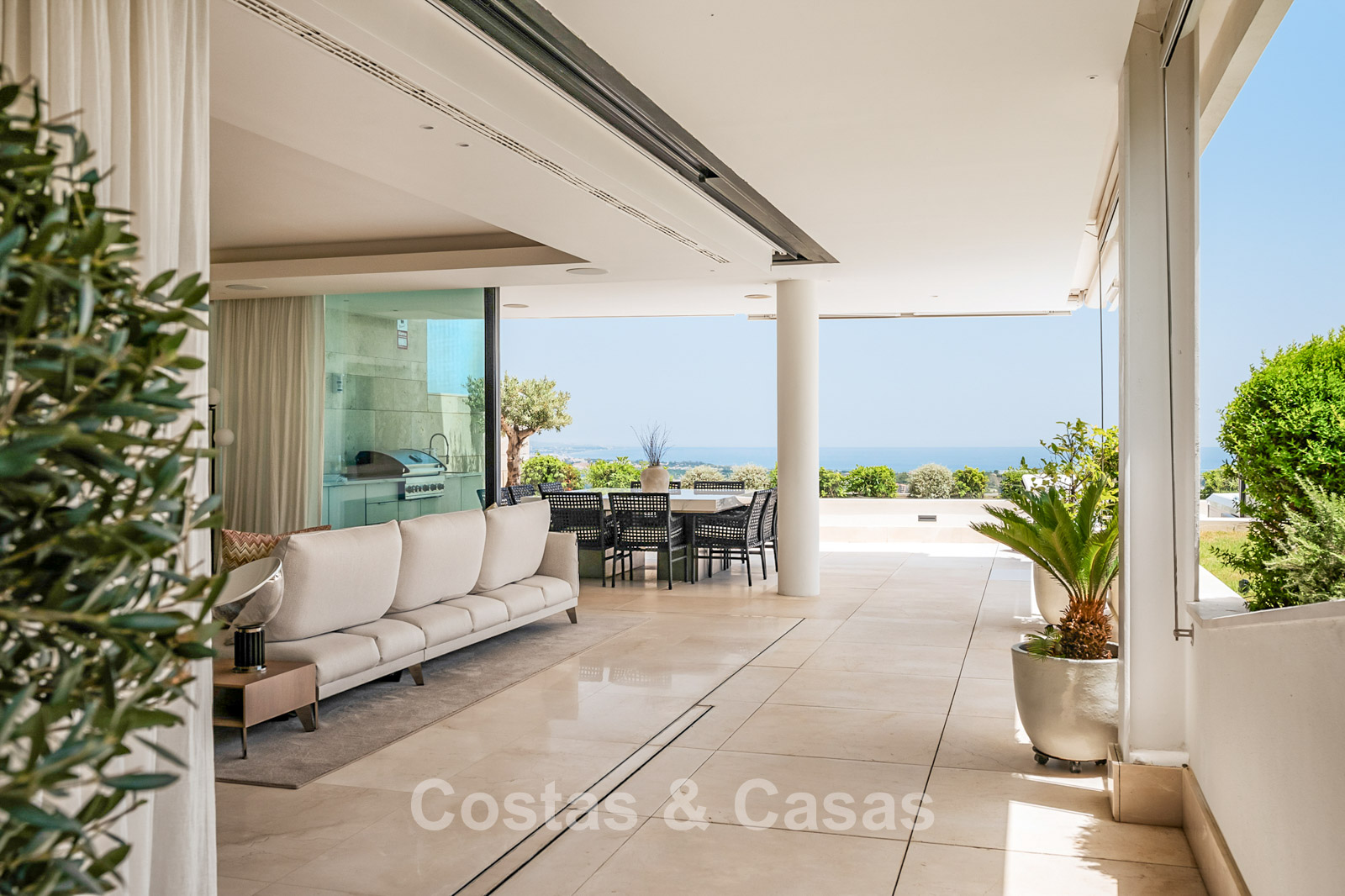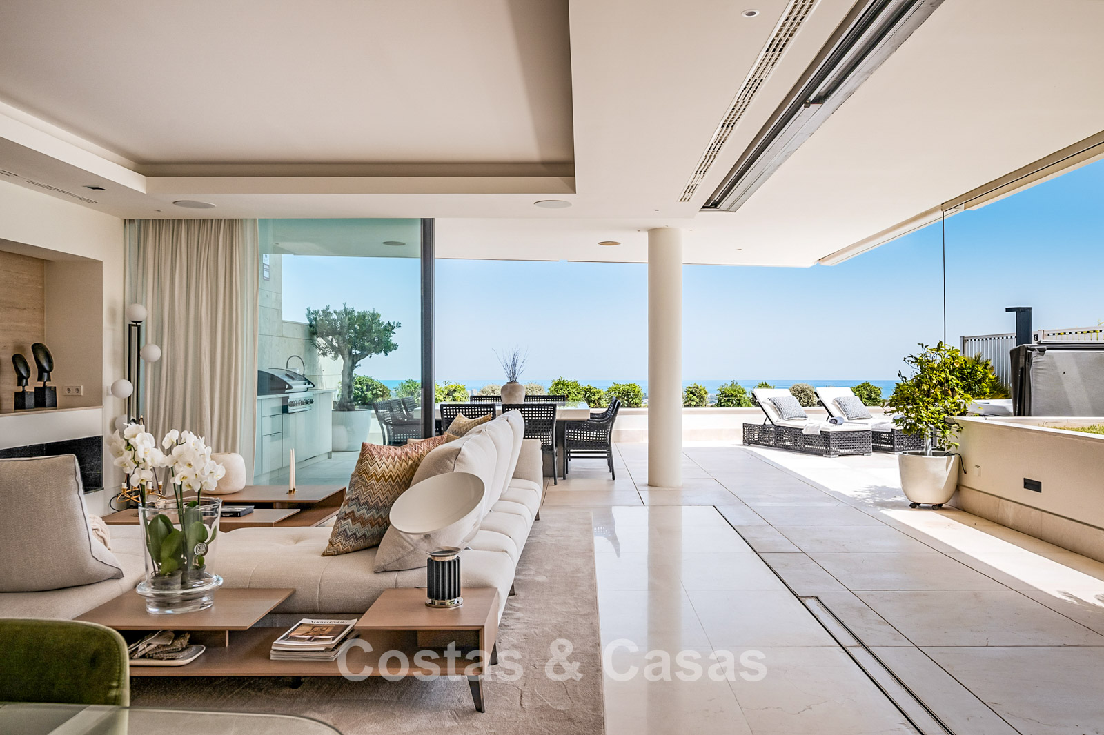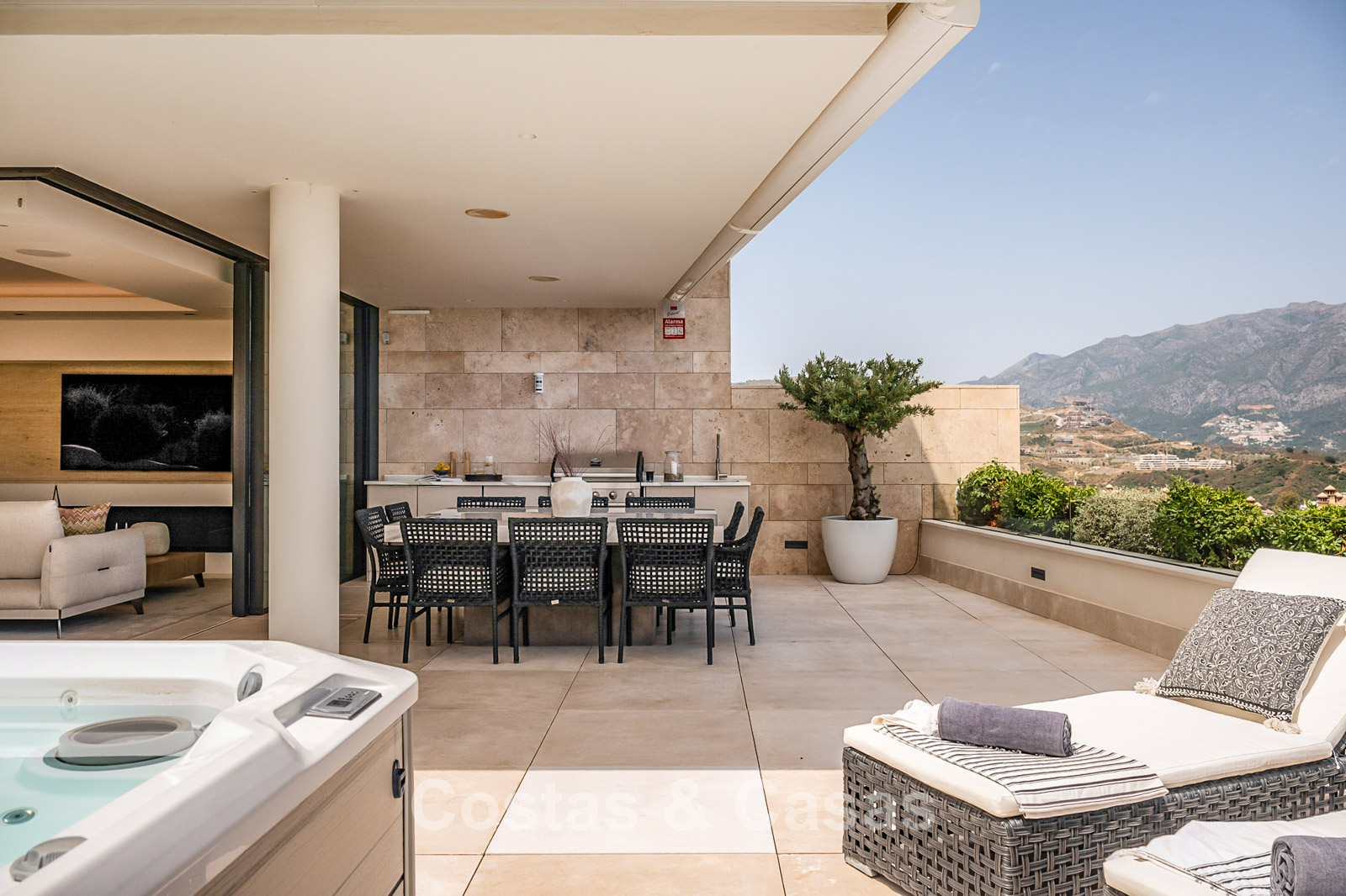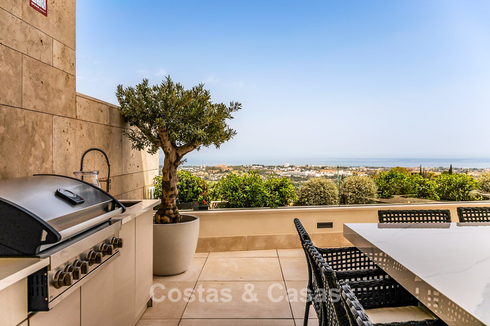 Spacious villa-style apartment. Built to high standards in a timeless, modern design. East/south/west facing. Remarkable panoramic views towards the Mediterranean Sea. Large terrace with outdoor kitchen, al fresco dining, chill-out area, and jacuzzi. Airy living space with an open-plan layout. Fully fitted bespoke kitchen with Gaggenau appliances and central island. Floor-to-ceiling glass sliding doors run the full length of the living area, seamlessly connecting to the outdoor space and garden. Practical laundry room with Miele appliances. Registered electric buggy with private parking space. 2 covered garage spaces included.