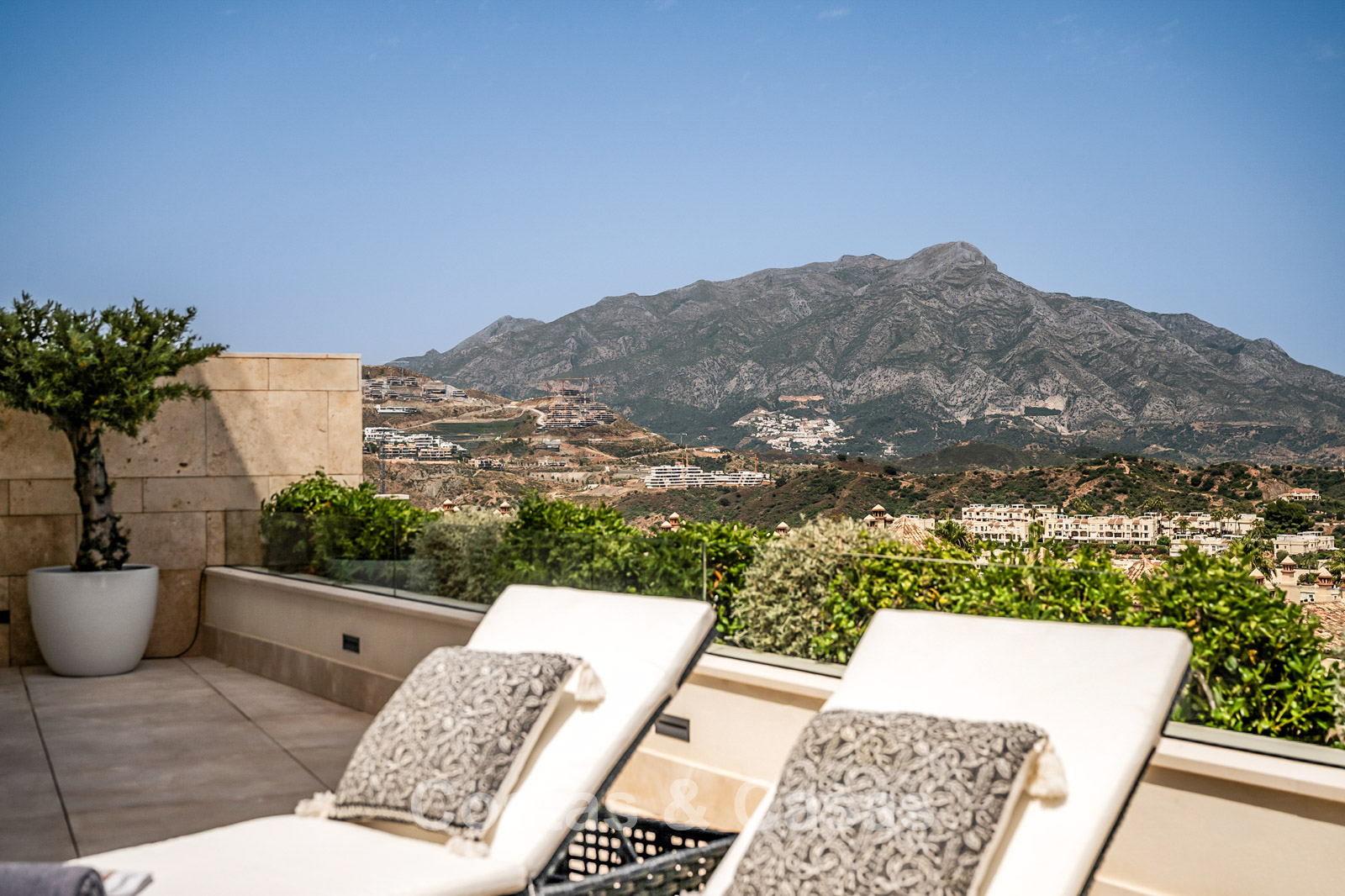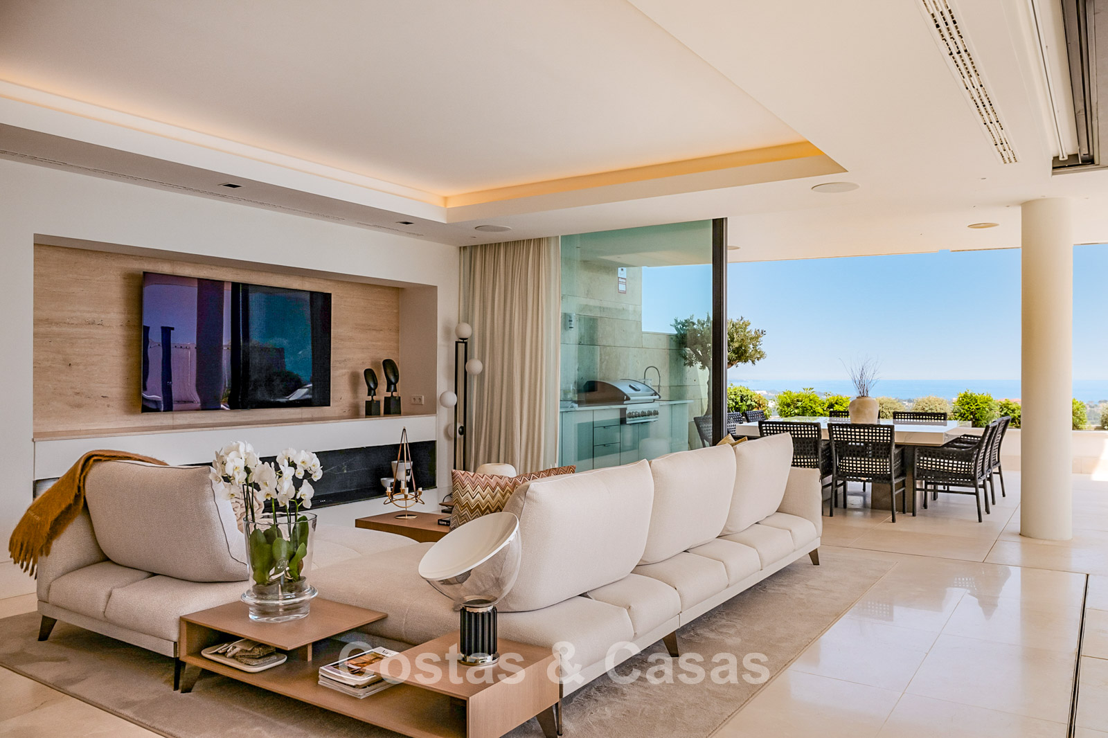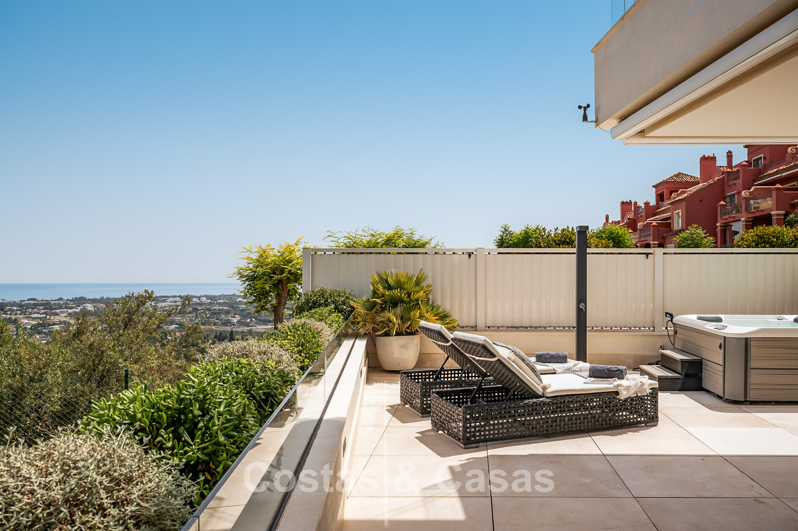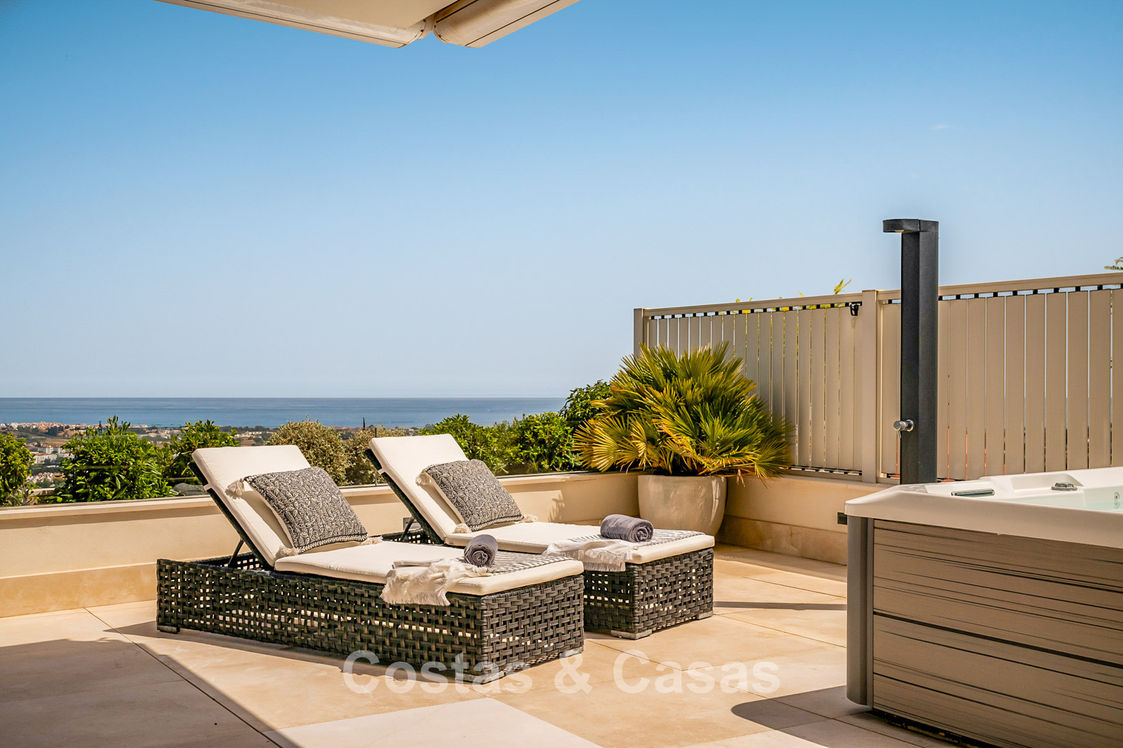 Spacious villa-style apartment. Built to high standards in a timeless, modern design. East/south/west facing. Remarkable panoramic views towards the Mediterranean Sea. Large terrace with outdoor kitchen, al fresco dining, chill-out area, and jacuzzi. Airy living space with an open-plan layout. Fully fitted bespoke kitchen with Gaggenau appliances and central island. Floor-to-ceiling glass sliding doors run the full length of the living area, seamlessly connecting to the outdoor space and garden. Practical laundry room with Miele appliances. Registered electric buggy with private parking space. 2 covered garage spaces included.