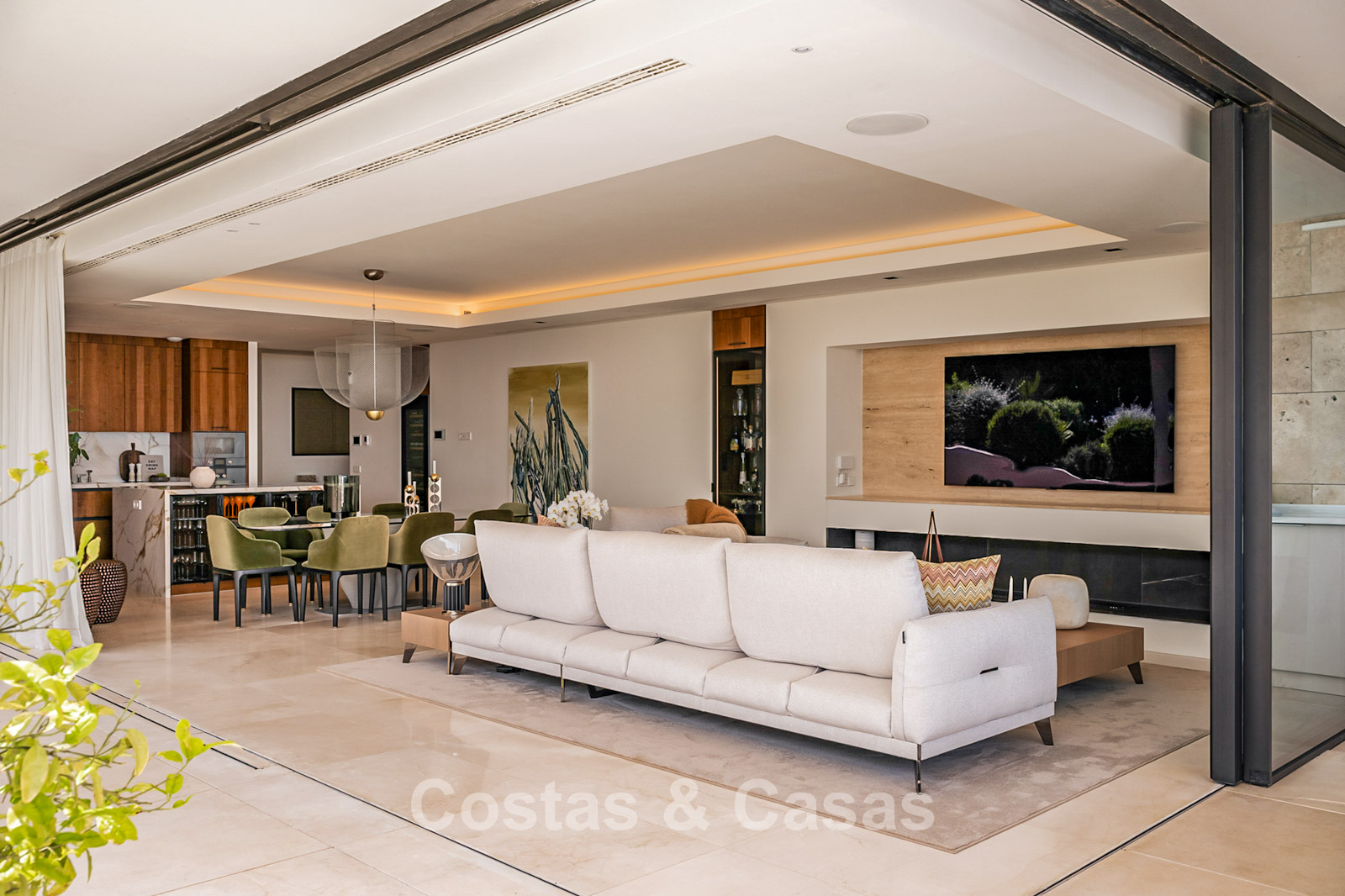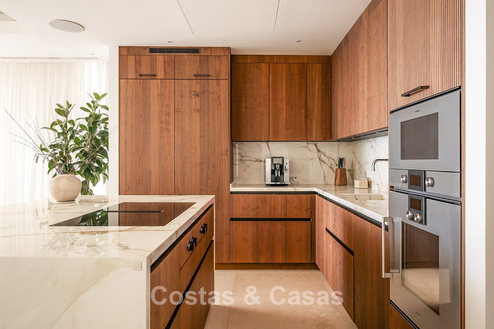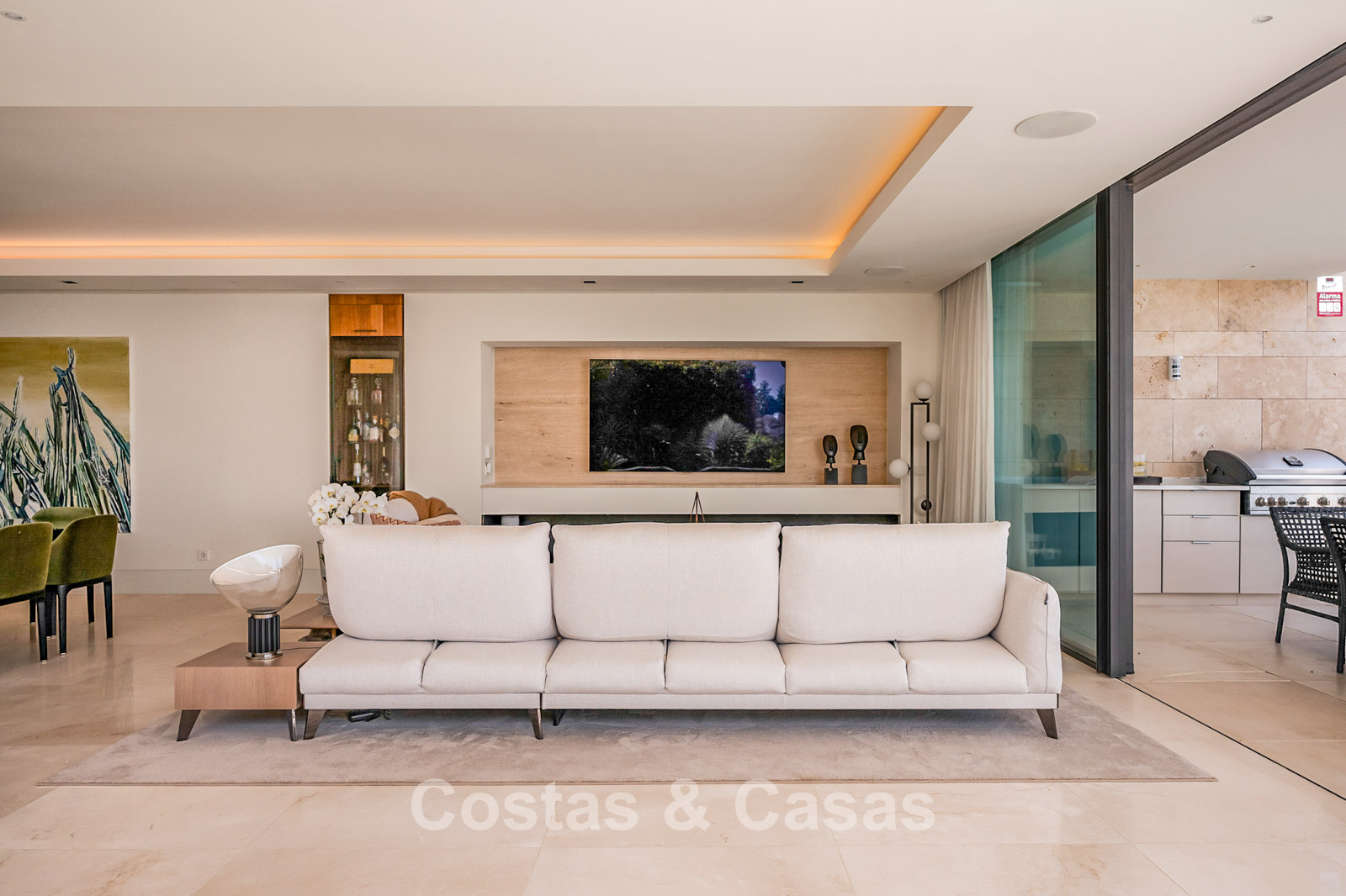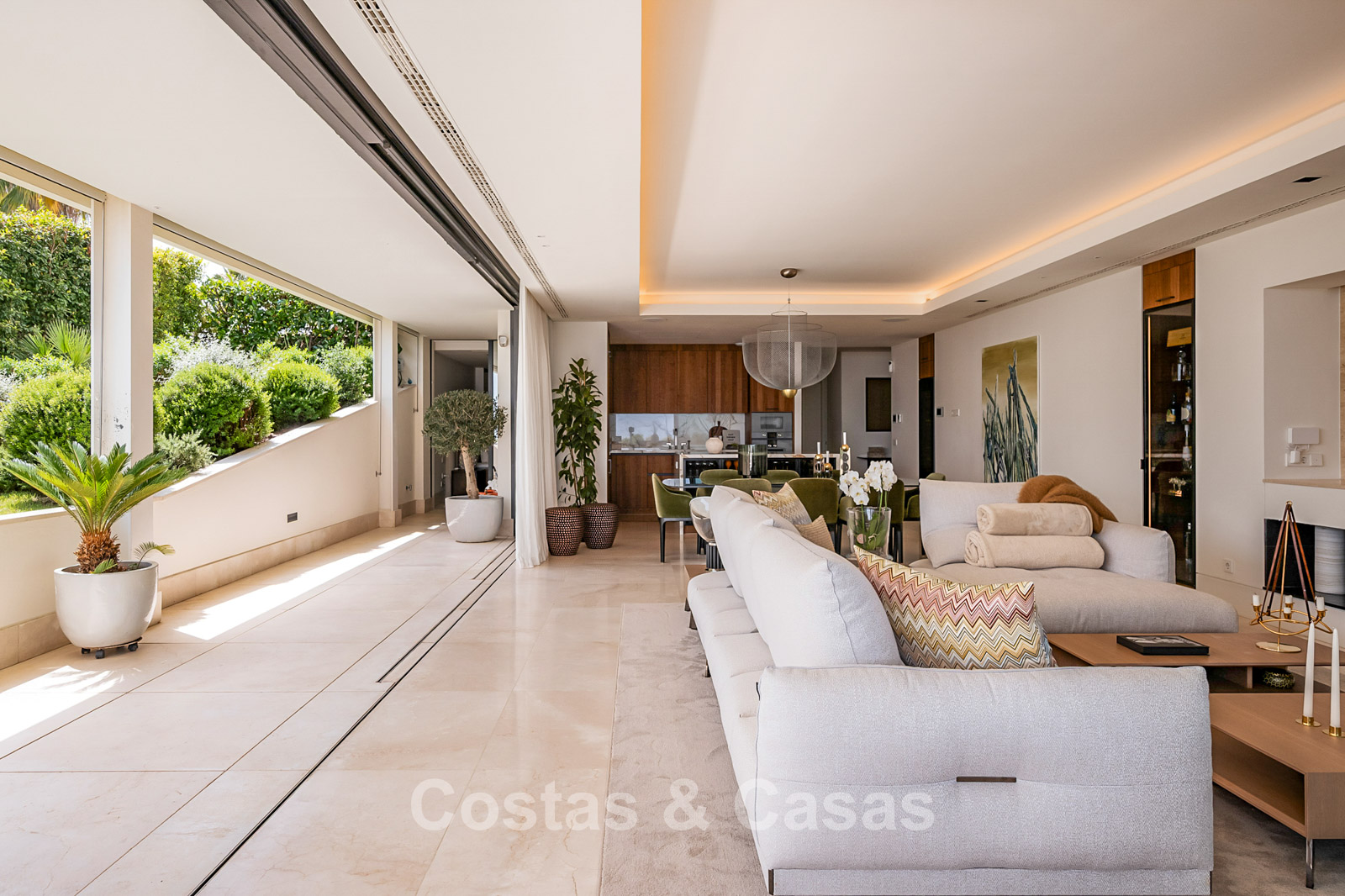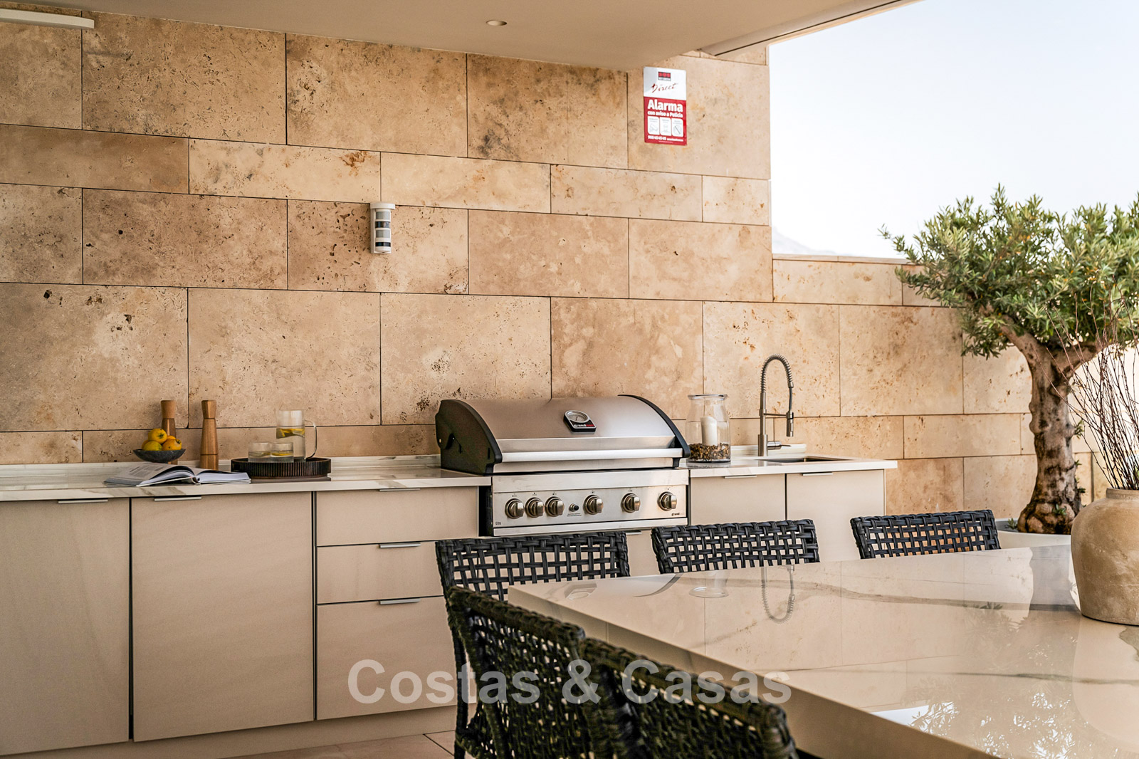 Spacious villa-style apartment. Built to high standards in a timeless, modern design. East/south/west facing. Remarkable panoramic views towards the Mediterranean Sea. Large terrace with outdoor kitchen, al fresco dining, chill-out area, and jacuzzi. Airy living space with an open-plan layout. Fully fitted bespoke kitchen with Gaggenau appliances and central island. Floor-to-ceiling glass sliding doors run the full length of the living area, seamlessly connecting to the outdoor space and garden. Practical laundry room with Miele appliances. Registered electric buggy with private parking space. 2 covered garage spaces included.