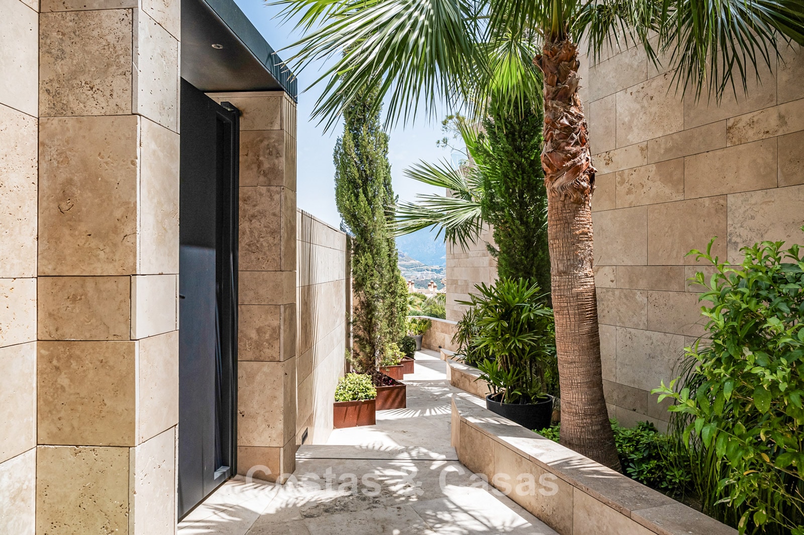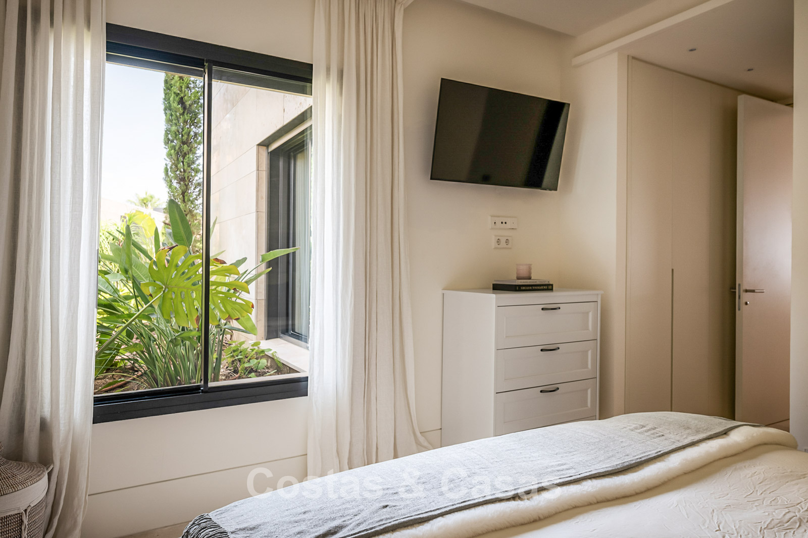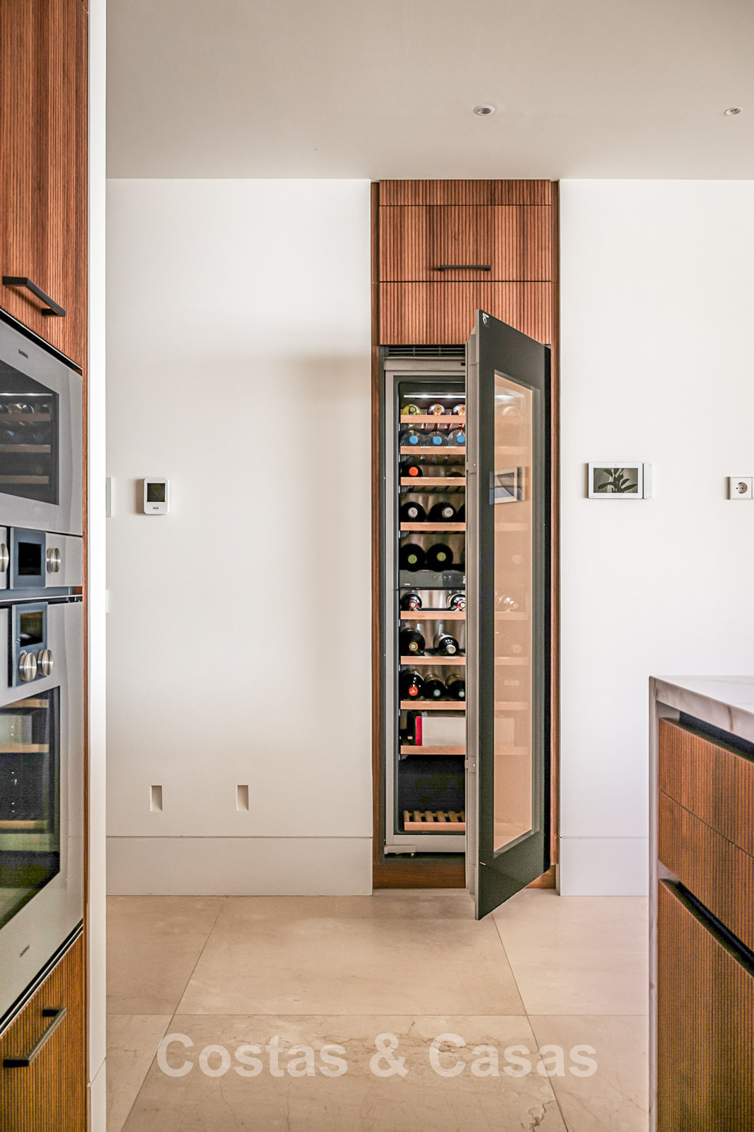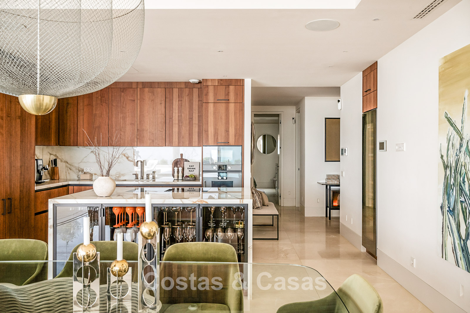Spacious villa-style apartment. Built to high standards in a timeless, modern design. East/south/west facing. Remarkable panoramic views towards the Mediterranean Sea. Large terrace with outdoor kitchen, al fresco dining, chill-out area, and jacuzzi. Airy living space with an open-plan layout. Fully fitted bespoke kitchen with Gaggenau appliances and central island. Floor-to-ceiling glass sliding doors run the full length of the living area, seamlessly connecting to the outdoor space and garden. Practical laundry room with Miele appliances. Registered electric buggy with private parking space. 2 covered garage spaces included.