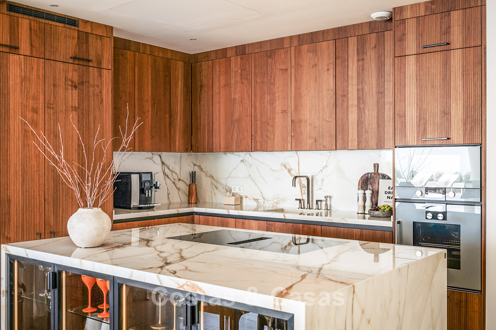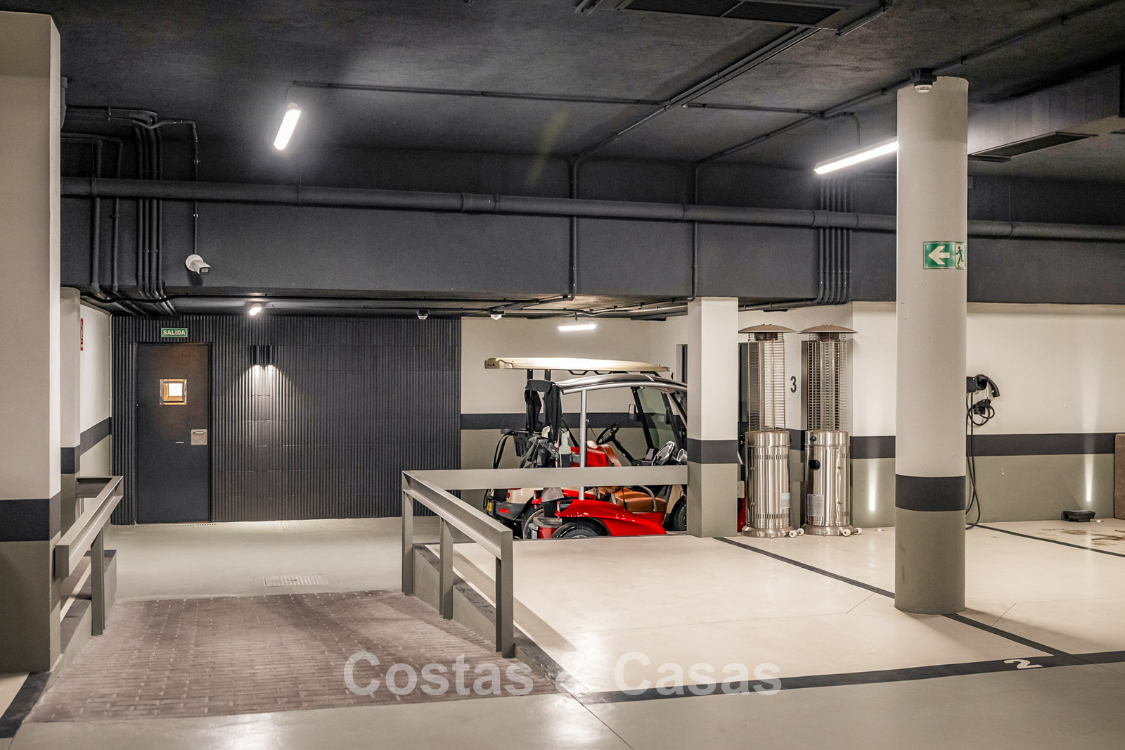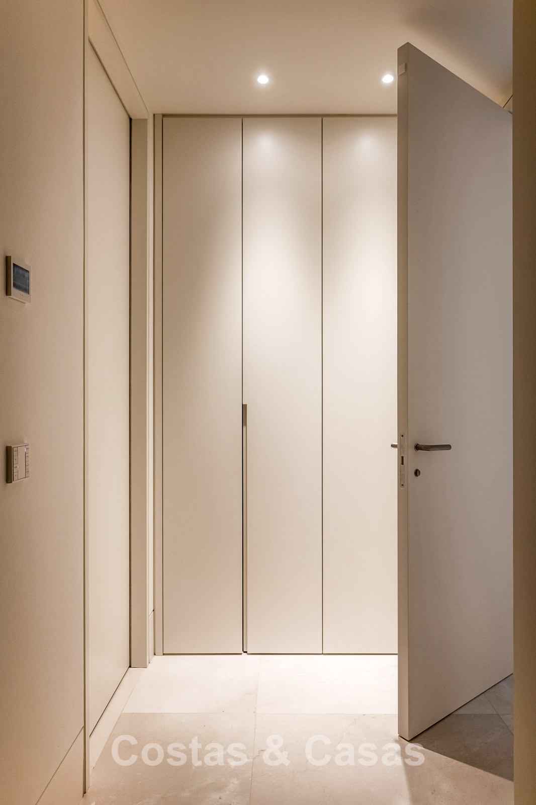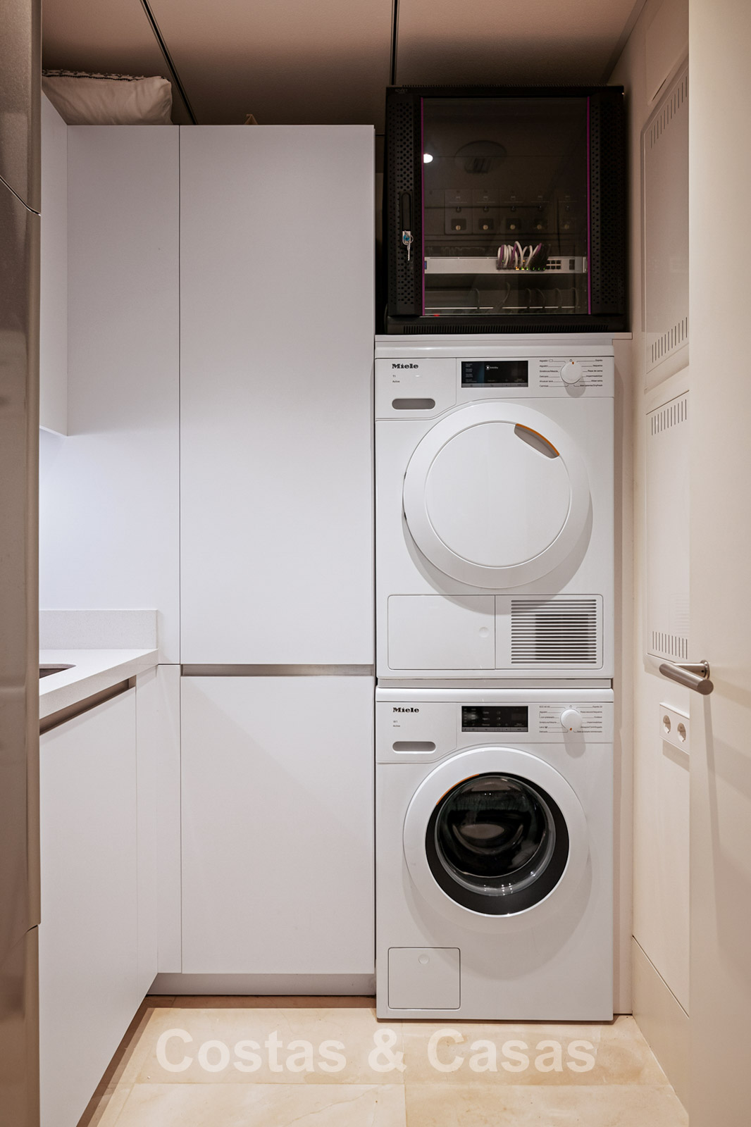 Spacious villa-style apartment. Built to high standards in a timeless, modern design. East/south/west facing. Remarkable panoramic views towards the Mediterranean Sea. Large terrace with outdoor kitchen, al fresco dining, chill-out area, and jacuzzi. Airy living space with an open-plan layout. Fully fitted bespoke kitchen with Gaggenau appliances and central island. Floor-to-ceiling glass sliding doors run the full length of the living area, seamlessly connecting to the outdoor space and garden. Practical laundry room with Miele appliances. Registered electric buggy with private parking space. 2 covered garage spaces included.