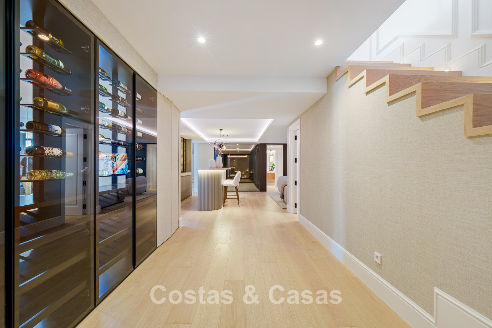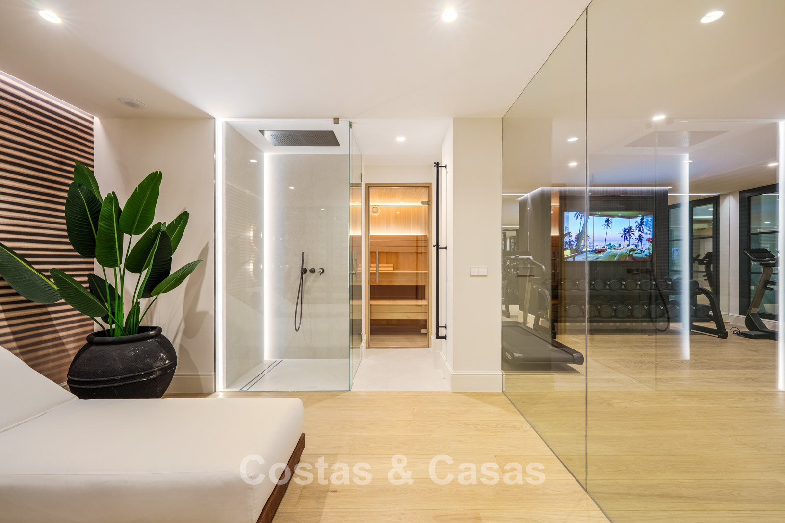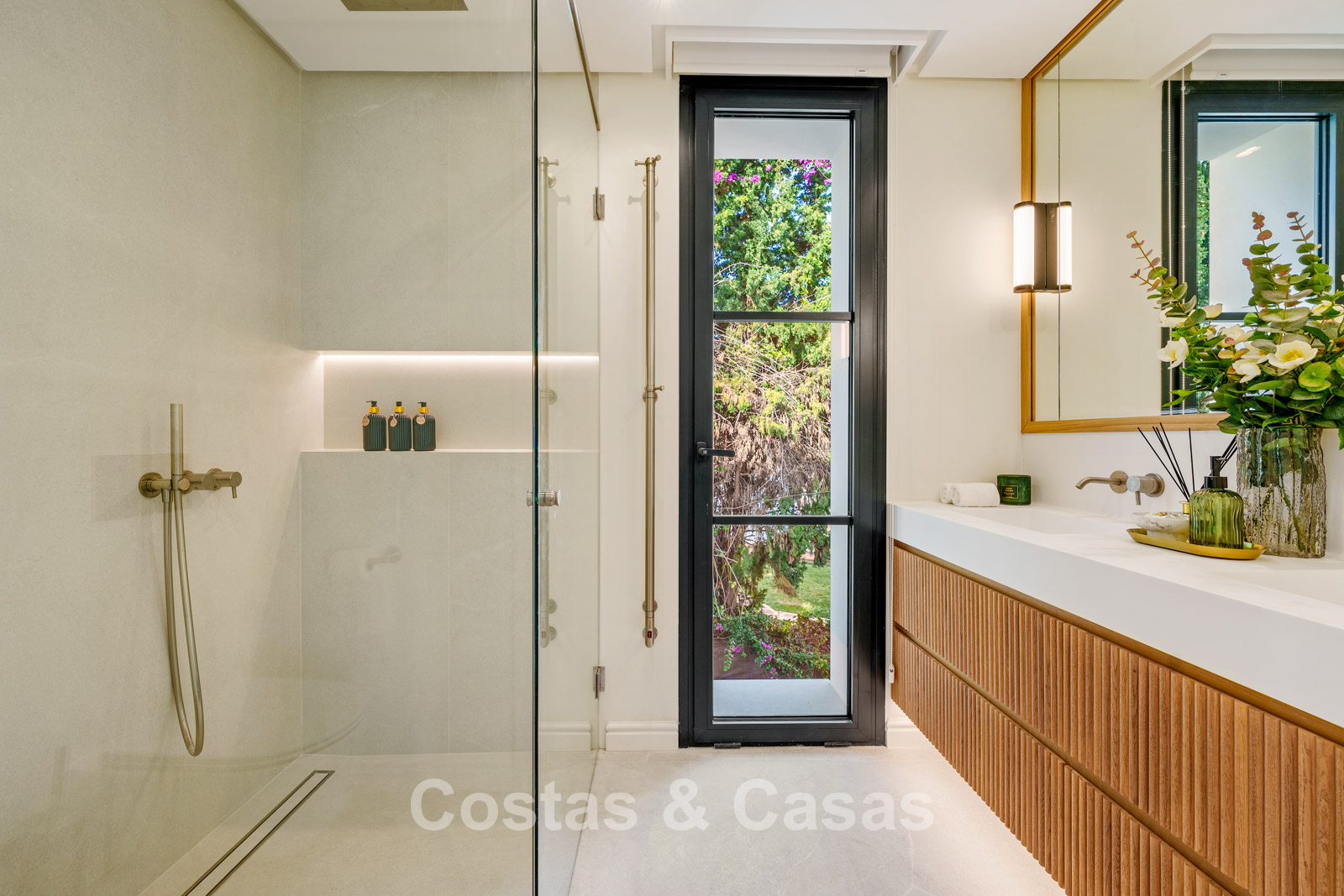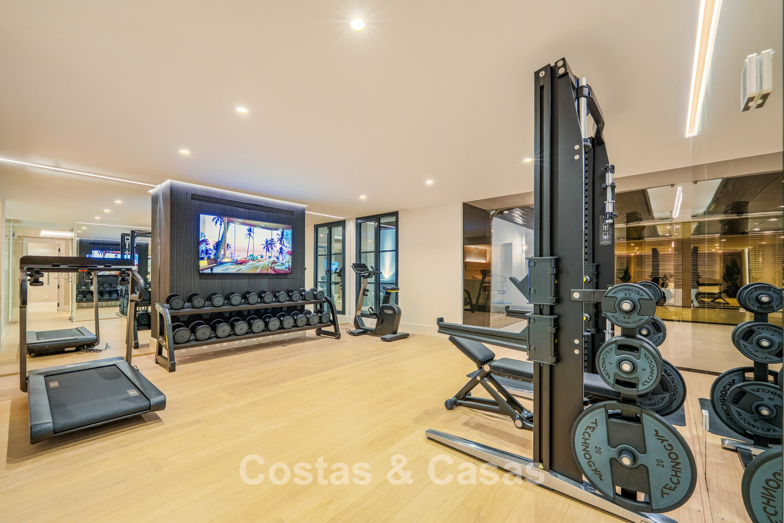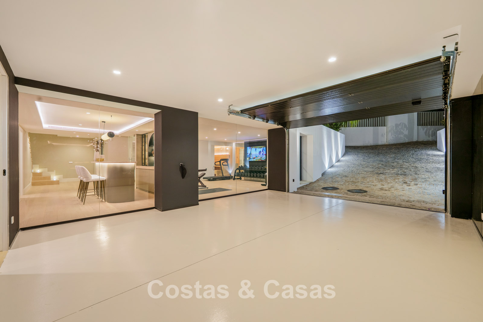 Detached villa with modern-Mediterranean architecture. Stylishly renovated using top-quality materials and premium brands. Comfortable open layout with a bright interior. Floor-to-ceiling sliding windows with sunken profiles flood the interior with natural light and create a seamless connection between indoors and outdoors. Cozy TV lounge with a fireplace. Integrated dining area. Open kitchen equipped with Gaggenau appliances, ample storage and a kitchen island that doubles as a breakfast area. 5 bedrooms, 5 bathrooms and 2 toilets. Office space. Atmospheric basement level with a TV lounge by the fireplace and a bar, ideal for entertaining family and friends in comfort and style. Fully equipped gym, including a Finnish sauna and massage room. Fully equipped laundry room with Miele appliances. Technical room. Indoor garage for 2 cars. Additional carport.