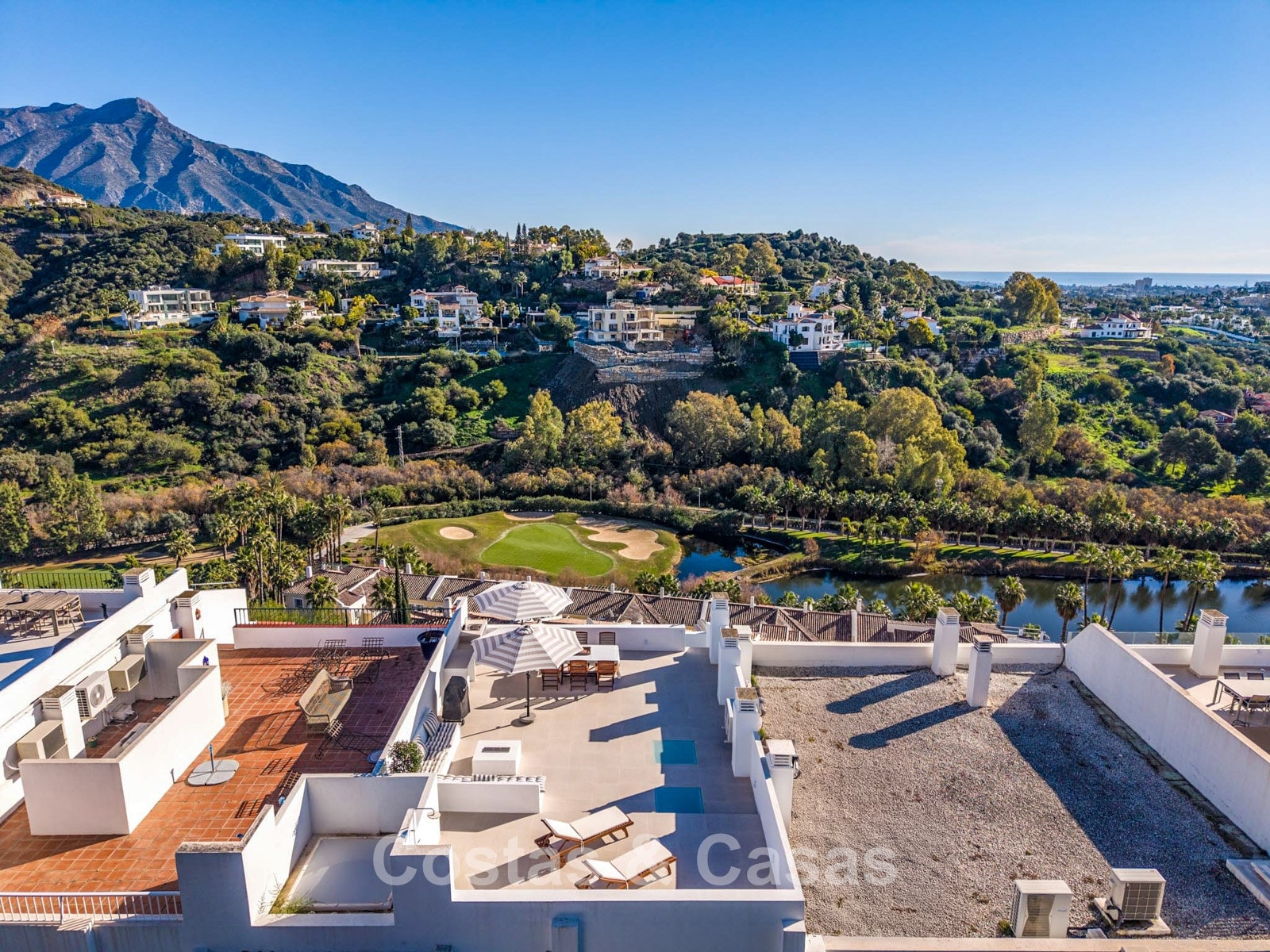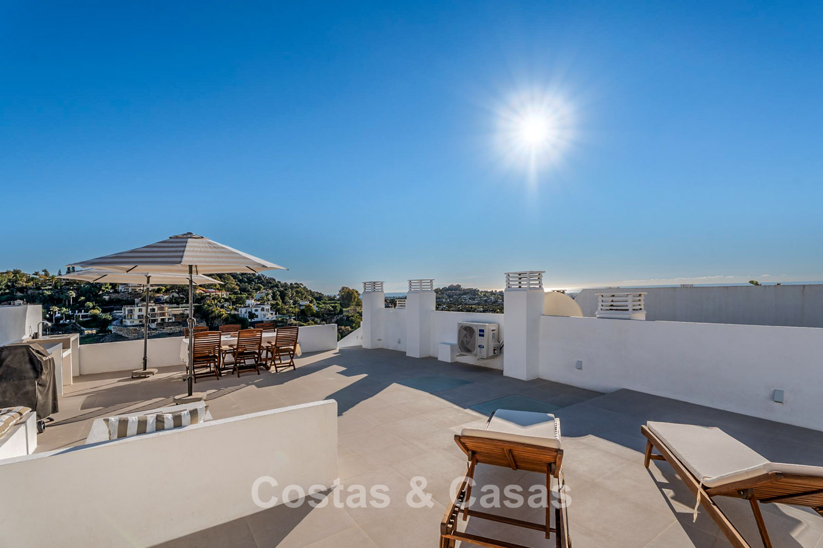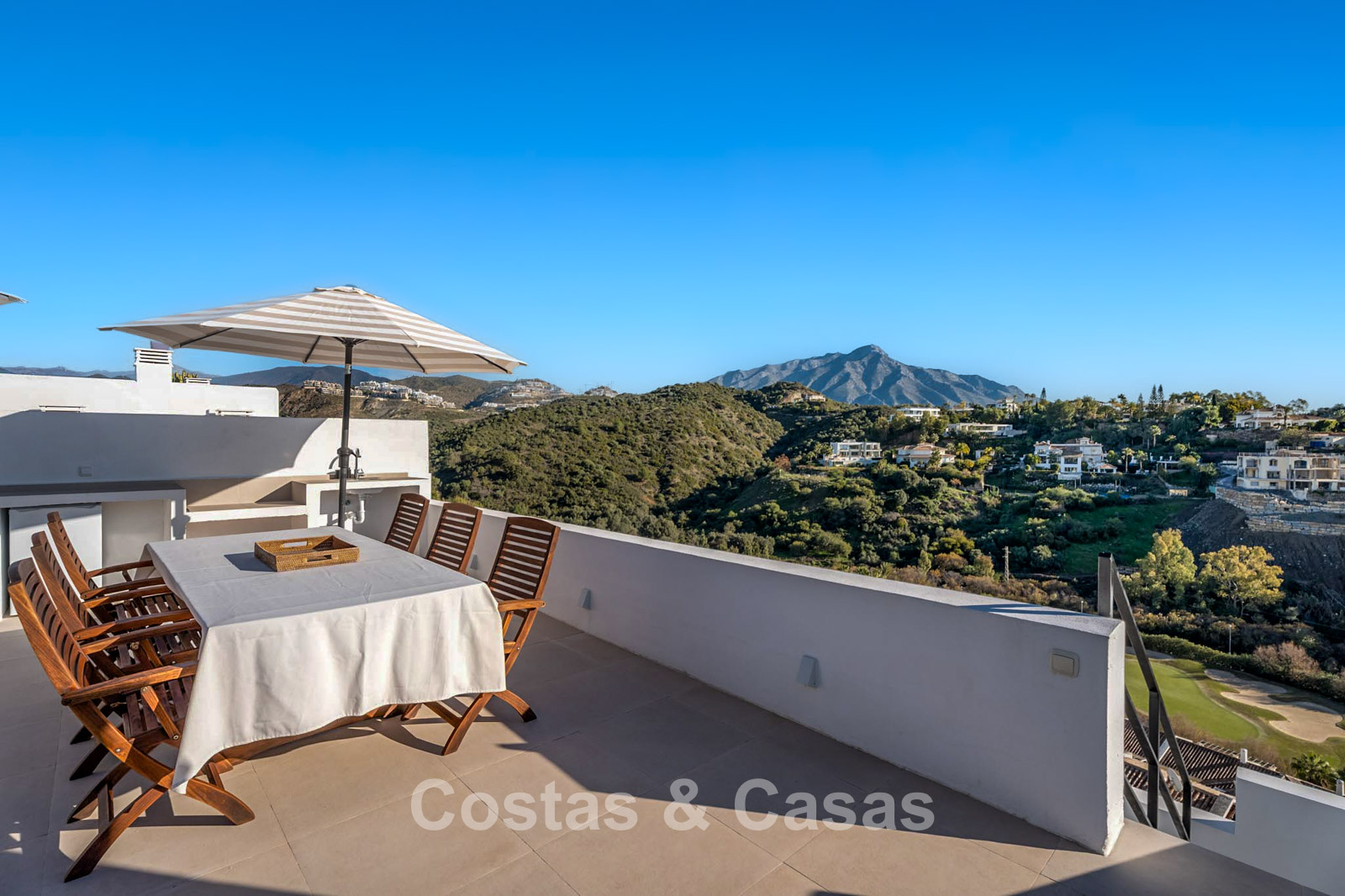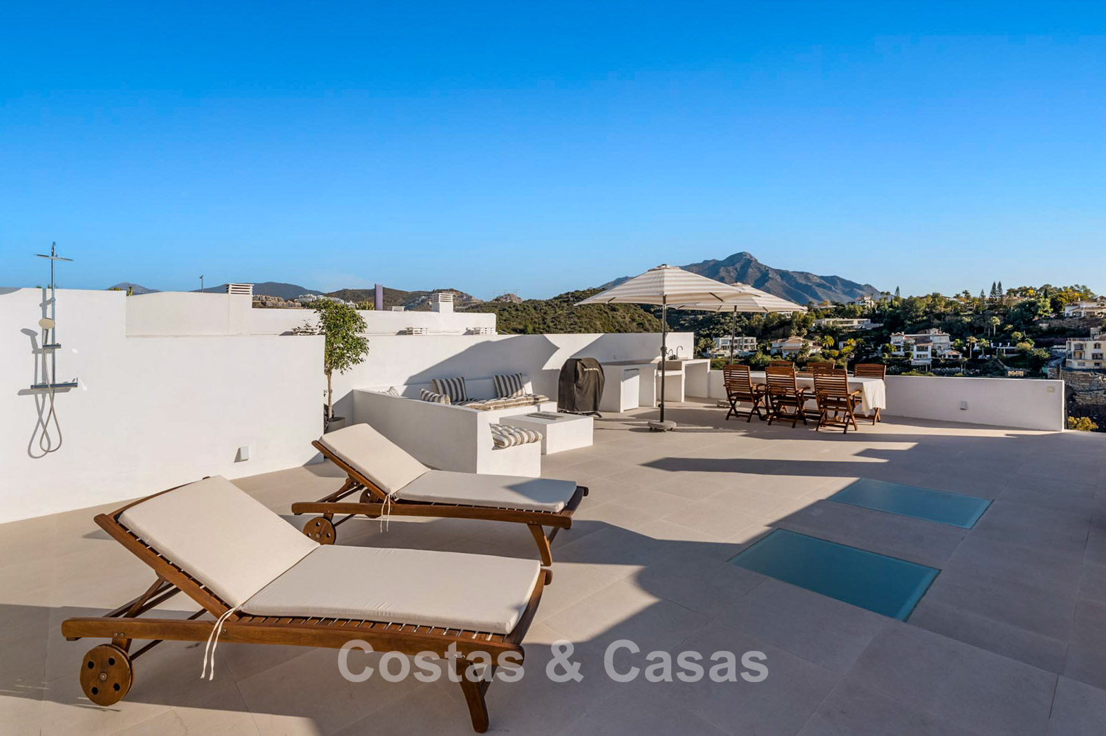 This impressive duplex penthouse was completely renovated in 2025. Thanks to its south to south-east orientation, the property enjoys abundant natural light throughout the day. The views are truly spectacular, encompassing the sea, lush golf courses, a picturesque lake and the iconic La Concha mountain. One of the absolute highlights is the private rooftop terrace, featuring an ethanol fireplace, several lounge and dining areas, pre-installation for an outdoor kitchen and an outdoor shower. Large floor-to-ceiling windows create a seamless connection between indoor and outdoor living. The bright living area features an open-plan layout with clean lines and a calm, natural aesthetic. The modern open kitchen forms the heart of the home and includes a central island and high-end Italian appliances. There are three bedrooms, including a master suite with its own en-suite bathroom. The bathrooms benefit from natural skylights, providing extra ventilation and daylight. A practical additional storage room is located on the terrace level. Covered parking space included.