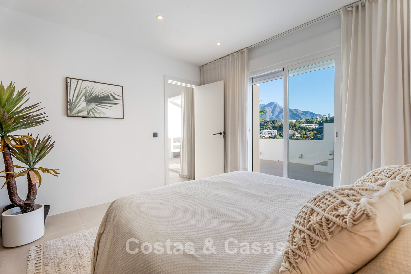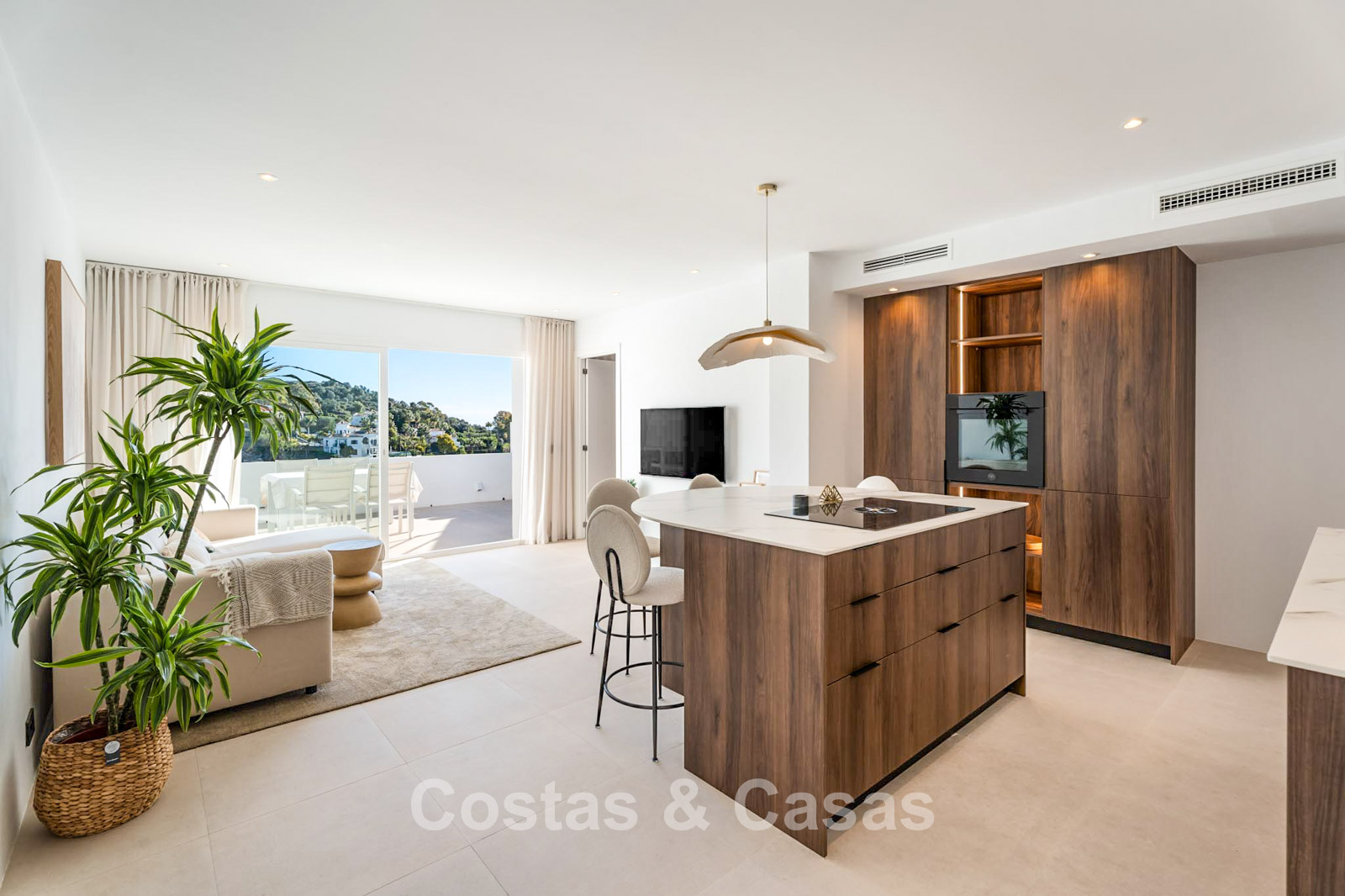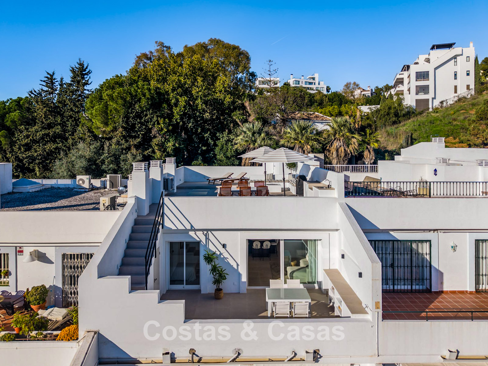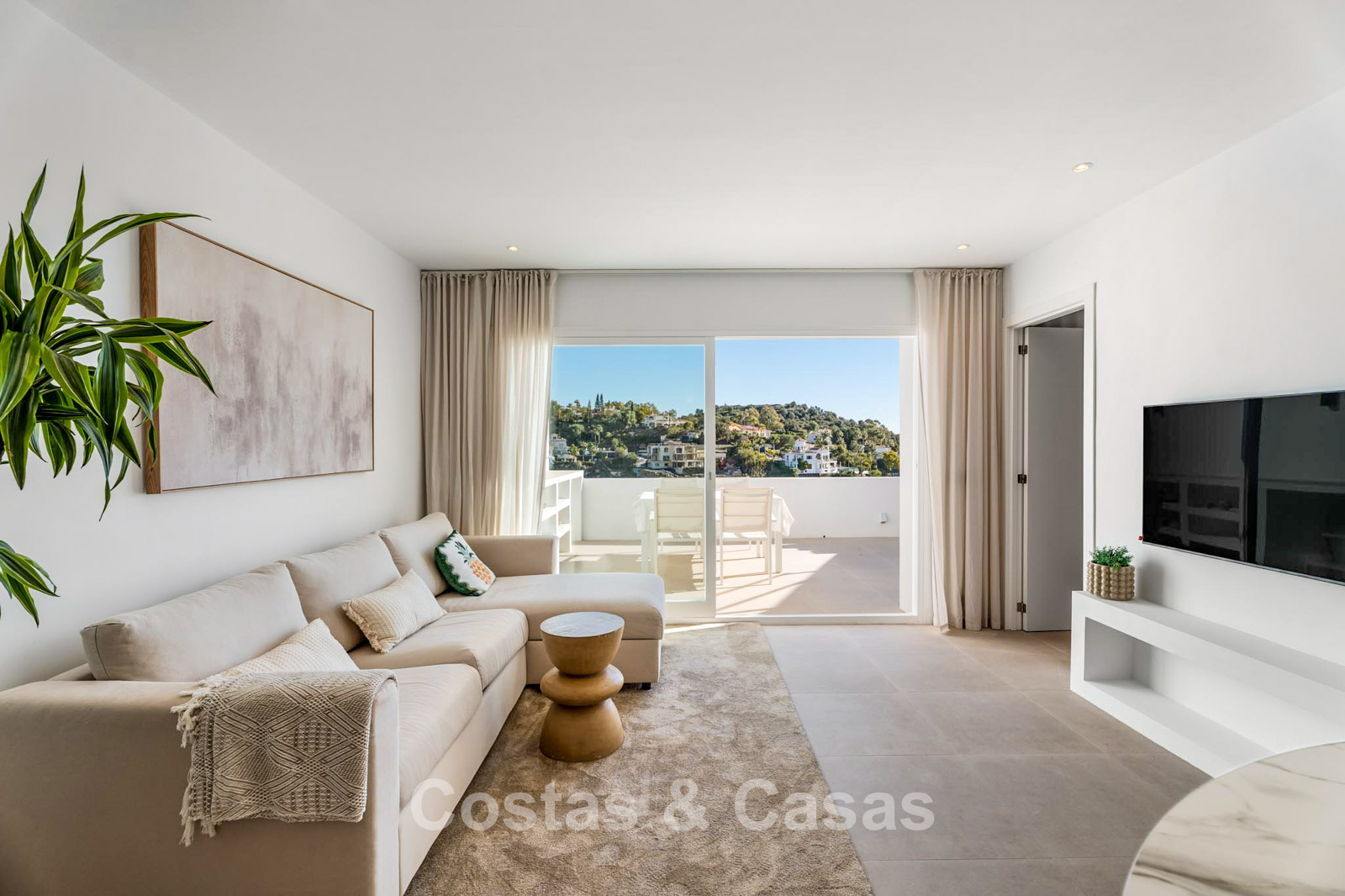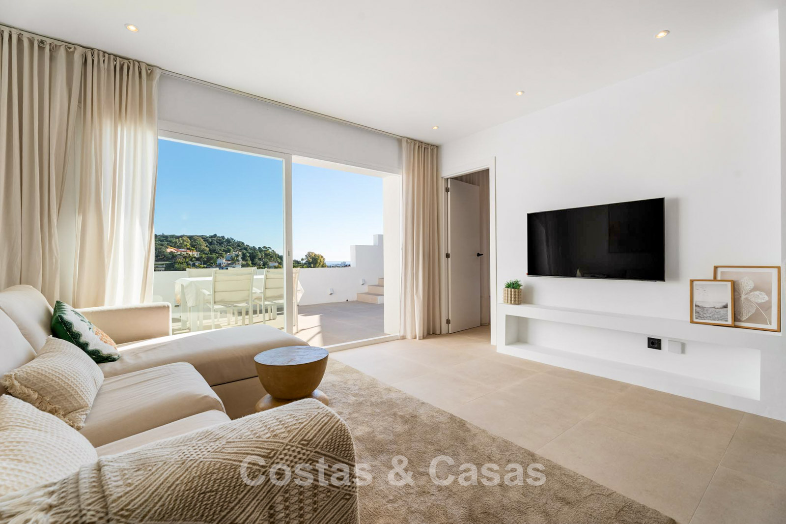 This impressive duplex penthouse was completely renovated in 2025. Thanks to its south to south-east orientation, the property enjoys abundant natural light throughout the day. The views are truly spectacular, encompassing the sea, lush golf courses, a picturesque lake and the iconic La Concha mountain. One of the absolute highlights is the private rooftop terrace, featuring an ethanol fireplace, several lounge and dining areas, pre-installation for an outdoor kitchen and an outdoor shower. Large floor-to-ceiling windows create a seamless connection between indoor and outdoor living. The bright living area features an open-plan layout with clean lines and a calm, natural aesthetic. The modern open kitchen forms the heart of the home and includes a central island and high-end Italian appliances. There are three bedrooms, including a master suite with its own en-suite bathroom. The bathrooms benefit from natural skylights, providing extra ventilation and daylight. A practical additional storage room is located on the terrace level. Covered parking space included.