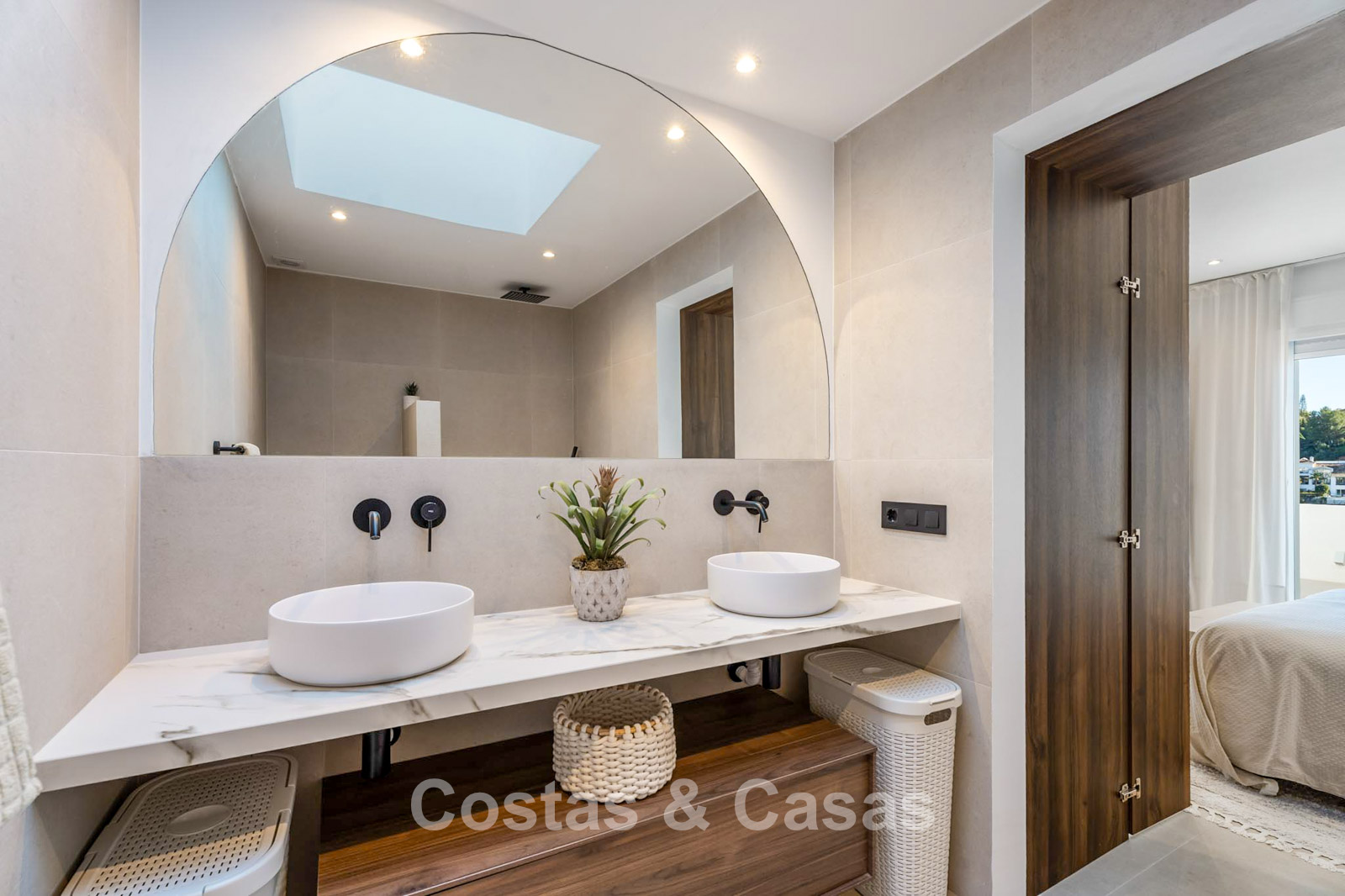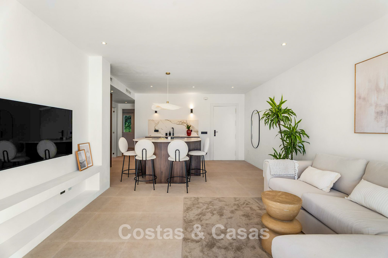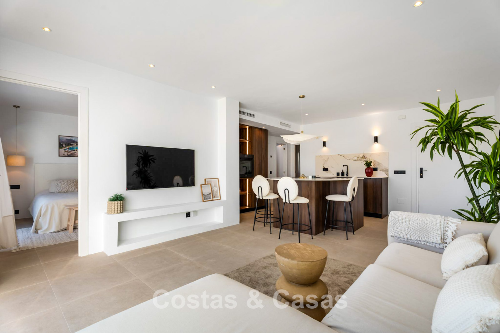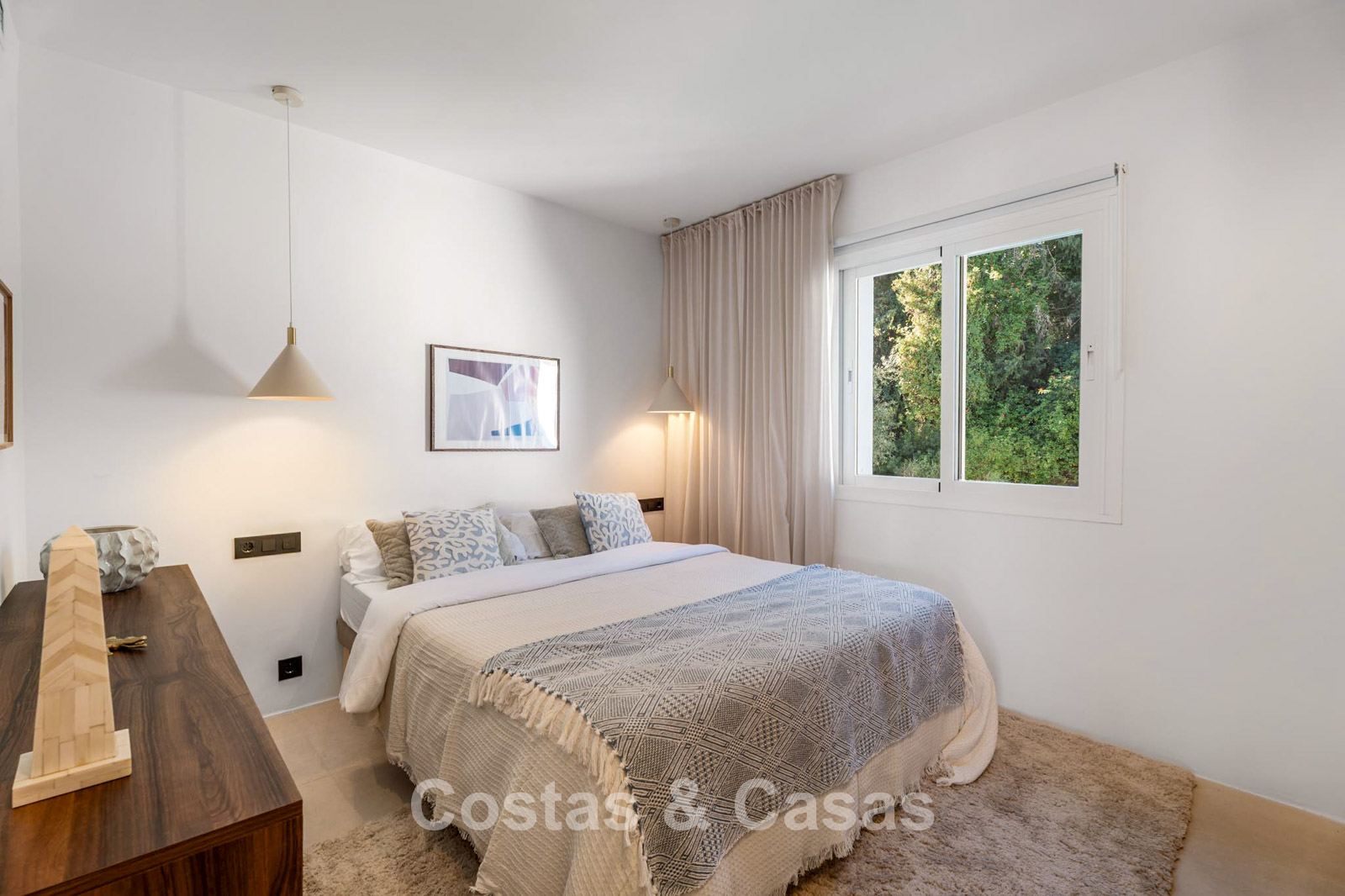 This impressive duplex penthouse was completely renovated in 2025. Thanks to its south to south-east orientation, the property enjoys abundant natural light throughout the day. The views are truly spectacular, encompassing the sea, lush golf courses, a picturesque lake and the iconic La Concha mountain. One of the absolute highlights is the private rooftop terrace, featuring an ethanol fireplace, several lounge and dining areas, pre-installation for an outdoor kitchen and an outdoor shower. Large floor-to-ceiling windows create a seamless connection between indoor and outdoor living. The bright living area features an open-plan layout with clean lines and a calm, natural aesthetic. The modern open kitchen forms the heart of the home and includes a central island and high-end Italian appliances. There are three bedrooms, including a master suite with its own en-suite bathroom. The bathrooms benefit from natural skylights, providing extra ventilation and daylight. A practical additional storage room is located on the terrace level. Covered parking space included.